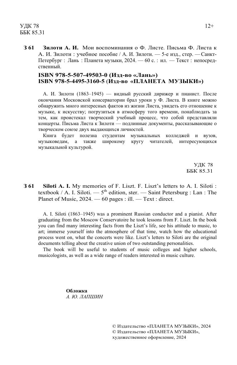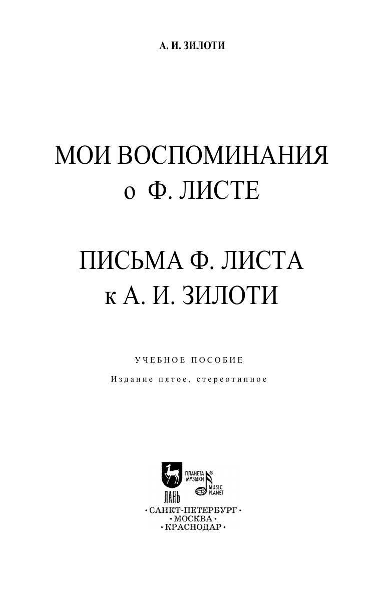 А.И.Зилоти (1863–1945) – видный русский дирижер и пианист. После окончания Московской консерватории брал уроки у Ф. Листа. В книге можно обнаружить много интересных фактов из жизни Листа, увидеть его отношение к музыке, к искусству, погрузиться в атмосферу того времени, понаблюдать за тем, как проистекал творческий учебный процесс, что собой представляли концерты. Письма Листа к Зилоти – подлинные документы, рассказывающие о творческом союзе двух выдающихся личностей. Книга будет полезна студентам музыкальных колледжей и вузов, музыковедам, а также широкому кругу читателей, интересующихся музыкальной культурой.