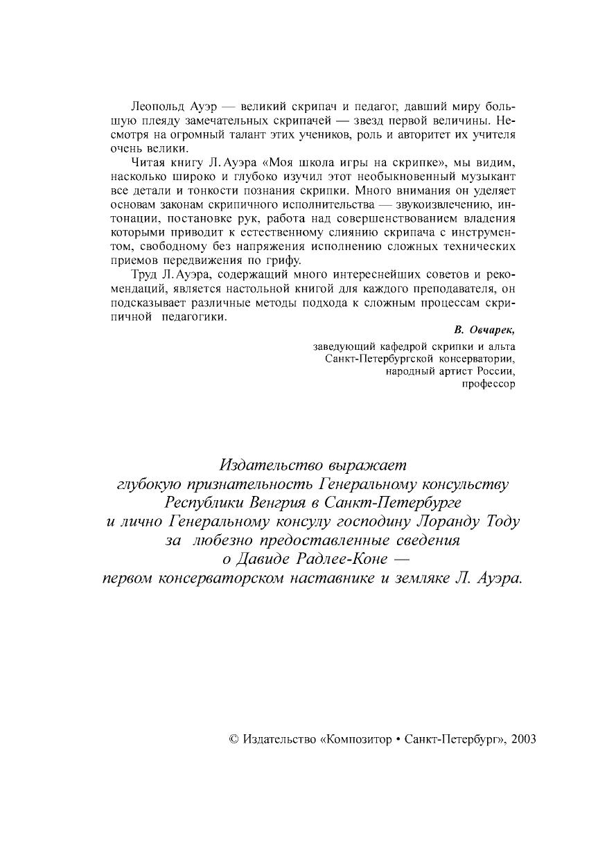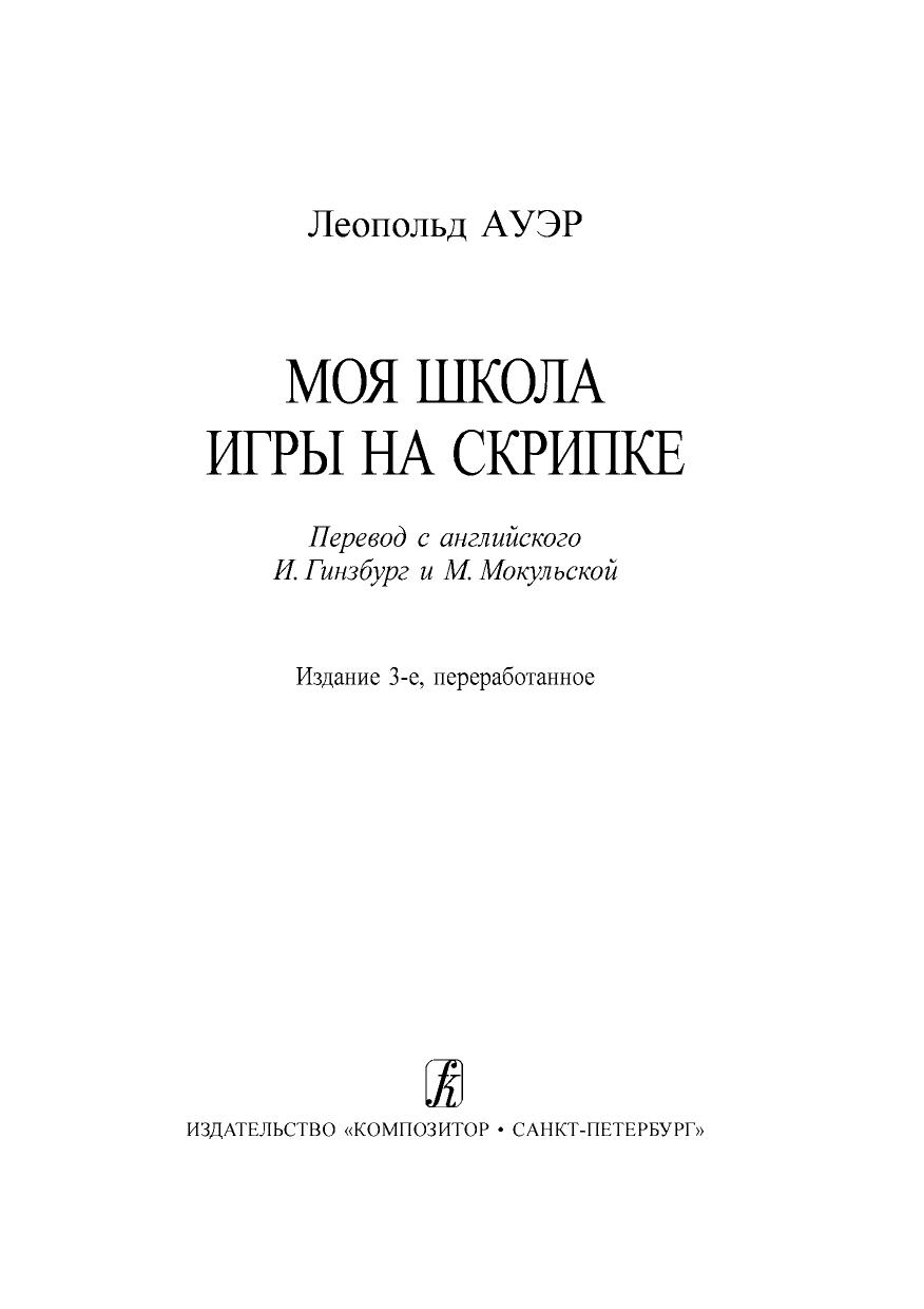 Леопольд Ауэр (1845–1930) — выдающийся скрипач-виртуоз и великий педагог, глава авторитетнейшей в мире петербургской скрипичной школы. Среди учеников Ауэра большинство величайших скрипачей ХХ века: Я. Хейфец, М. Эльман, Е. Цимбалист, М. Полякин, Н. Мильштейн, Ц. Ганзен, М. Пиастро, И. Ахрон. Класс Ауэра в Петербургской консерватории и его летняя школа-студия в Лондоне были центрами мирового скрипичного искусства, куда стекались скрипачи из многих стран мира. Именно Леопольду Ауэру в большой степени обязано скрипичное искусство прошлого столетия достижениями и новациями «русской школы». Книга Леопольда Ауэра «Моя школа игры на скрипке» адресована в первую очередь музыкантам-скрипачам, педагогам и учащимся. Однако и историки музыки, и просвещенные любители музыки найдут здесь для себя много интересного. Эта книга — одновременно и собрание бесценных практических советов, и исторический памятник.