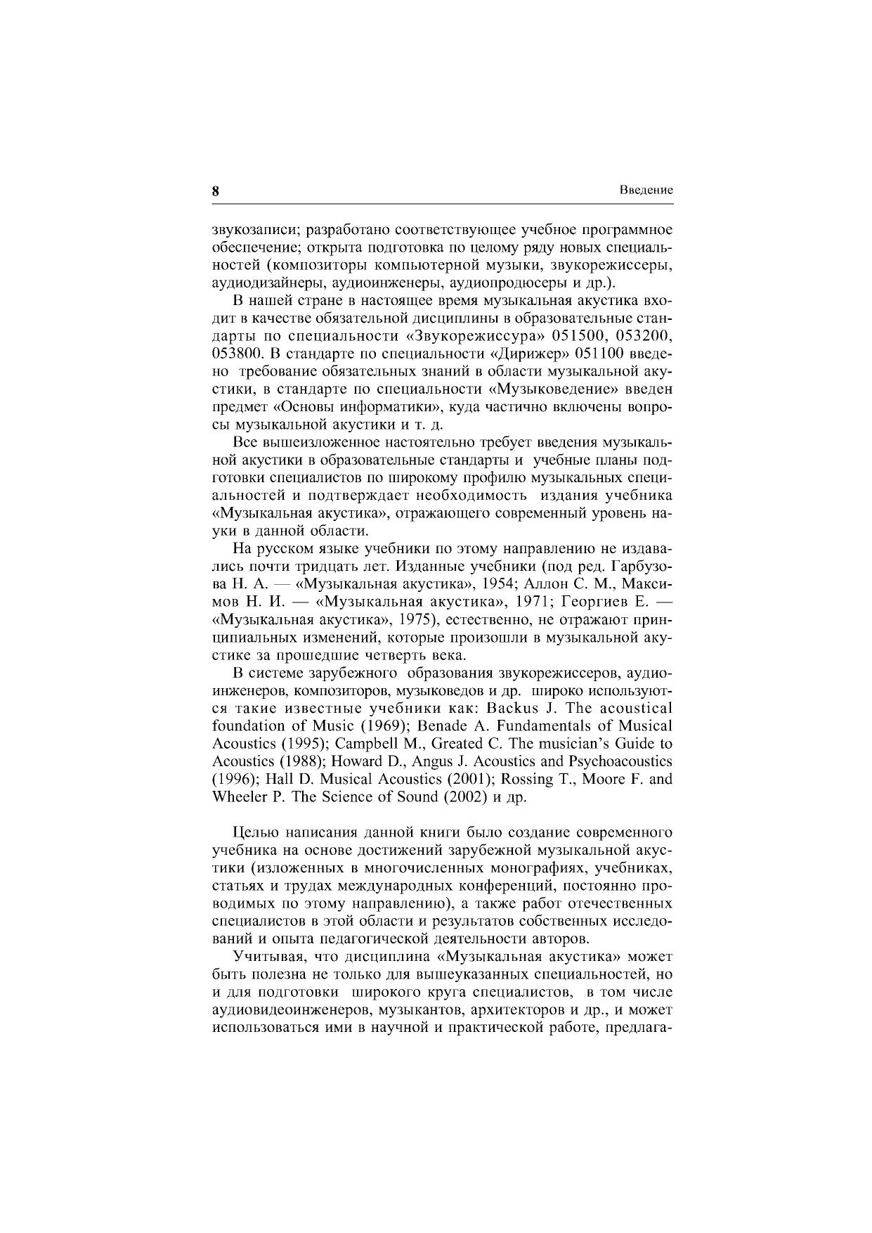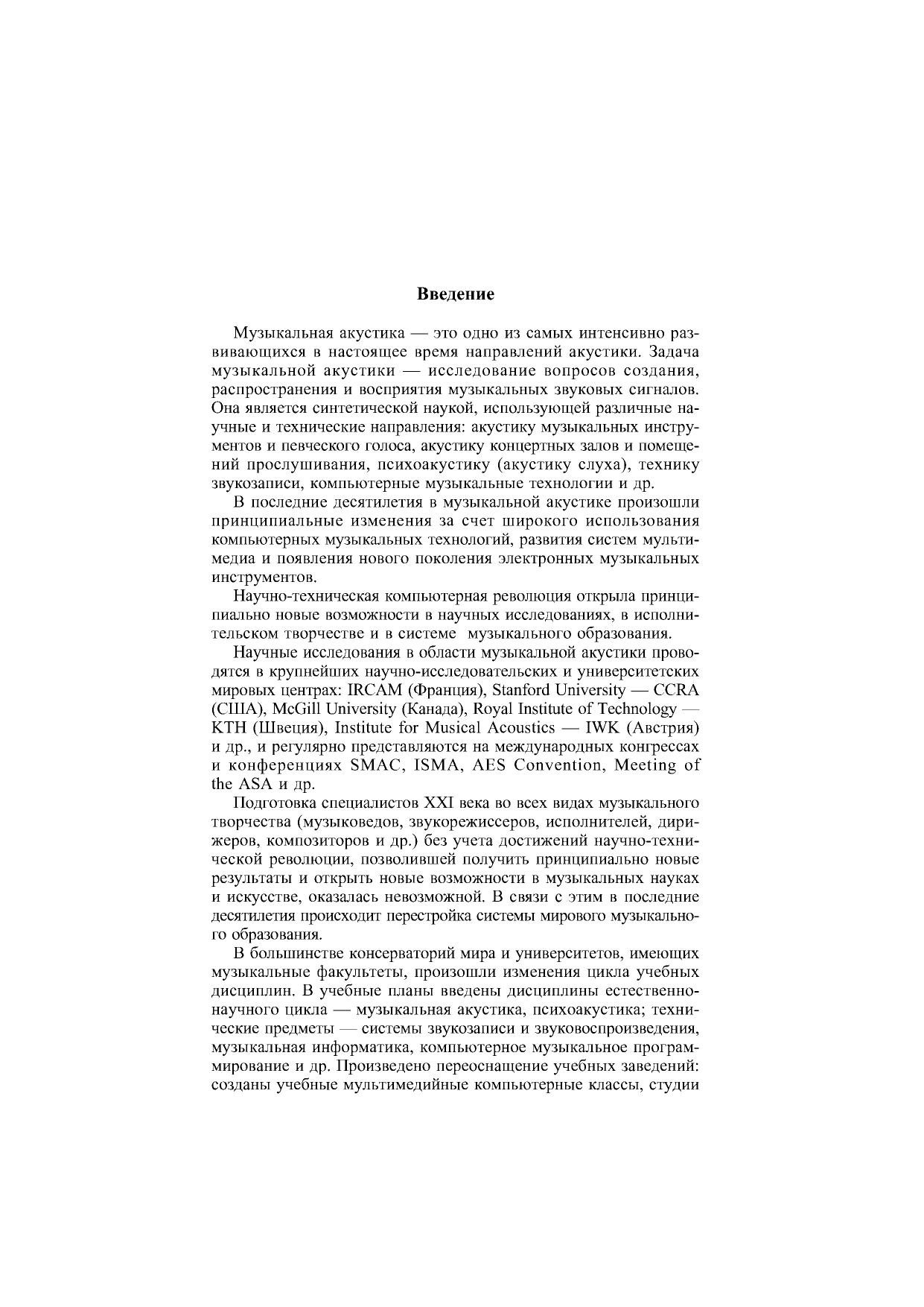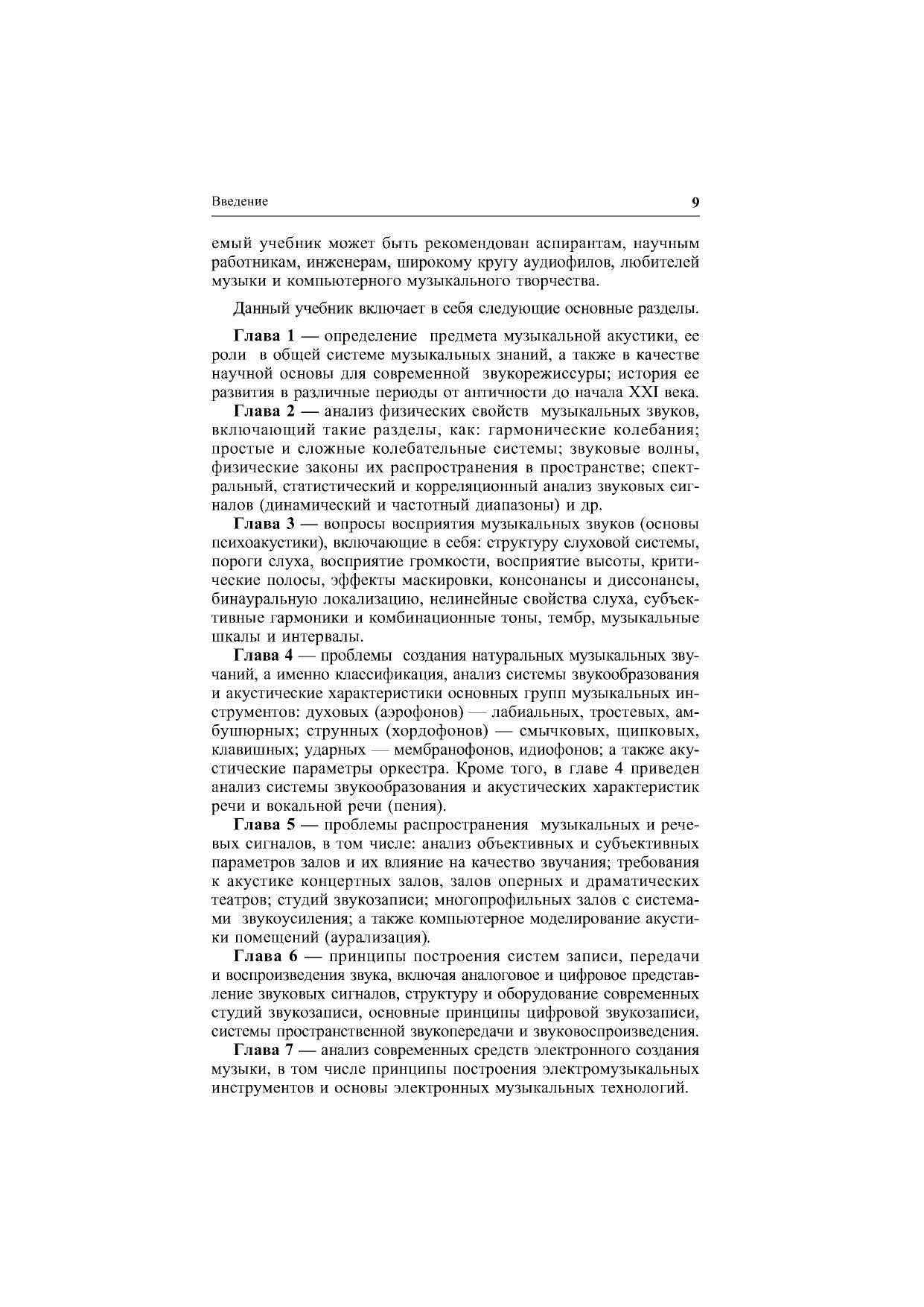 Настоящий учебник предназначен для студентов высших учебных заведений, специализирующихся в области подготовки звукорежиссеров, аудиоинженеров, композиторов, музыковедов и др., а также может быть рекомендован аспирантам, научным работникам и другим специалистам в области аудиотехники и компьютерного музыкального творчества. Учебник содержит информацию по следующим основным направлениям: предмет и история музыкальной акустики физика звука основы психоакустики акустика музыкальных инструментов и голоса акустика концертных залов и студий системы звукозаписи и звуковоспроизведения принципы построения электромузыкальных инструментов. Учебник снабжен большим количеством таблиц, схем, графиков и оснащен обширной библиографией ко всем рассмотренным темам.