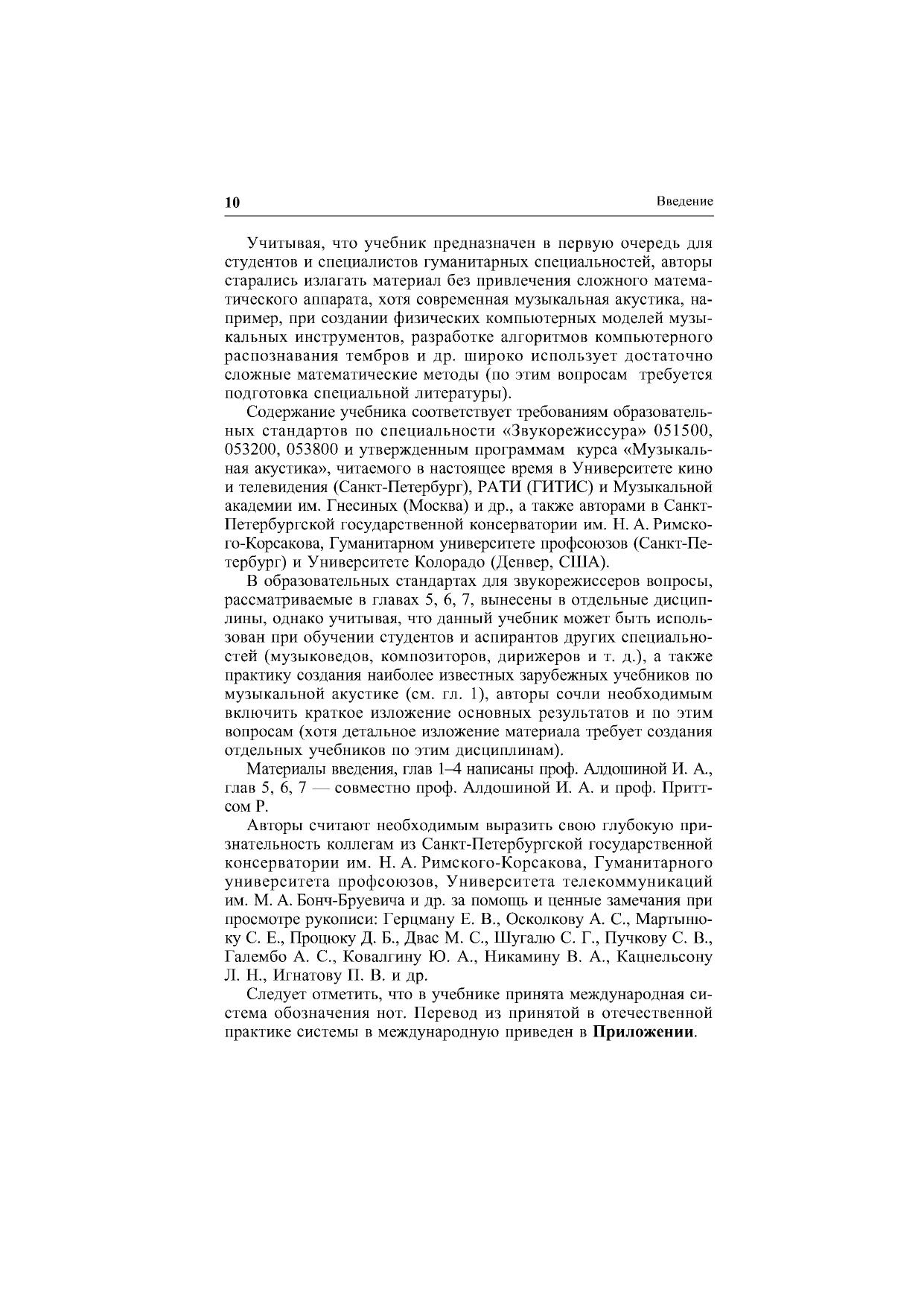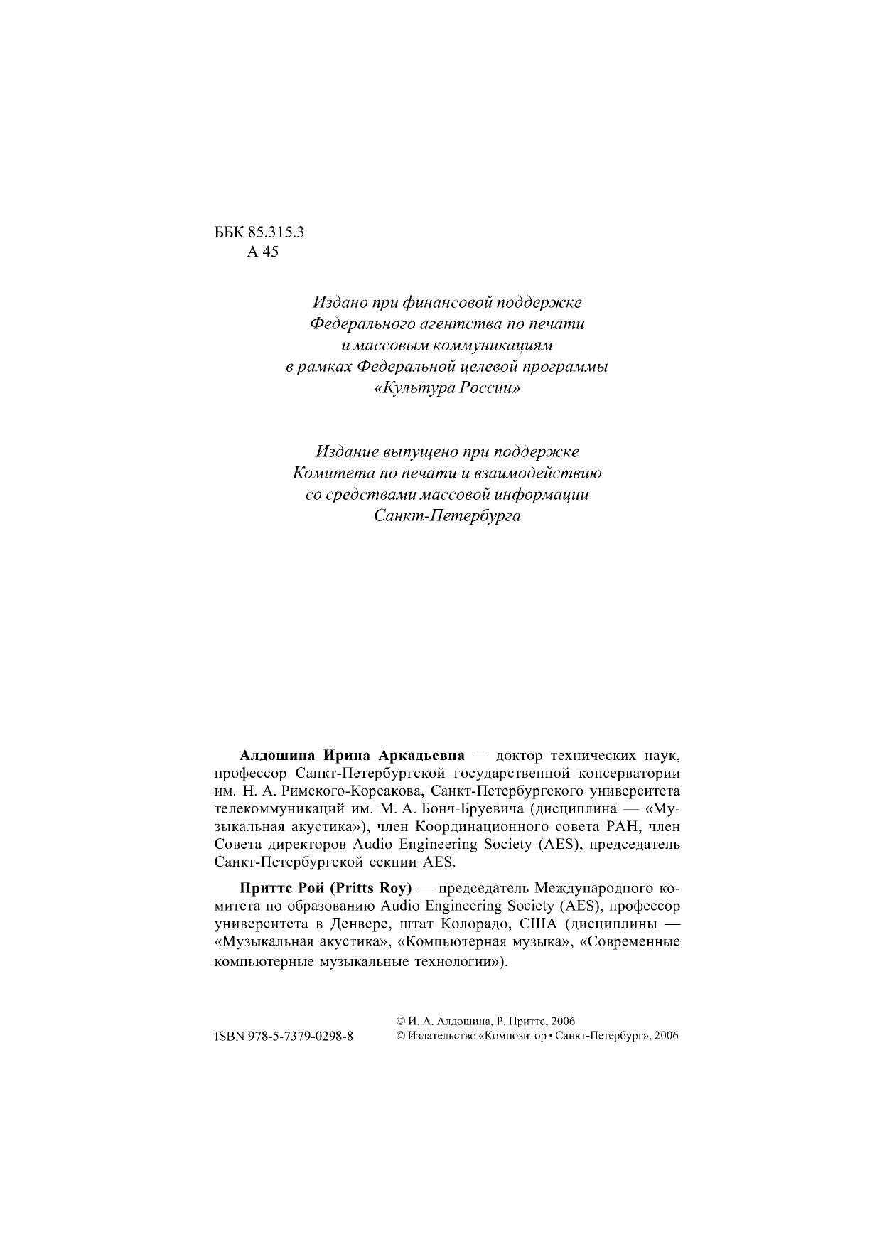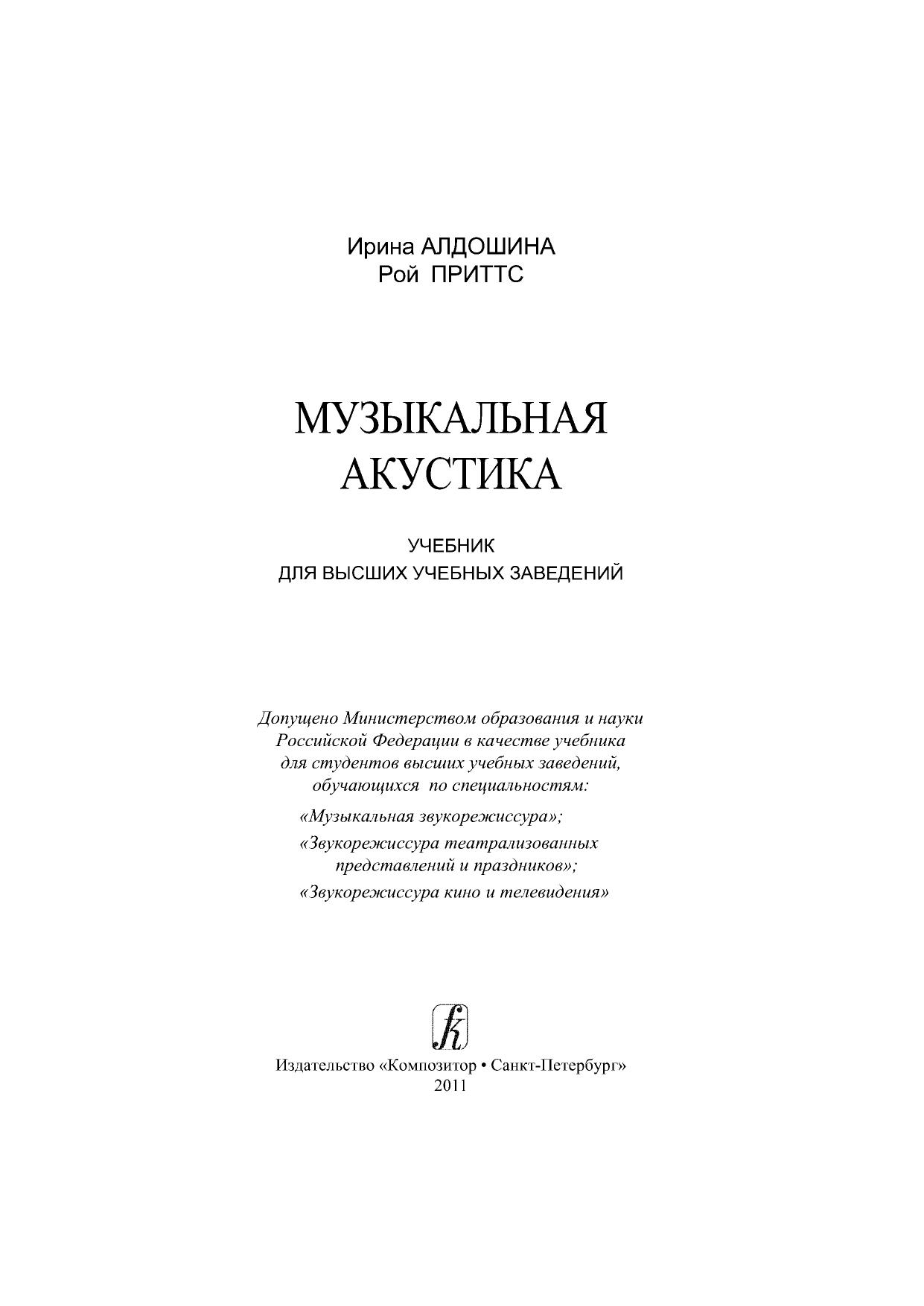 Настоящий учебник предназначен для студентов высших учебных заведений, специализирующихся в области подготовки звукорежиссеров, аудиоинженеров, композиторов, музыковедов и др., а также может быть рекомендован аспирантам, научным работникам и другим специалистам в области аудиотехники и компьютерного музыкального творчества. Учебник содержит информацию по следующим основным направлениям: предмет и история музыкальной акустики физика звука основы психоакустики акустика музыкальных инструментов и голоса акустика концертных залов и студий системы звукозаписи и звуковоспроизведения принципы построения электромузыкальных инструментов. Учебник снабжен большим количеством таблиц, схем, графиков и оснащен обширной библиографией ко всем рассмотренным темам.