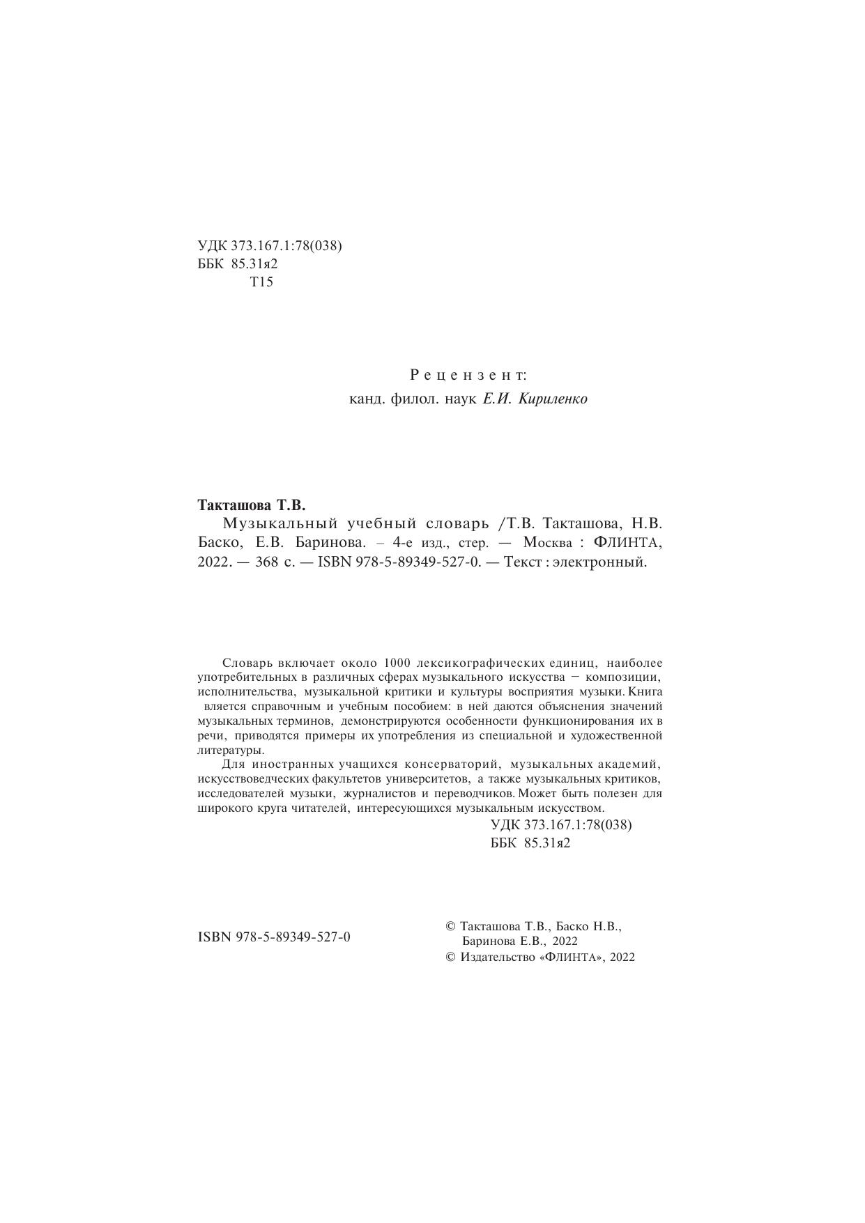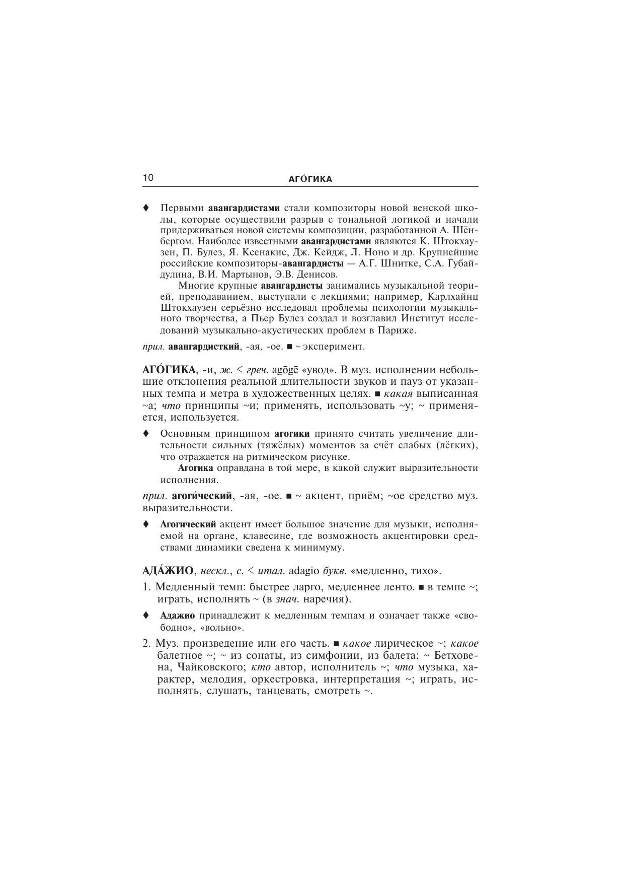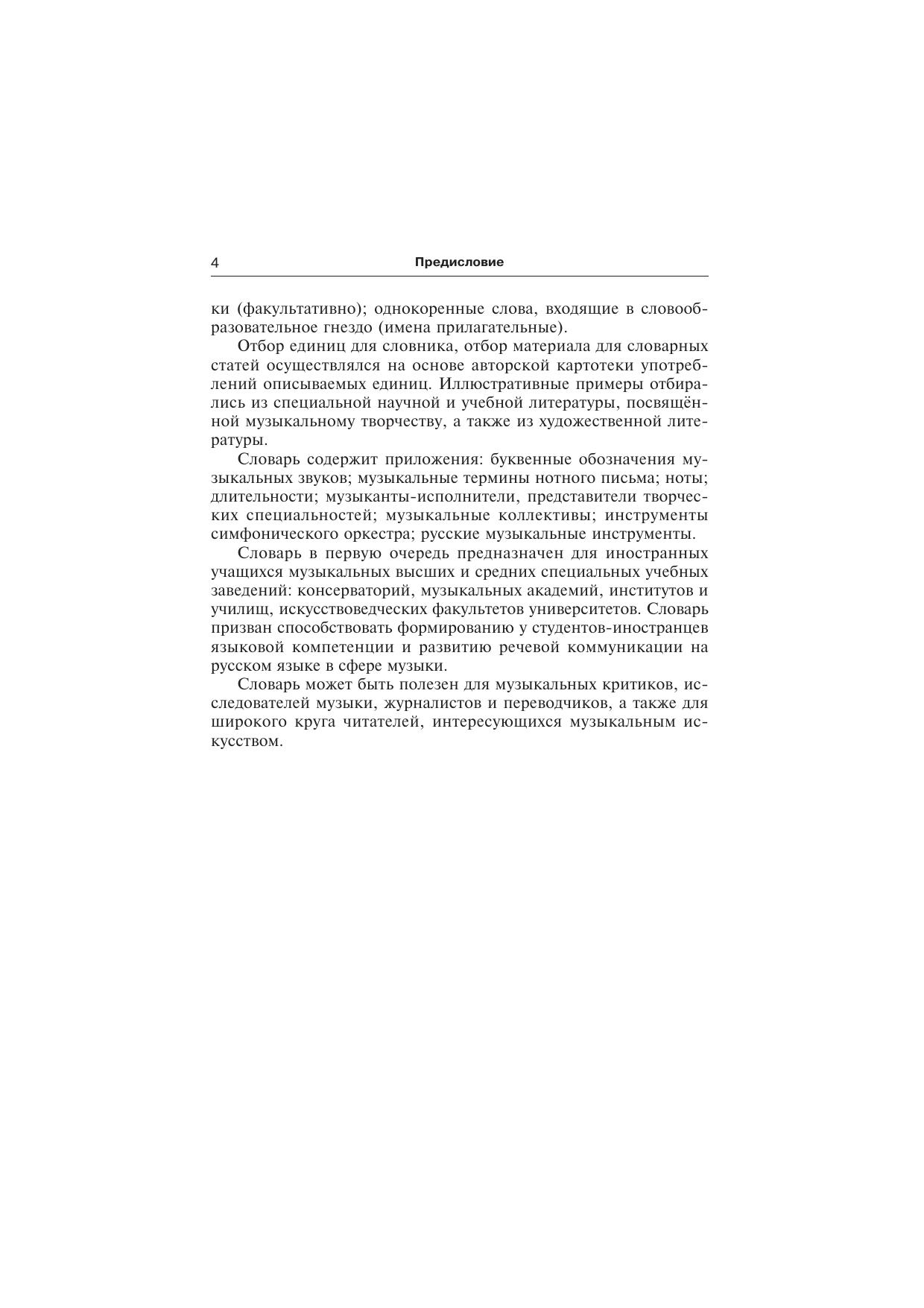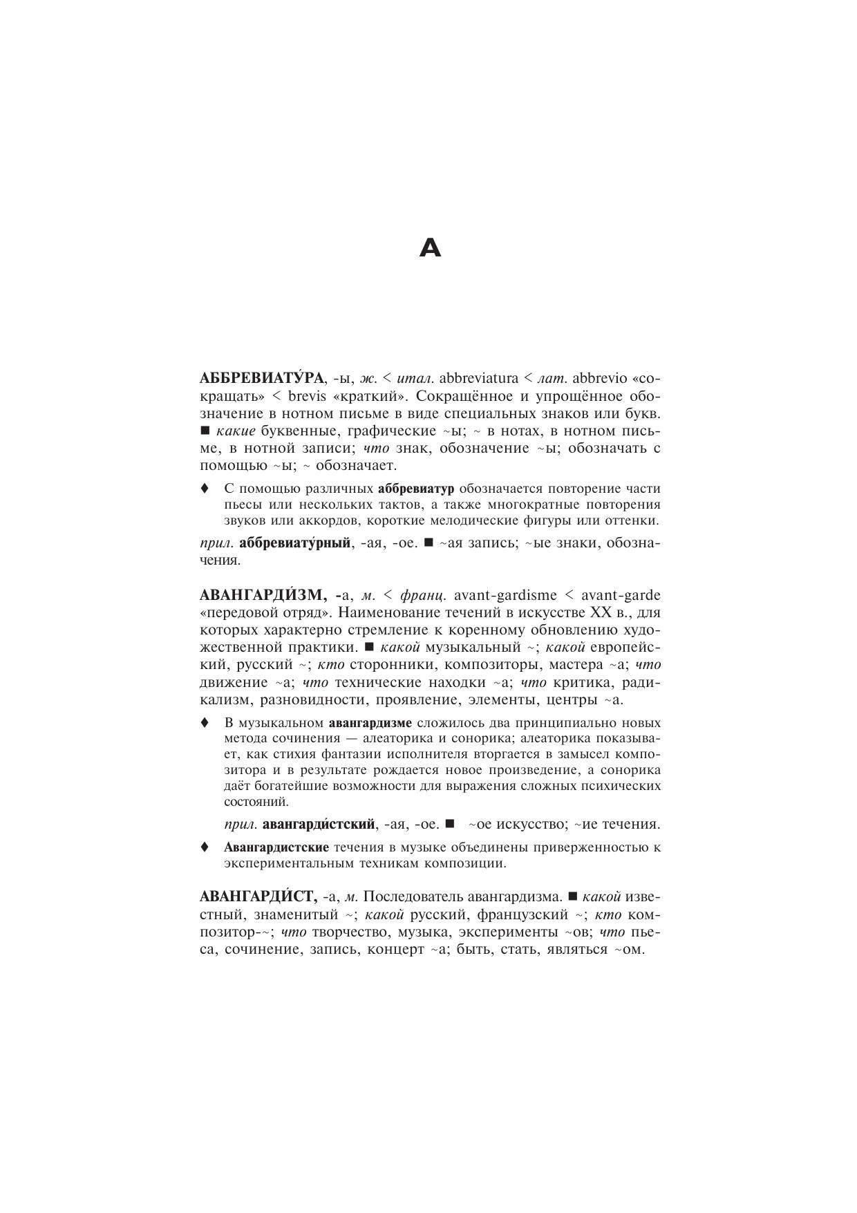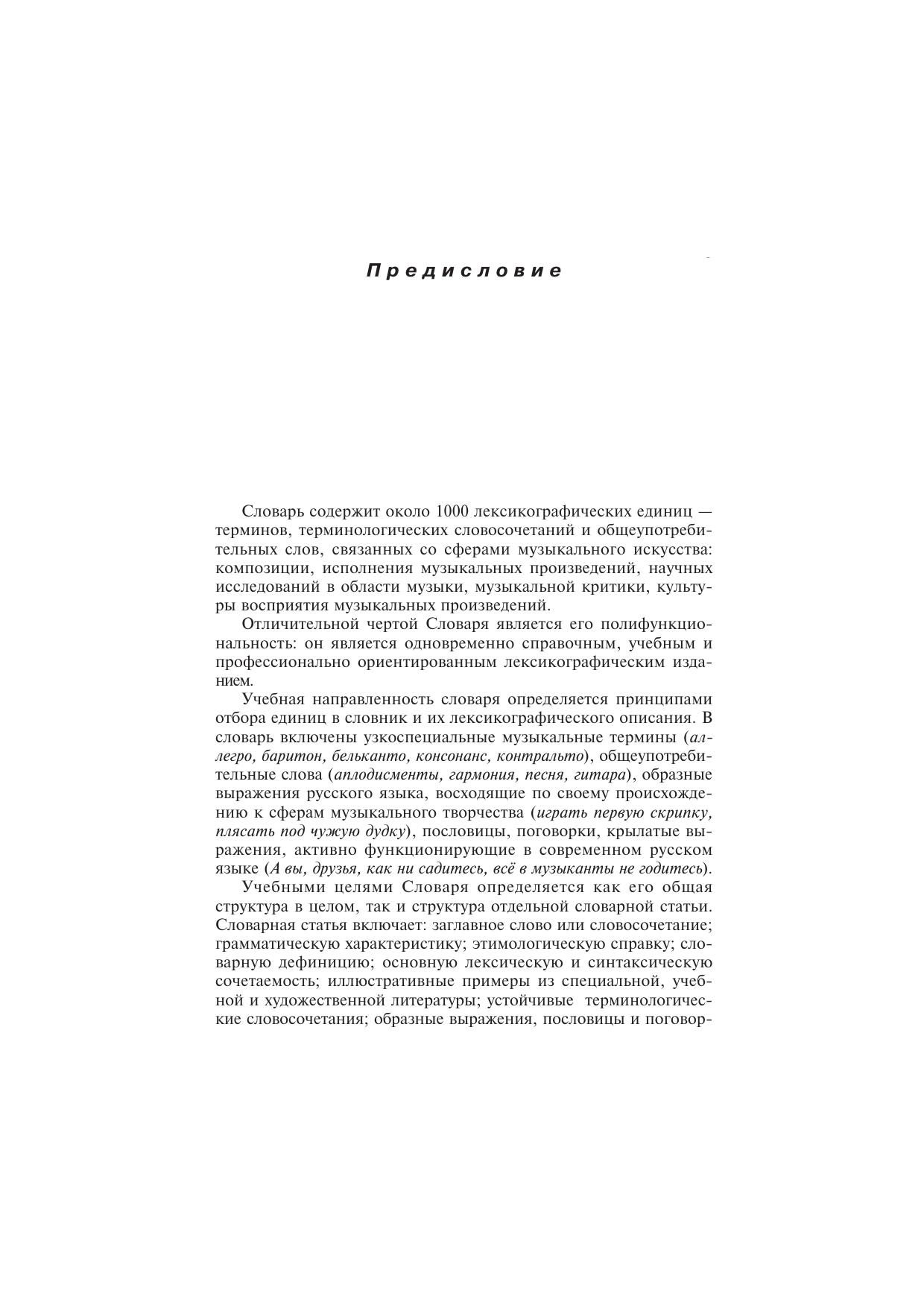 Словарь включает около 1000 лексикографических единиц, наиболее употребительных в различных сферах музыкального искусства - композиции, исполнительства, музыкальной критики и культуры восприятия музыки. Книга вляется справочным и учебным пособием: в ней даются объяснения значений музыкальных терминов, демонстрируются особенности функционирования их в речи, приводятся примеры их употребления из специальной и художественной литературы.