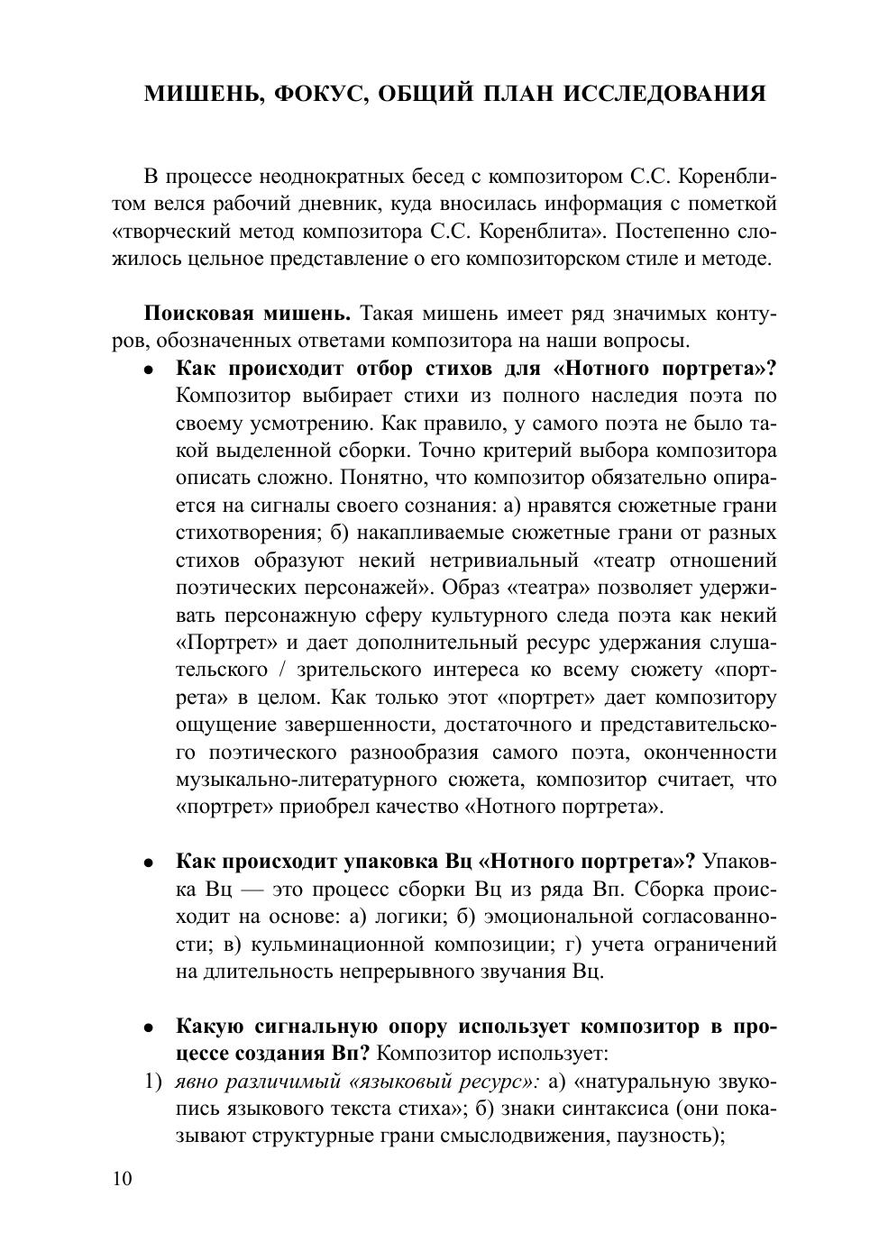 В процесс исследования попали «Нотные портреты» трех классиков русской поэзии, а именно: С.Я. Надсон (один вокальный цикл), М.Ю. Лермонтов (один вокальный метацикл), М.И. Цветаева (один вокальный мегацикл). Всего было рассмотрено 340 вокальных произведений, входящих в 15 вокальных циклов. Проявлена граница «композиторский стиль ↔ композиторский метод», выделены составляющие элементы «композиторского метода»: способы бережной работы с текстом оригинала, считывание натуральной звукописи текста, опевание синтаксиса и др. Заявляется оригинальный творческий метод «Основы композиторской лингводидактики вокальных произведений и циклов».