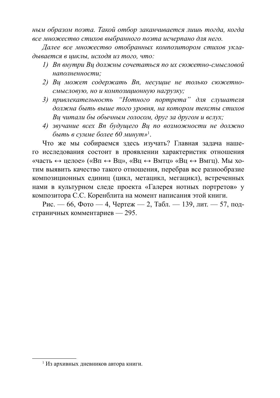Книга посвящена исследованию типов организации композиционного качества вокальных циклов в культурном следе проекта «Галерея нотных портретов» российского композитора С.С. Коренблита и подводит итог большого и многолетнего исследовательского цикла ее автора. Впервые для такого рода исследований вводится экспертный метод анализа отношения «часть ↔ целое» на основе создания фокусирующего многокомпонентного эйдоса, в котором связка цельности акцентирована через окно «золотое сечение».
