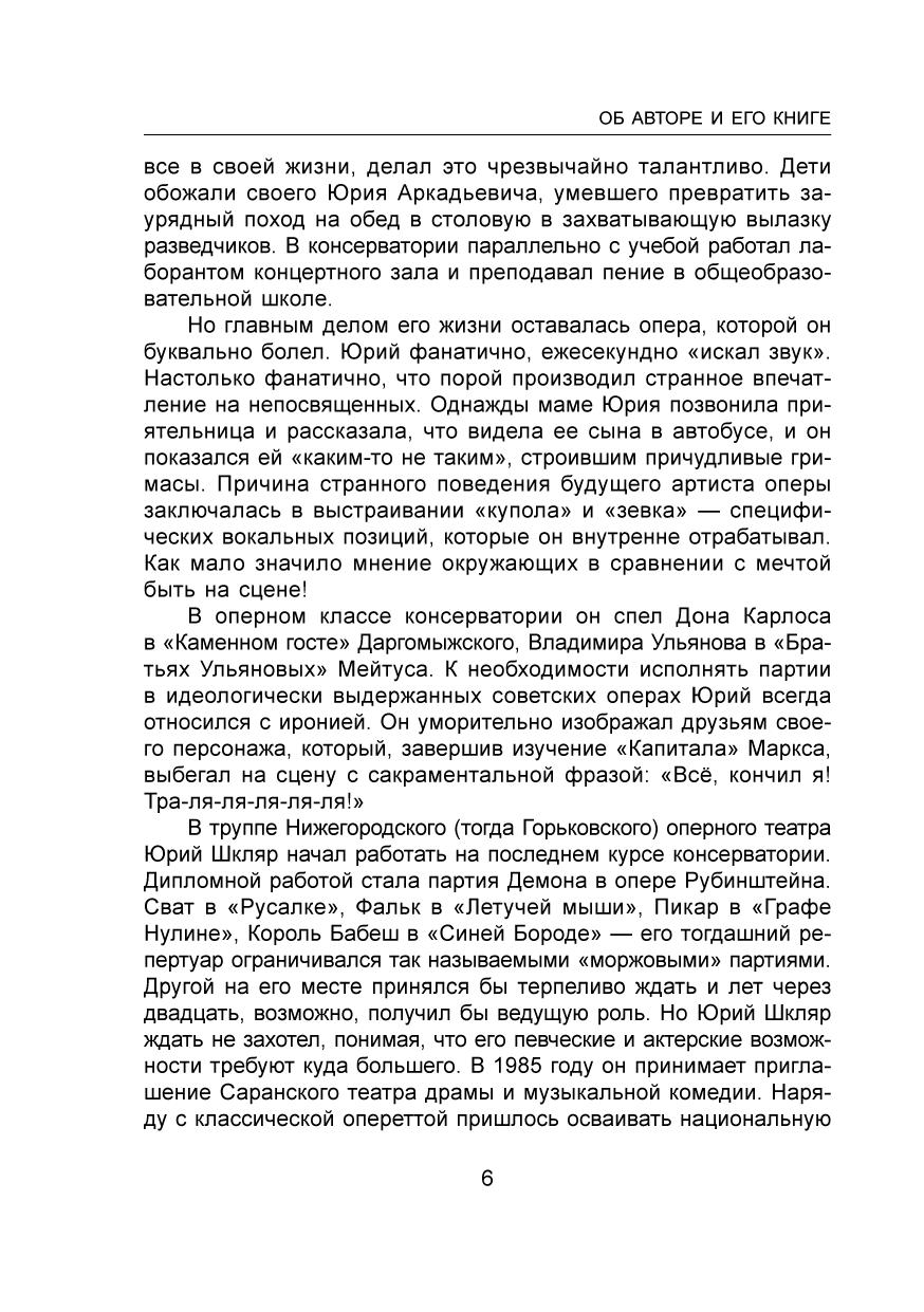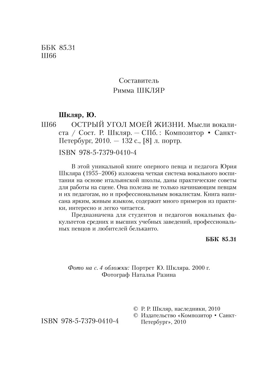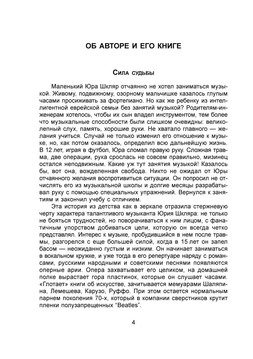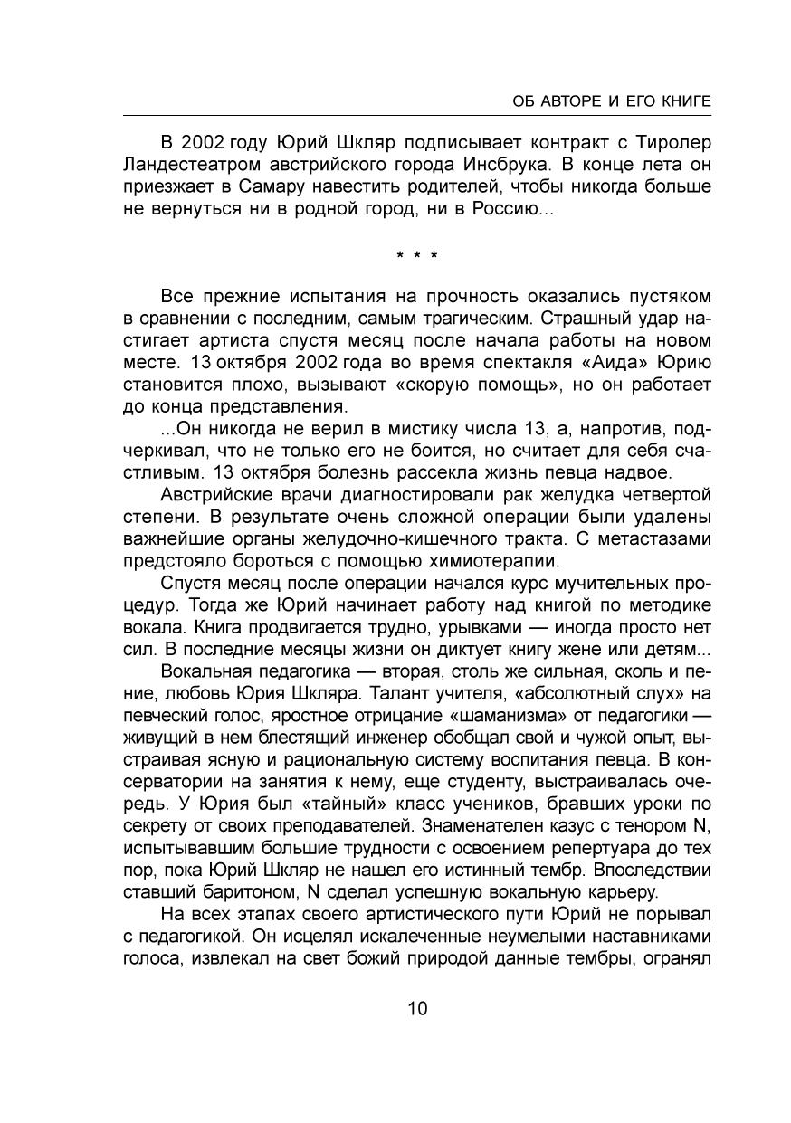 В этой уникальной книге оперного певца и педагога Юрия Шкляра (1955-2006) изложена четкая система вокального воспитания на основе итальянской школы, даны практические советы для работы на сцене. Она полезна не только начинающим певцам и их педагогам, но и профессиональным вокалистам. Книга написана ярким, живым языком, содержит много примеров из практики, интересно и легко читается. Предназначена для студентов и педагогов вокальных факультетов средних и высших учебных заведений, профессиональных певцов и любителей бельканто.
