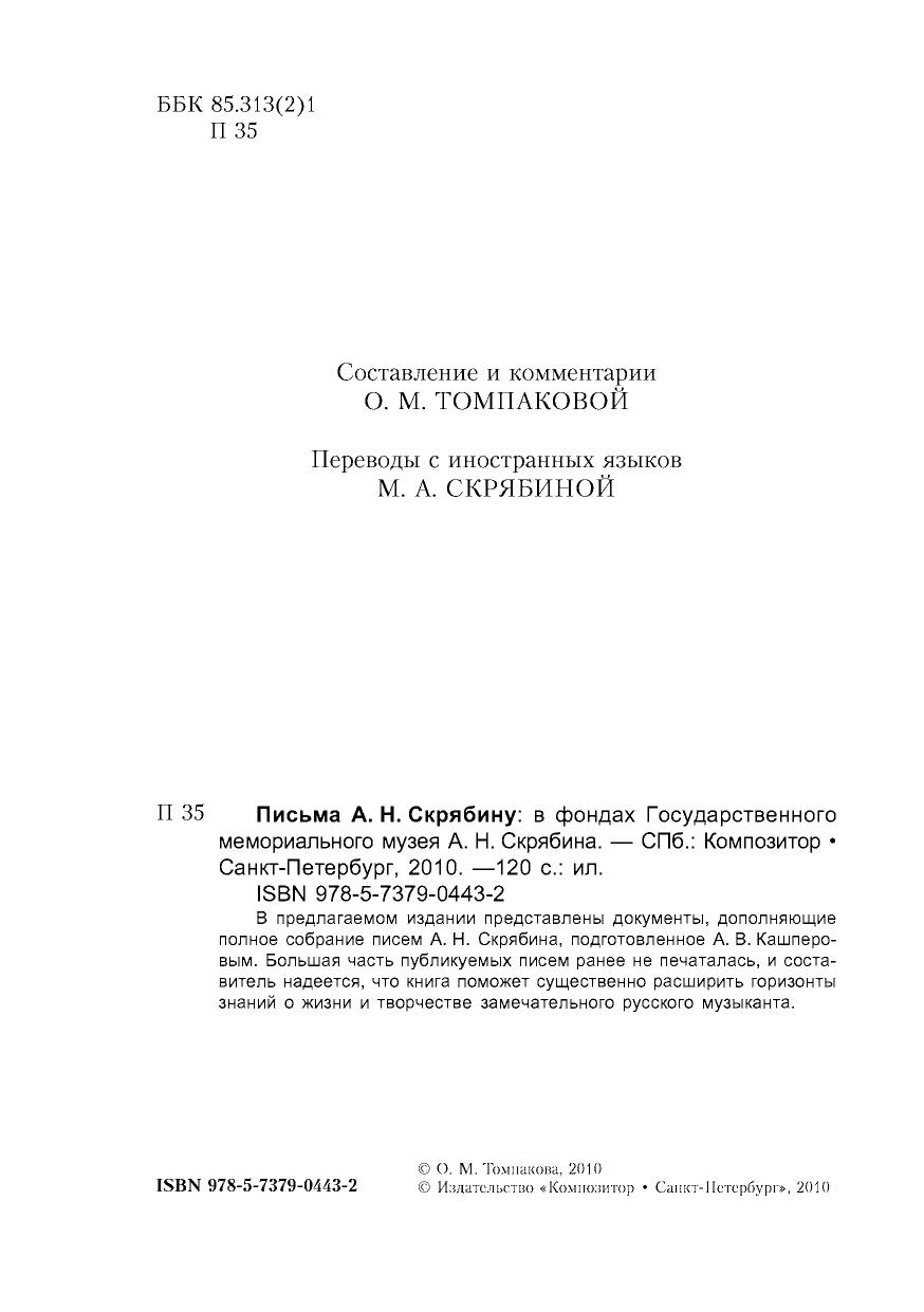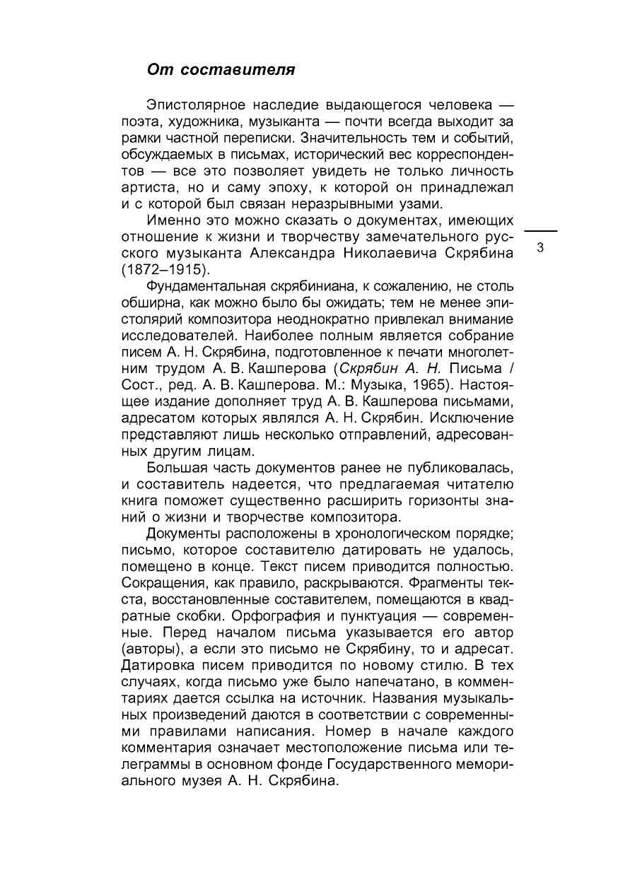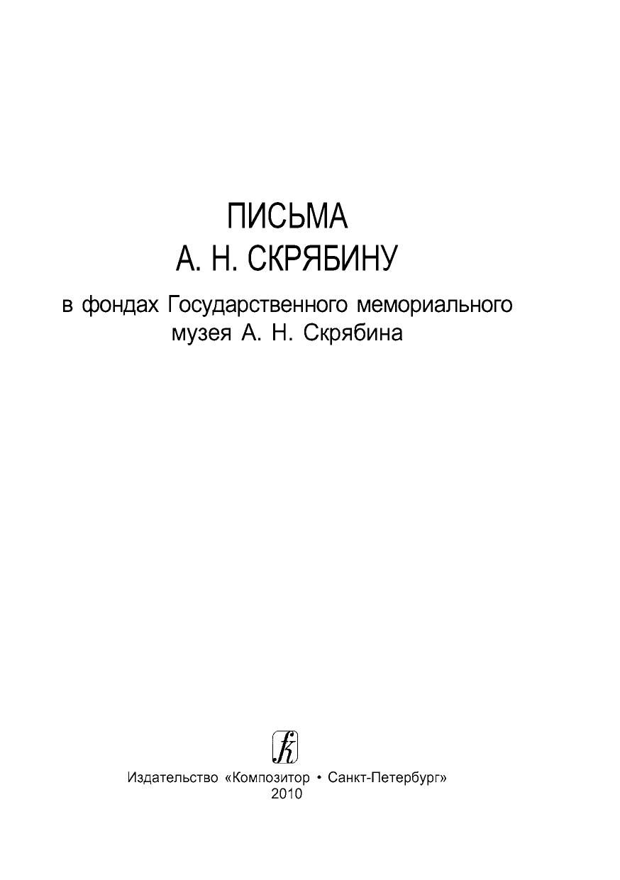 Эпистолярное наследие выдающегося человека — поэта, художника, музыканта — почти всегда выходит за рамки частной переписки. Значительность тем и событий, обсуждаемых в письмах, исторический вес корреспондентов — все это позволяет увидеть не только личность артиста, но и саму эпоху, к которой он принадлежал и с которой был связан неразрывными узами. Именно это можно сказать о документах, имеющих отношение к жизни и творчеству замечательного русского музыканта Александра Николаевича Скрябина (1872–1915). Фундаментальная скрябиниана, к сожалению, не столь обширна, как можно было бы ожидать тем не менее эпистолярий композитора неоднократно привлекал внимание исследователей. Наиболее полным является собрание писем А. Н. Скрябина, подготовленное к печати многолетним трудом А. В. Кашперова (Скрябин А. Н. Письма / Cост., ред. А. Кашперова. М.: Музыка, 1965). Настоящее издание дополняет труд А. Кашперова письмами, адресатом которых являлся А. Скрябин. Исключение представляют лишь несколько отправлений, адресованных другим лицам. Большая часть документов ранее не публиковалась, и составитель надеется, что предлагаемая читателю книга поможет существенно расширить горизонты знаний о жизни и творчестве композитора.