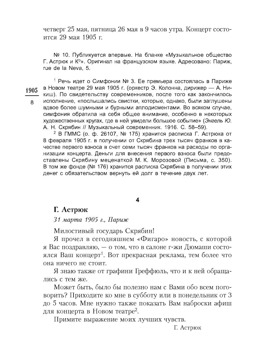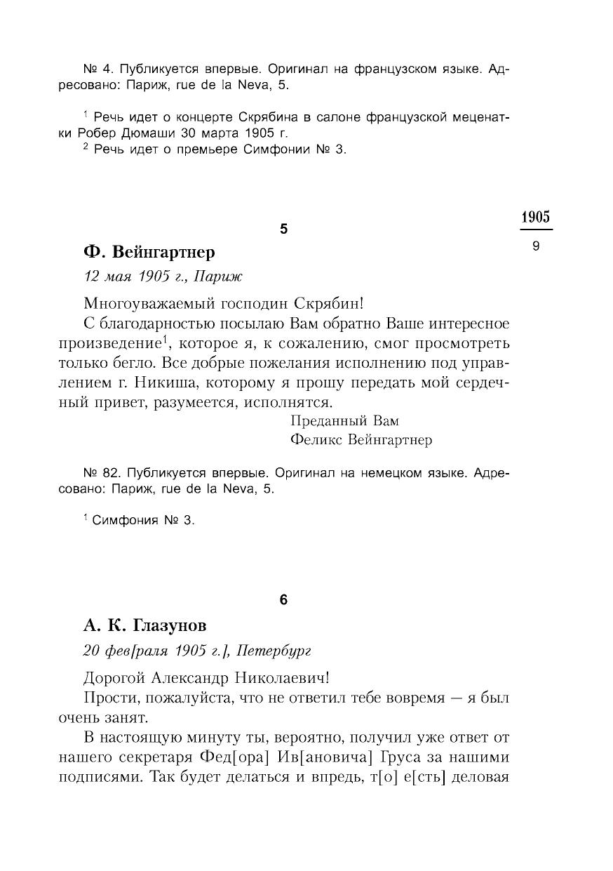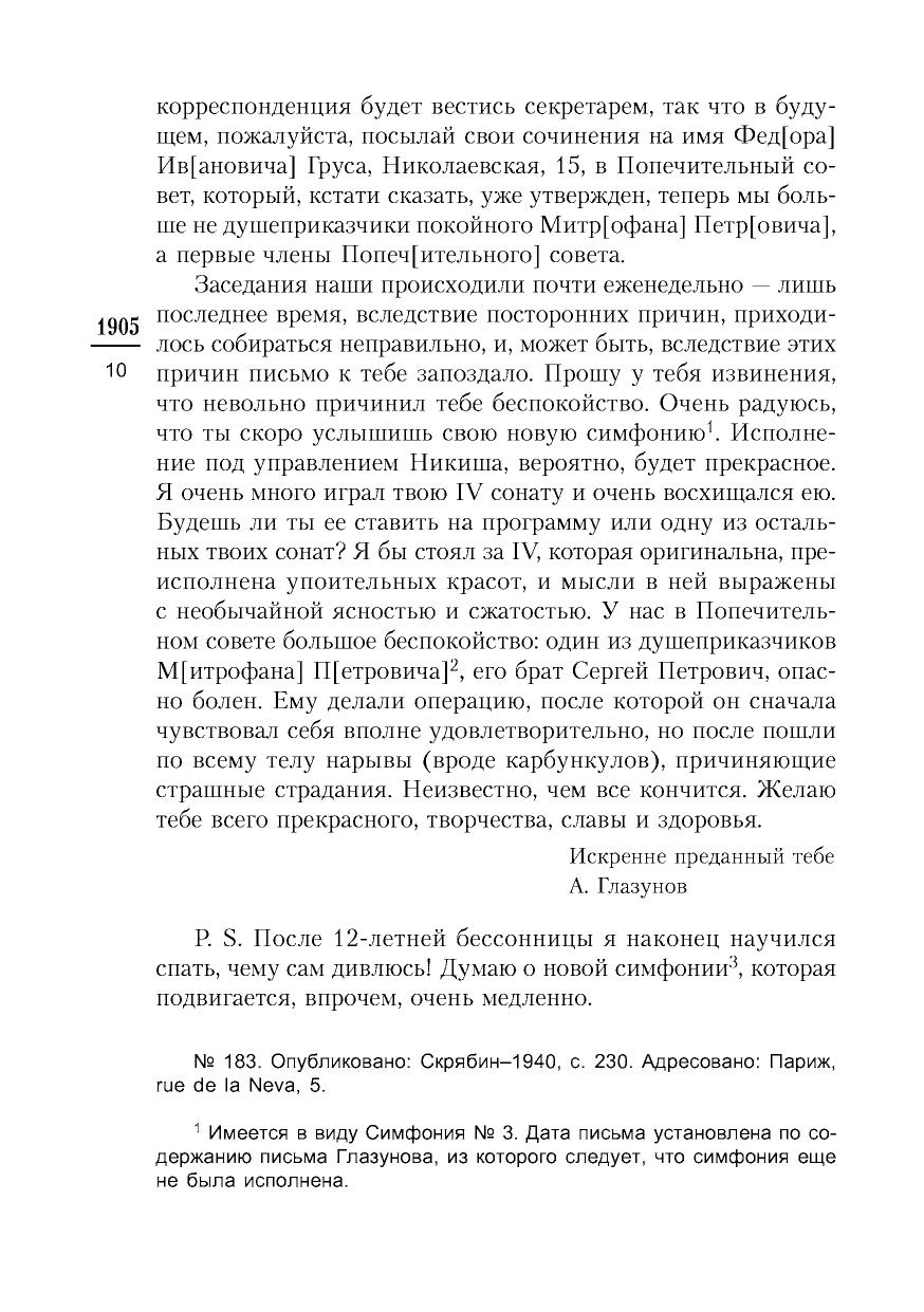 Эпистолярное наследие выдающегося человека — поэта, художника, музыканта — почти всегда выходит за рамки частной переписки. Значительность тем и событий, обсуждаемых в письмах, исторический вес корреспондентов — все это позволяет увидеть не только личность артиста, но и саму эпоху, к которой он принадлежал и с которой был связан неразрывными узами. Именно это можно сказать о документах, имеющих отношение к жизни и творчеству замечательного русского музыканта Александра Николаевича Скрябина (1872–1915). Фундаментальная скрябиниана, к сожалению, не столь обширна, как можно было бы ожидать тем не менее эпистолярий композитора неоднократно привлекал внимание исследователей. Наиболее полным является собрание писем А. Н. Скрябина, подготовленное к печати многолетним трудом А. В. Кашперова (Скрябин А. Н. Письма / Cост., ред. А. Кашперова. М.: Музыка, 1965). Настоящее издание дополняет труд А. Кашперова письмами, адресатом которых являлся А. Скрябин. Исключение представляют лишь несколько отправлений, адресованных другим лицам. Большая часть документов ранее не публиковалась, и составитель надеется, что предлагаемая читателю книга поможет существенно расширить горизонты знаний о жизни и творчестве композитора.
