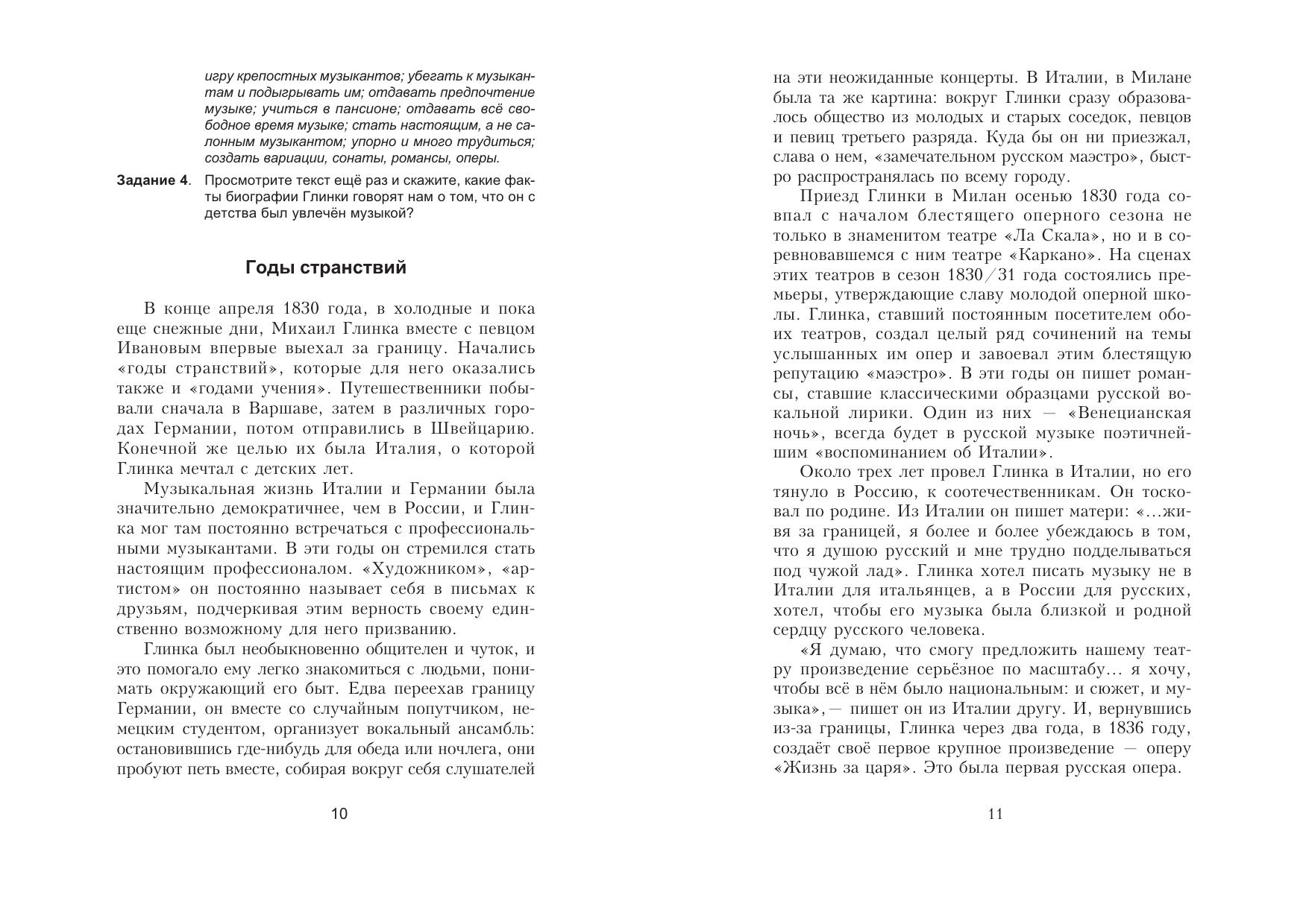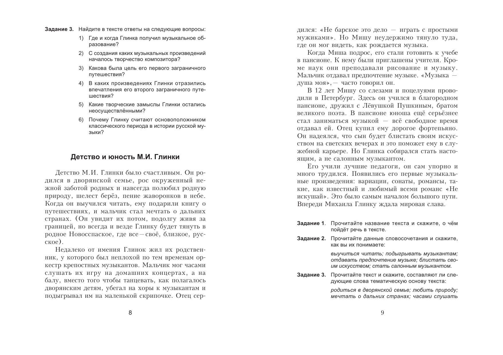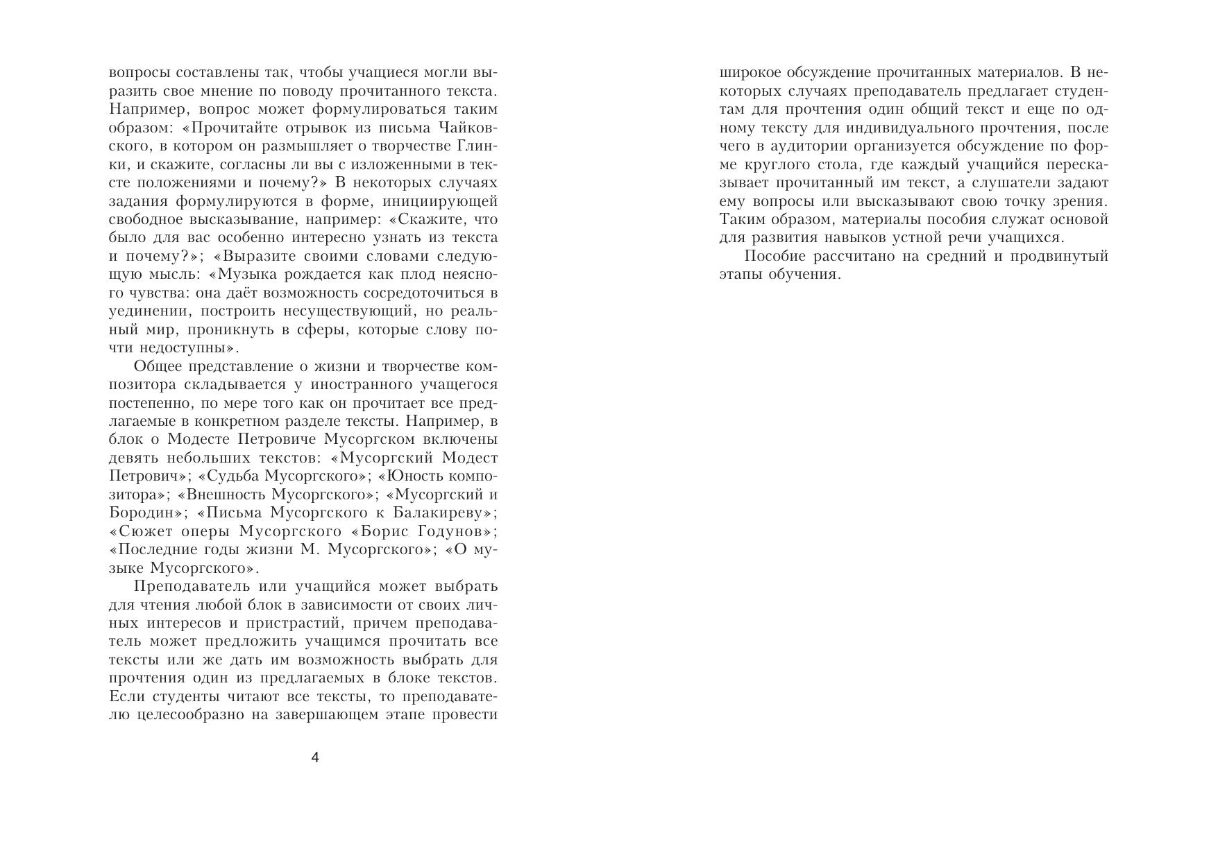 В пособии представлены тексты для чтения о жизни и творче- стве великих русских композиторов. Также даны задания к текстам на проверку понимания и пересказ прочитанного. В конце пособия приведен краткий толковый словарь музыкальных терминов.
