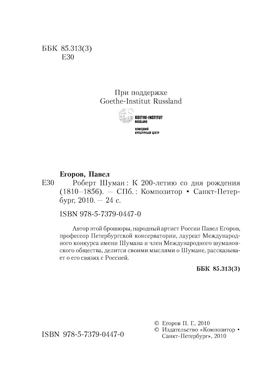 Автор этой брошюры, народный артист России Павел Егоров, профессор Петербургской консерватории, лауреат Международного конкурса имени Шумана и член Международного шумановского общества, делится своими мыслями о Шумане, рассказывает о его связях с Россией.