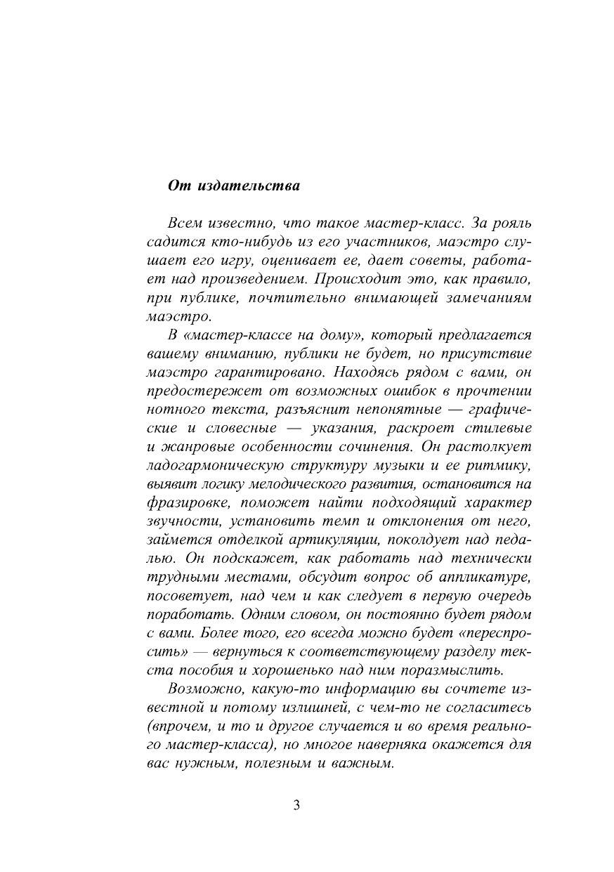 Всем известно, что такое мастер-класс. За рояль садится кто-нибудь из его участников, маэстро слушает его игру, оценивает ее, дает советы, работает над произведением. Происходит это, как правило, при публике, почтительно внимающей замечаниям маэстро. В «Мастер-классе на дому», который предлагается вашему вниманию, публики не будет, но присутствие маэстро гарантировано. Находясь рядом с вами, он предостережет от возможных ошибок в прочтении нотного текста, разъяснит непонятные — графические и словесные — указания, раскроет стилевые и жанровые особенности сочинения. Он растолкует ладогармоническую структуру музыки и ее ритмику, выявит логику мелодического развития, остановится на фразировке, поможет найти подходящий характер звучности, установить темп и отклонения от него, займется отделкой артикуляции, поколдует над педалью. Он подскажет, как работать над технически трудными местами, обсудит вопрос об аппликатуре, посоветует, над чем и как следует в первую очередь поработать. Одним словом, он постоянно будет рядом с вами. Более того, его всегда можно будет «переспросить» — вернуться к соответствующему разделу текста пособия и хорошенько над ним поразмыслить. Пособия «Мастер-класс на дому» рассчитаны на учащихся музыкальных учебных заведений и молодых педагогов. Их могут использовать также пианисты-любители.