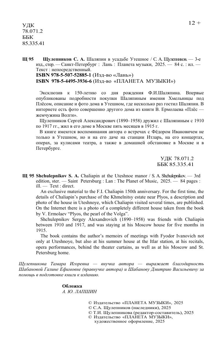 Эксклюзив к 150-летию Ф. И. Шаляпина. Впервые опубликованы подробности покупки Шаляпиным имения Хмельницы под Плёсом, описание и фото дома в Утешном, где несколько раз гостил Шаляпин. В интернете есть фото совершенно другого дома из книги В. Ермолаева «Плёс – жемчужина Волги». Щулепников Сергей Александрович (1890-1958) дружил с Шаляпиным с 1910 по 1917. Жил в его доме в Москве 5 месяцев в 1915. В книге воспоминания автора о встречах с Фёдором Ивановичем не только в Утешном, но и на его даче на станции Итларь, на его концертах, операх, за кулисами театра, а также в домашней обстановке в Москве и в Петербурге. An exclusive material to the F.I. Chaliapin 150th anniversary. For the first time, the details of Chaliapin’s purchase of the Khmelnitsy estate near Plyos, a description and photo of the house in Uteshnoye, which Chaliapin visited several times, are published. On the Internet there is a photo of a completely different house taken from the book by V. Ermolaev “Plyos, the pearl of the Volga”. Shchulepnikov Sergey Alexandrovich (1890–1958) was friends with Chaliapin between 1910 and 1917, and was staying at his Moscow house for five months in 1915. The book contains the author’s memoirs of meetings with Fyodor Ivanovich not only at Uteshnoye, but also at his summer house at the Itlar station, at his recitals, opera performances, behind the theater curtains, as well as at his Moscow and St. Petersburg home.