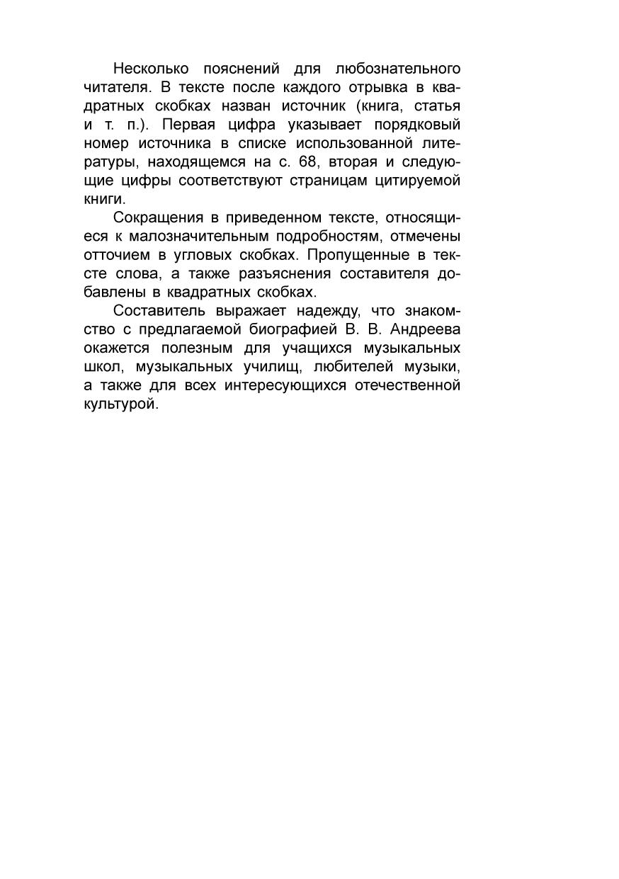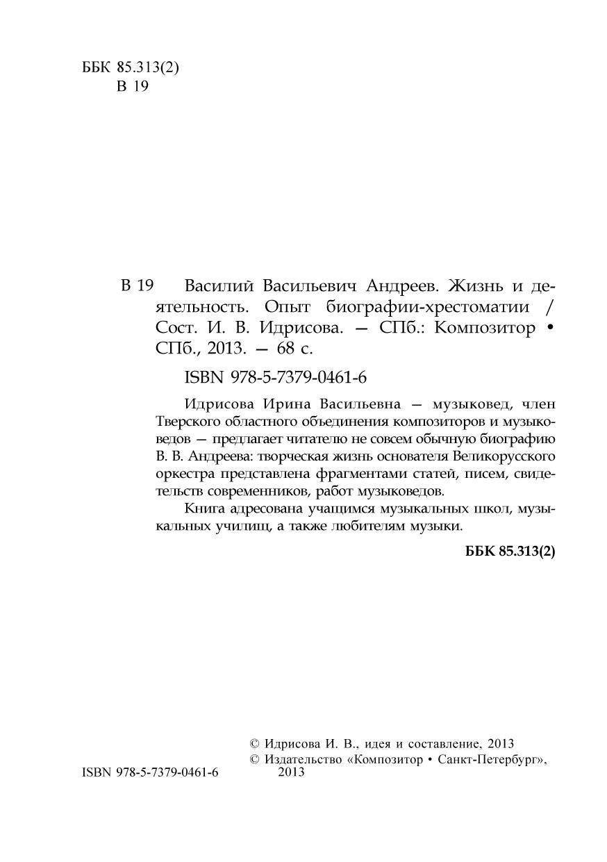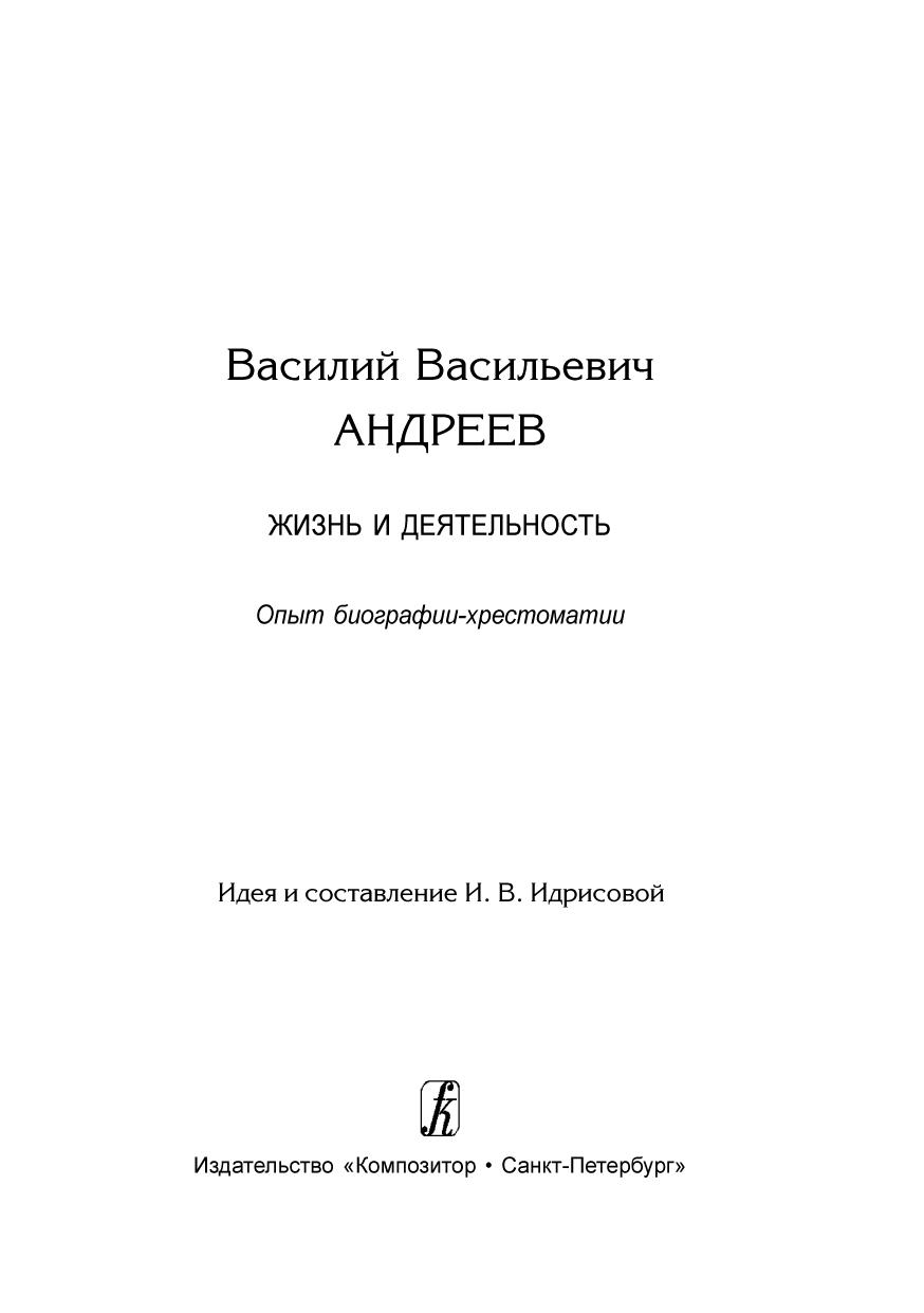 Идрисова Ирина Васильевна — музыковед, член Тверского областного объединения композиторов и музыковедов — предлагает читателю не совсем обычную биографию В. В. Андреева: творческая жизнь основателя Великорусского оркестра представлена фрагментами статей, писем, свидетельств современников, работ музыковедов. Книга адресована учащимся музыкальных школ, музыкальных училищ, а также любителям музыки.
