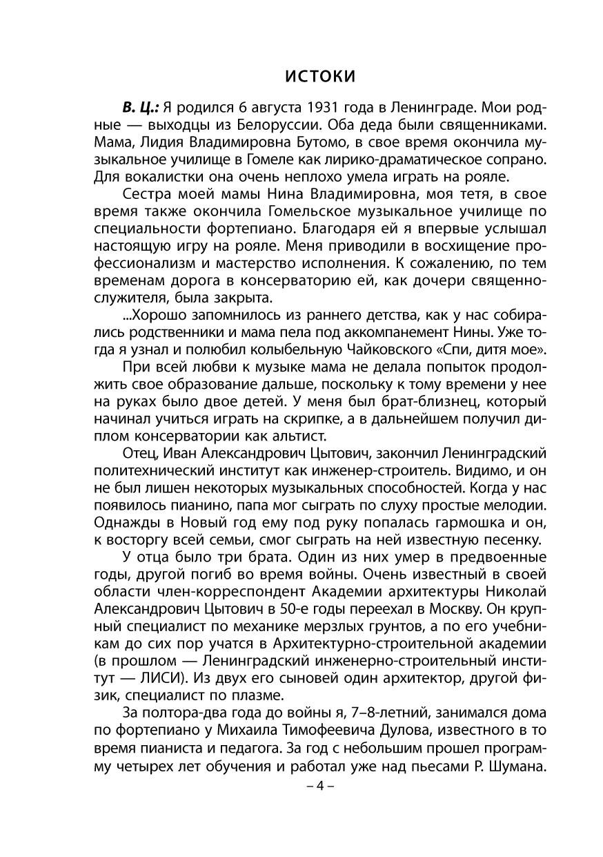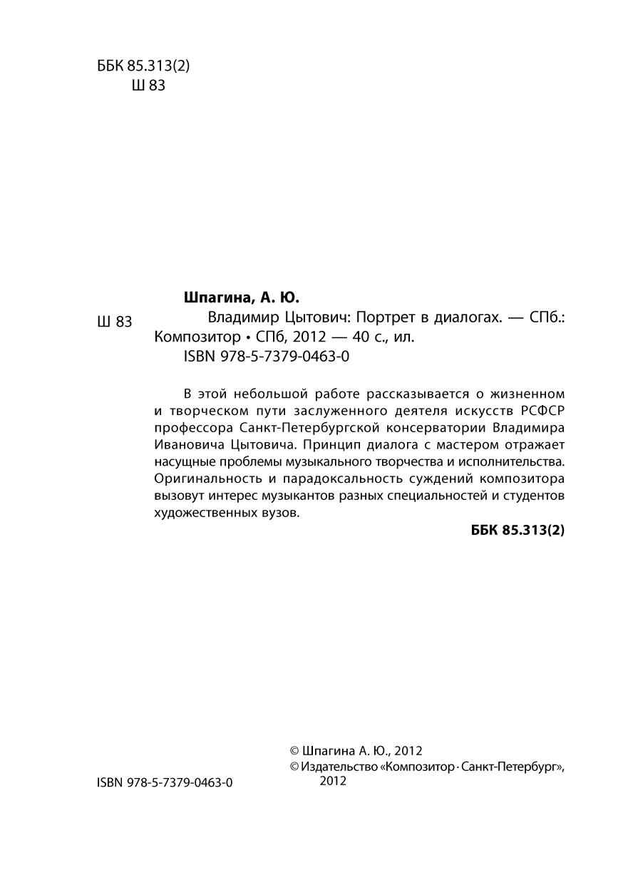 В этой небольшой работе рассказывается о жизненном и творческом пути заслуженного деятеля искусств РСФСР профессора Санкт-Петербургской консерватории Владимира Ивановича Цытовича. Принцип диалога с мастером отражает насущные проблемы музыкального творчества и исполнительства. Оригинальность и парадоксальность суждений композитора вызовут интерес музыкантов разных специальностей и студентов художественных вузов.