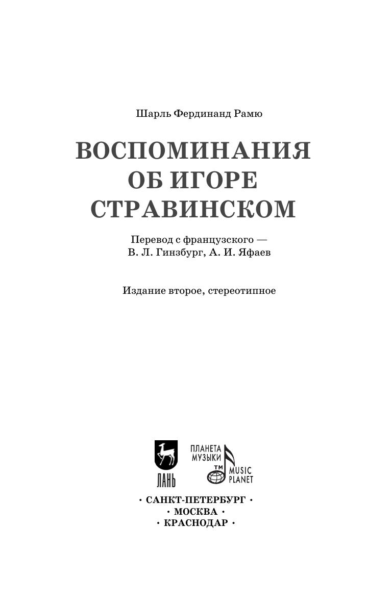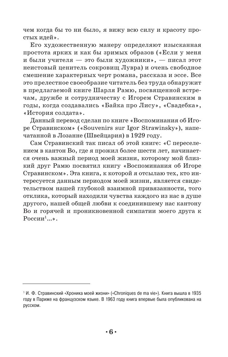Книга «Воспоминания об Игоре Стравинском» увидела свет в Лозанне (Швейцария) в 1929 году. Художественную манеру Рамю определяют изысканная простота ярких образов и свободное смешение характерных черт романа, рассказа и эссе. Все это прелестное своеобразие читатель обнаружит в книге, посвященной встречам, дружбе и сотрудничеству с Игорем Стравинским в годы, когда создавались «Байка про Лису», «Свадебка», «История солдата» (1915 – 1920). Книга отражает события этого периода жизни Стравинского, в то же время в ней много философских, эстетических размышлений автора.