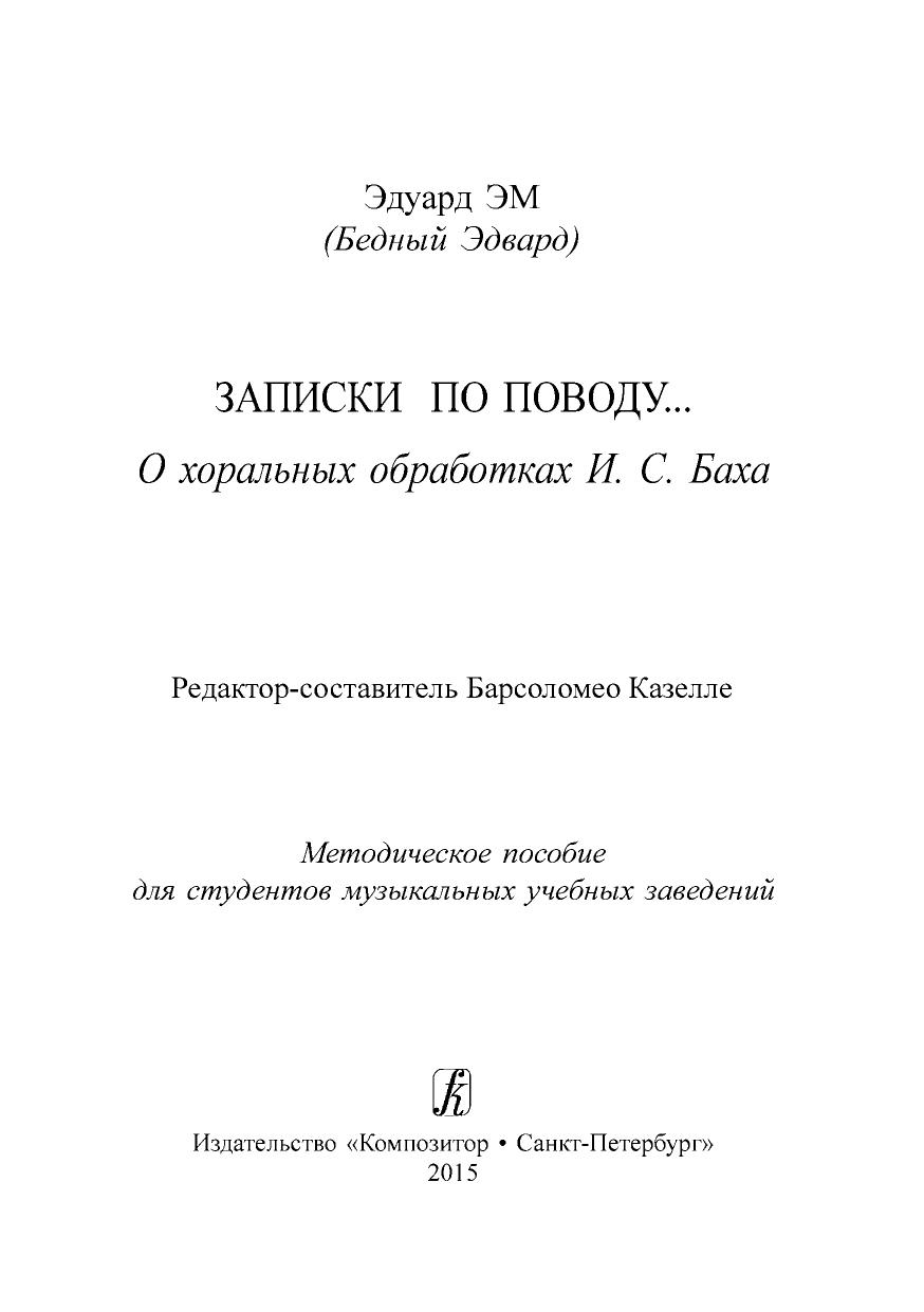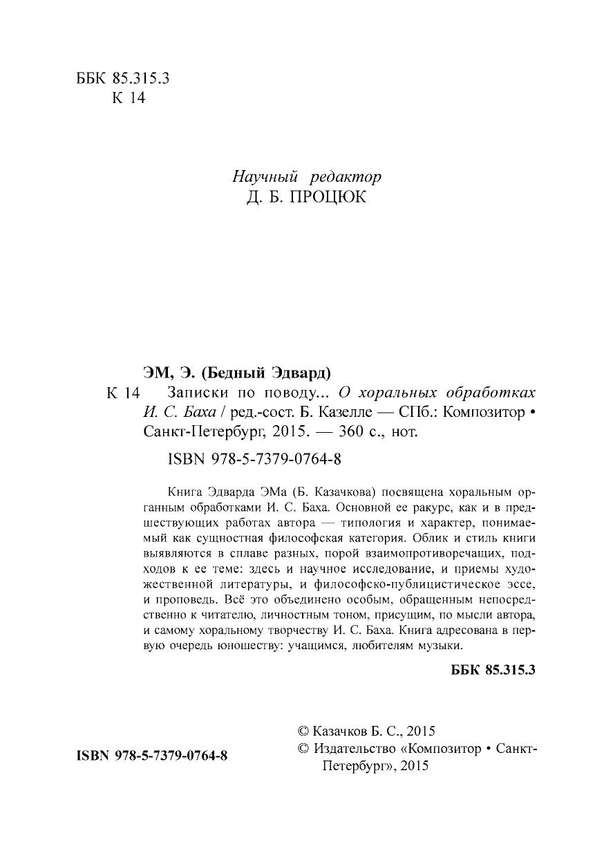 Книга Эдварда ЭМа (Б. Казачкова) посвящена хоральным органным обработками И. С. Баха. Основной ее ракурс, как и в предшествующих работах автора — типология и характер, понимаемый как сущностная философская категория. Облик и стиль книги выявляются в сплаве разных, порой взаимопротиворечащих, подходов к ее теме: здесь и научное исследование, и приемы художественной литературы, и философско-публицистическое эссе, и проповедь. Всё это объединено особым, обращенным непосредственно к читателю, личностным тоном, присущим, по мысли автора, и самому хоральному творчеству И. С. Баха. Книга адресована в первую очередь юношеству: учащимся, любителям музыки.