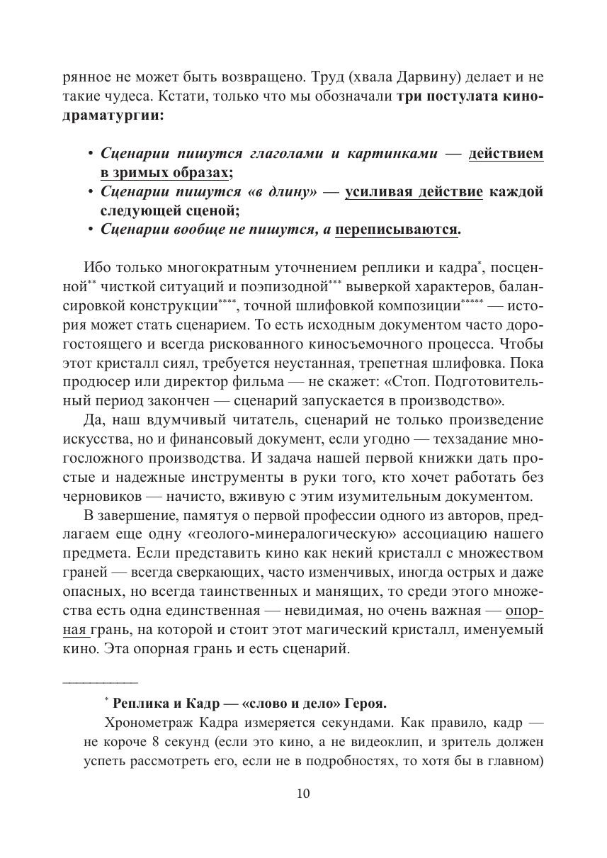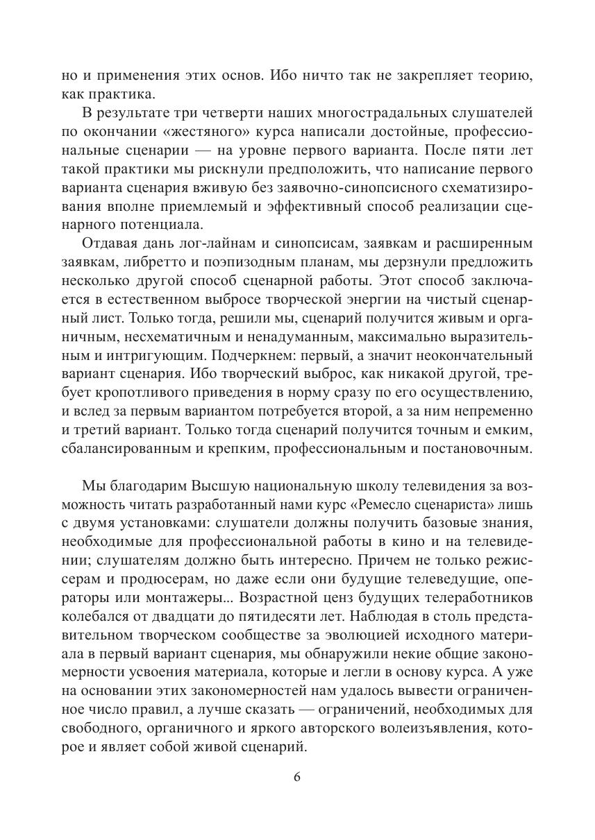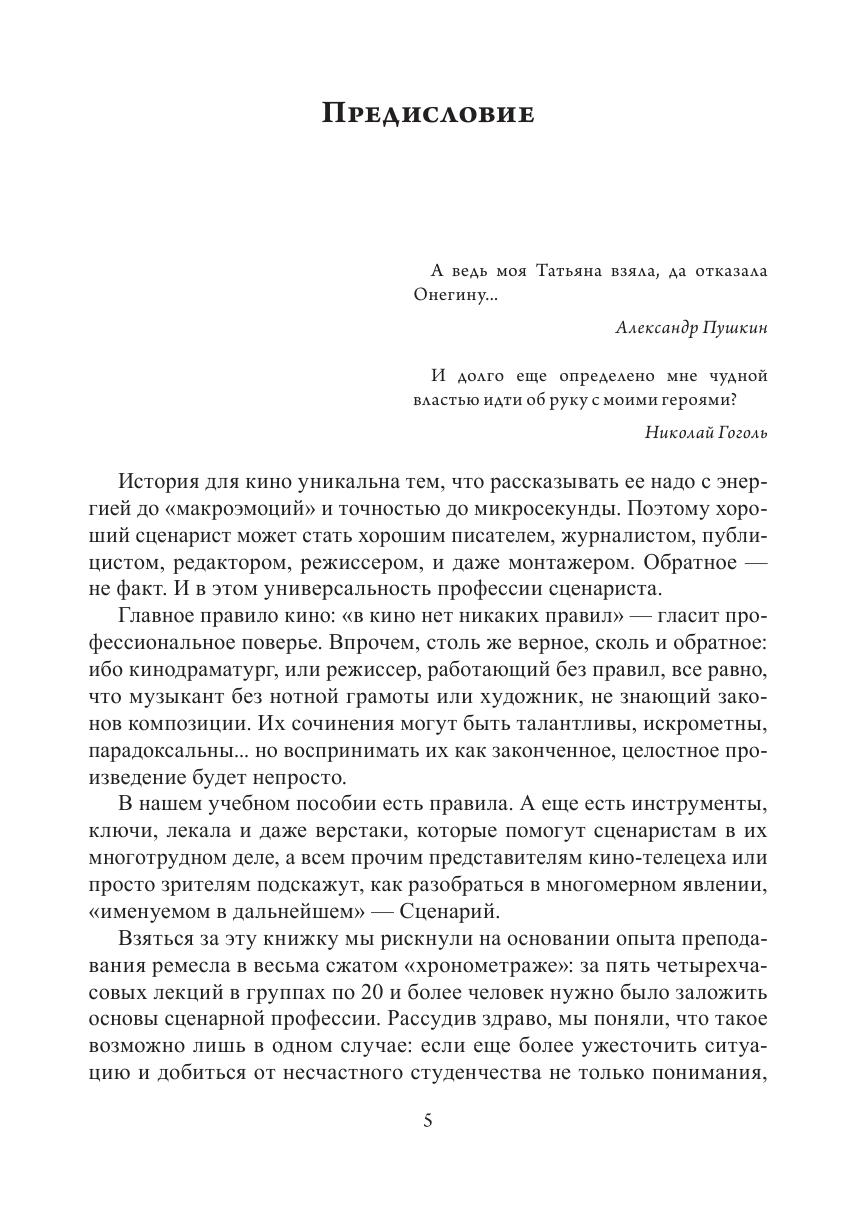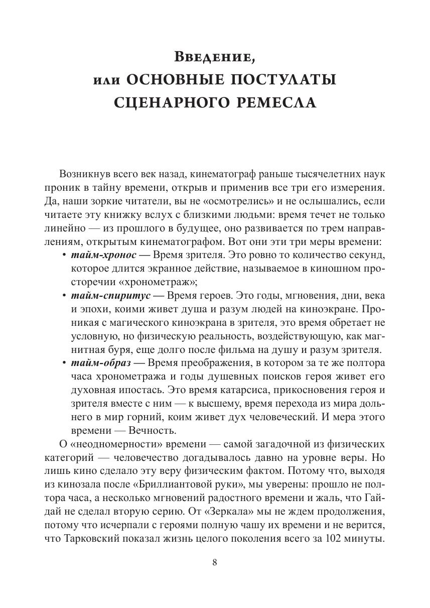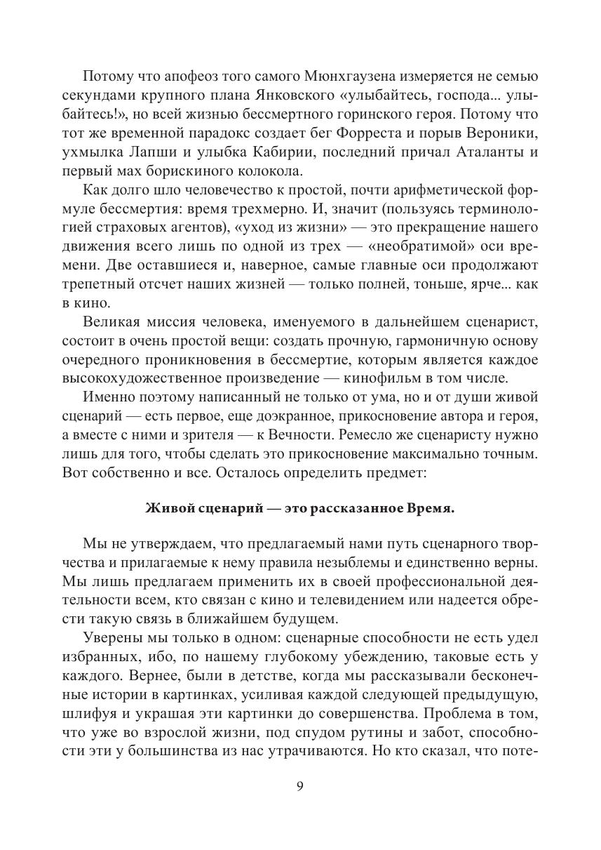 Великая миссия человека, именуемого в дальнейшем сценарист, состоит в очень простой вещи: создать прочную, гармоничную основу очередного проникновения в бессмертие, которым является каждое высокохудожественное произведение — кинофильм в том числе. Именно поэтому написанный не только от ума, но и от души живой сценарий есть первое, еще доэкранное, прикосновение автора и героя, а вместе с ними и зрителя, к Вечности. Ремесло же сценаристу нужно лишь для того, чтобы сделать это прикосновение максимально точным. Вот собственно и все. Осталось пределить предмет: сценарий — это рассказанное время. В учебном пособии есть правила, инструменты, ключи, лекала и даже верстаки, которые помогут сценаристам разобраться в их многотрудном деле, а всем прочим представителям кинотелецеха или просто зрителям — в многомерном явлении под названием сценарий.