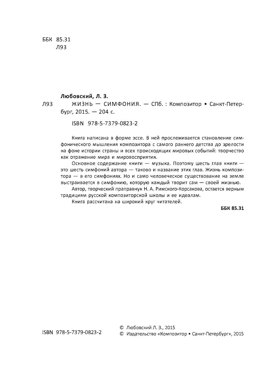 Книга написана в форме эссе. В ней прослеживается становление симфонического мышления композитора с самого раннего детства до зрелости на фоне истории страны и всех происходящих мировых событий: творчество как отражение мира и мировосприятия. Основное содержание книги — музыка. Поэтому шесть глав книги — это шесть симфоний автора — таково и название этих глав. Жизнь композитора — в его симфониях. Но и само человеческое существование на земле выстраивается в симфонию, которую каждый творит сам — своей жизнью. Автор, творческий праправнук Н. А. Римского-Корсакова, остается верным традициям русской композиторской школы и ее идеалам. Книга рассчитана на широкий круг читателей.