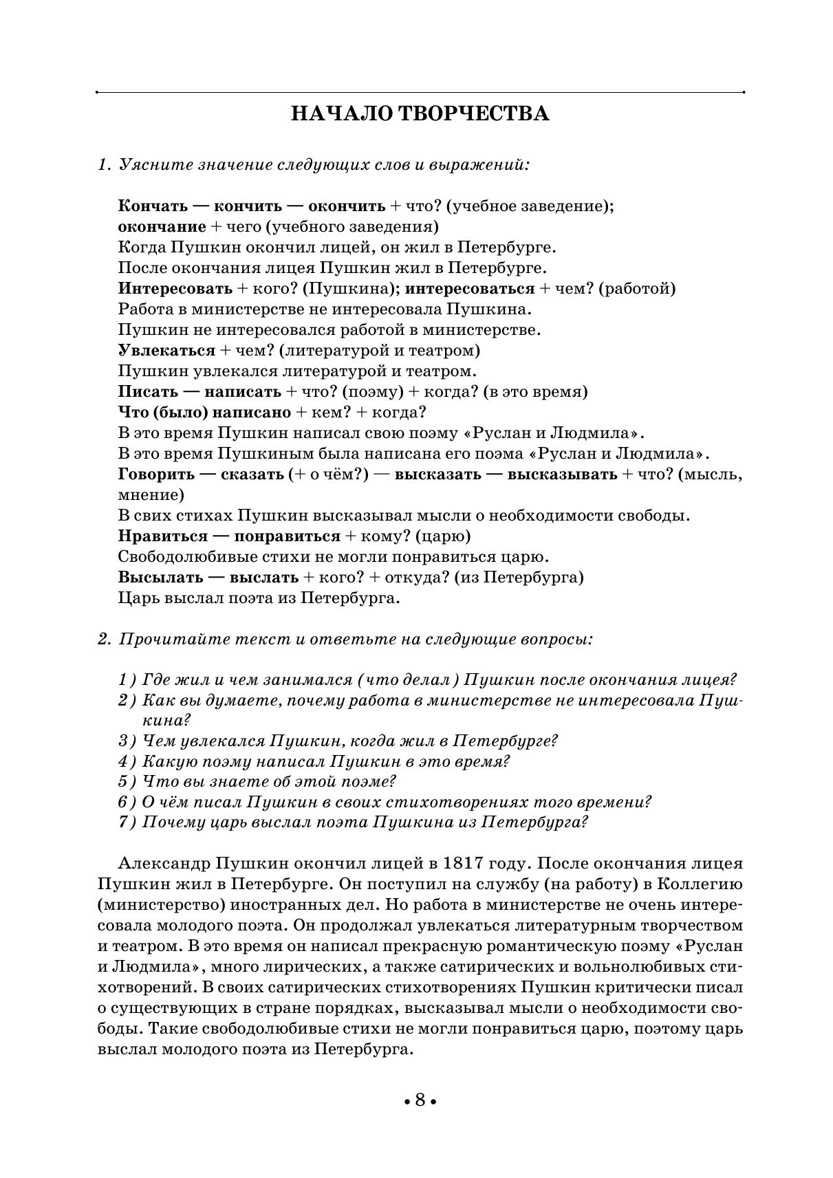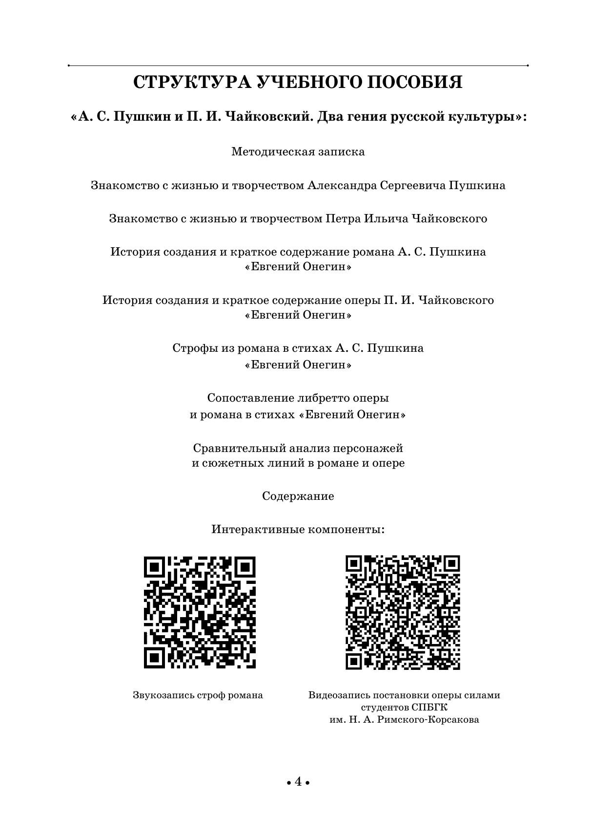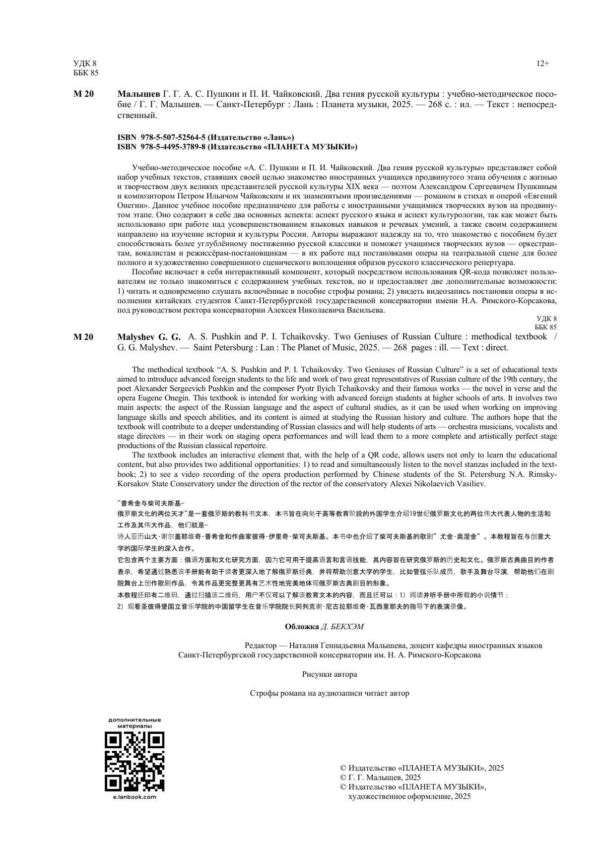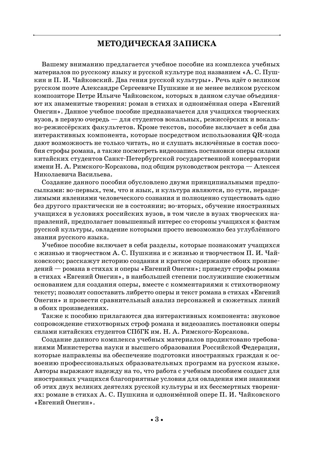 Учебное пособие «А.С. Пушкин и П.И. Чайковский. Два гения русской культуры» представляет собой набор учебных текстов, ставящих своей целью знакомство иностранных учащихся продвинутого этапа обучения с жизнью и творчеством двух великих представителей русской культуры XIX века – поэтом Александром Сергеевичем Пушкиным и композитором Петром Ильичом Чайковским и их знаменитыми произведениями – романом в стихах и оперой «Евгений Онегин». Данное учебное пособие предназначено для работы с иностранными учащимися творческих вузов на продвинутом этапе. Оно содержит в себе два основных аспекта: аспект русского языка и аспект культурологии, так как может быть использовано при работе над усовершенствованием языковых навыков и речевых умений, а также своим содержанием направлено на изучение истории и культуры России. Авторы выражают надежду на то, что знакомство с пособием будет способствовать более углублённому постижению русской классики и поможет учащимся творческих вузов: оркестрантам, вокалистам и режиссёрам-постановщикам – при их работе над постановками оперы на театральной сцене для более полного и художественно совершенного сценического воплощения образов русского классического репертуара. Данное учебное пособие включает в себя интерактивный компонент, который посредством использования QR-кода позволяет пользователям не только знакомится с содержанием учебных текстов, но и предоставляет две дополнительные возможности: 1) читать и одновременно слушать включённые в пособие строфы романа, 2) увидеть видеозапись постановки оперы в исполнении китайских студентов Санкт-Петербургской государственной консерватории имени Н.А. Римского-Корсакова, под руководством ректора консерватории – Алексея Николаевича Васильева. 注释,注释 俄罗斯俄罗斯文化的两个天才教科书是一套教育文本,旨在向处于教育高级阶段的外国学生介绍19世纪俄罗斯文化的两位伟大代表–诗人亚历山大*谢尔盖耶维奇*普希金和作曲家彼得*伊里奇*柴可夫斯基及其着名作品–诗歌小说和歌剧尤金*奥涅金的生活和工作。 本教程旨在与创意大学的国际学生在高级阶段合作。 它包含两个主要方面:俄语方面和文化研究方面,因为它可用于提高语言和言语技能,其内容旨在研究俄罗斯的历史和文化。 俄罗斯俄罗斯古典曲目作者表示,希望熟悉该手册将有助于更深入地了解俄罗斯经典,并将帮助创意大学的学生:管弦乐队成员,歌手和舞台导演在剧院舞台上制作歌剧作品,以更完整和艺术完美地体现俄罗斯古典曲目的形象。 本教程包括一个交互式组件,通过使用QR码,用户不仅可以熟悉教育文本的内容,而且还提供了两个附加功能。:1)阅读并同时聆听手册中所载的小说节;2)观看圣彼得堡国立音乐学院的中国学生在音乐学院院长阿列克谢*尼古拉耶维奇*瓦西里耶夫的指导下表演的歌剧录像。 The methodical textbook “A. S. Pushkin and P. I. Tchaikovsky. Two Geniuses of Russian Culture” is a set of educational texts aimed to introduce advanced foreign students to the life and work of two great representatives of Russian culture of the 19th century, the poet Alexander Sergeevich Pushkin and the composer Pyotr Ilyich Tchaikovsky and their famous works — the novel in verse and the opera Eugene Onegin. This textbook is intended for working with advanced foreign students at higher schools of arts. It involves two main aspects: the aspect of the Russian language and the aspect of cultural studies, as it can be used when working on improving language skills and speech abilities, and its content is aimed at studying the Russian history and culture. The authors hope that the textbook will contribute to a deeper understanding of Russian classics and will help students of arts — orchestra musicians, vocalists and stage directors — in their work on staging opera performances and will lead them to a more complete and artistically perfect stage productions of the Russian classical repertoire. The textbook includes an interactive element that, with the help of a QR code, allows users not only to learn the educational content, but also provides two additional opportunities: 1) to read and simultaneously listen to the novel stanzas included in the textbook, 2) to see a video recording of the opera production performed by Chinese students of the St. Petersburg N.A. Rimsky-Korsakov State Conservatory under the direction of the rector
