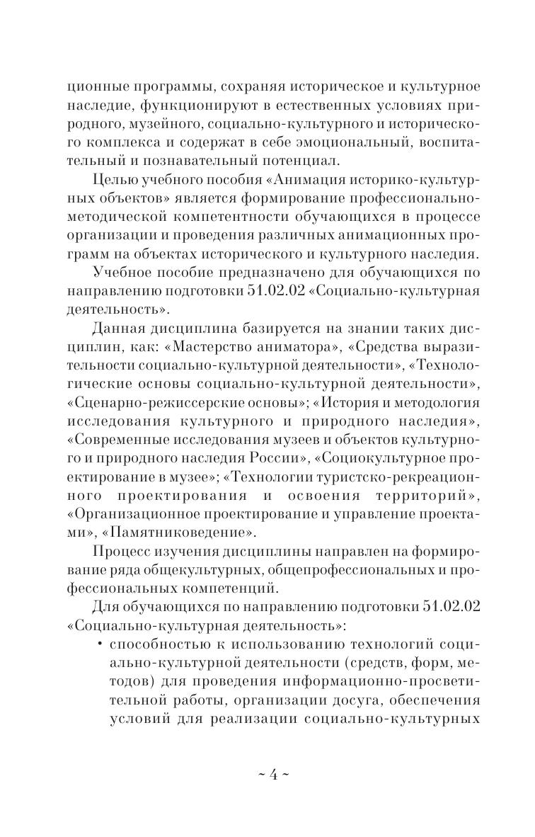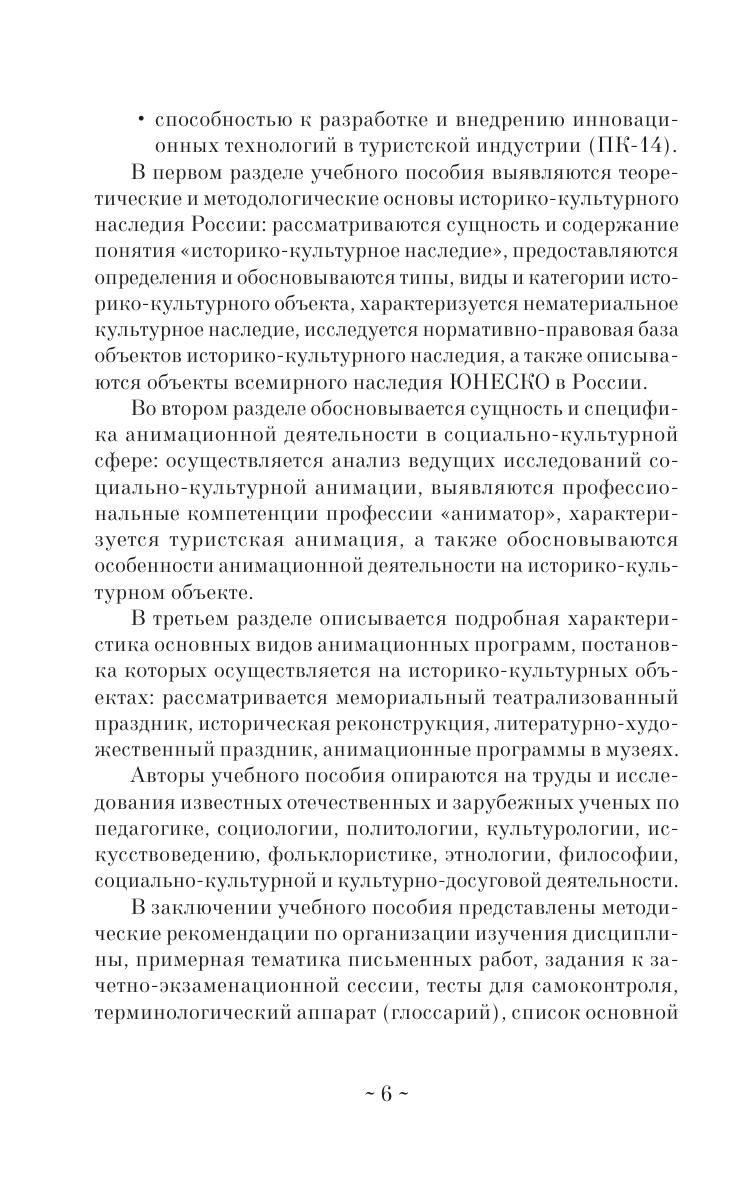 В учебном пособии раскрываются теоретико-методологические основы историко-культурного наследия России, выявляются сущность и специфика анимационной деятельности в социально-культурной сфере, характеризуются виды анимационных программ на историко-культурных объектах. Предлагаются методические рекомендации по организации изучения дисциплины, примерная тематика письменных работ, задания для зачетно-экзаменационной сессии, тесты для самоконтроля, терминологический аппарат (глоссарий), список основной и дополнительной литературы, материально-техническое обеспечение учебной дисциплины.