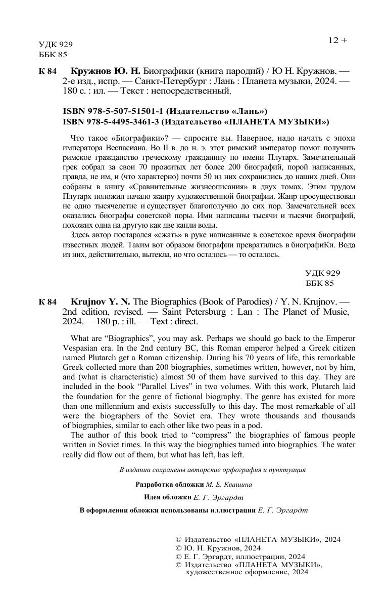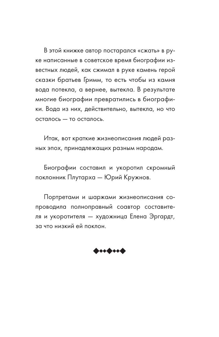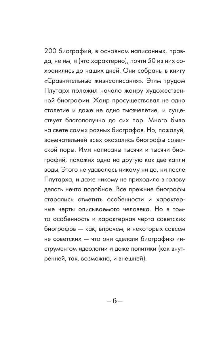 Что такое «Биографики»? – спросите вы. Наверное, надо начать с эпохи императора Веспасиана. Во II в. до н. э. этот римский император помог получить римское гражданство греческому гражданину по имени Плутарх. Замечательный грек собрал за свои 70 прожитых лет более 200 биографий, порой написанных, правда, не им, и (что характерно), почти 50 из них сохранились до наших дней. Они собраны в книгу «Сравнительные жизнеописания» в двух томах. Этим трудом Плутарх положил начало жанру художественной биографии. Жанр просуществовал не одно тысячелетие и существует благополучно до сих пор. Замечательней всех оказались биографы советской поры. Ими написаны тысячи и тысячи биографий, похожих одна на другую как две капли воды. Здесь автор постарался «сжать» в руке написанные в советское время биографии известных людей. Таким вот образом биографии превратились в биографиКи. Вода из них, действительно, вытекла, но что осталось – то осталось. What are “Biographics”, you may ask. Perhaps we should go back to the Emperor Vespasian era. In the 2nd century BC, this Roman emperor helped a Greek citizen named Plutarch get a Roman citizenship. During his 70 years of life, this remarkable Greek collected more than 200 biographies, sometimes written, however, not by him, and (what is characteristic) almost 50 of them have survived to this day. They are included in the book “Parallel Lives” in two volumes. With this work, Plutarch laid the foundation for the genre of fictional biography. The genre has existed for more than one millennium and exists successfully to this day. The most remarkable of all were the biographers of the Soviet era. They wrote thousands and thousands of biographies, similar to each other like two peas in a pod. The author of this book tried to “compress” the biographies of famous people written in Soviet times. In this way the biographies turned into biographics. The water really did flow out of them, but what has left, has left.