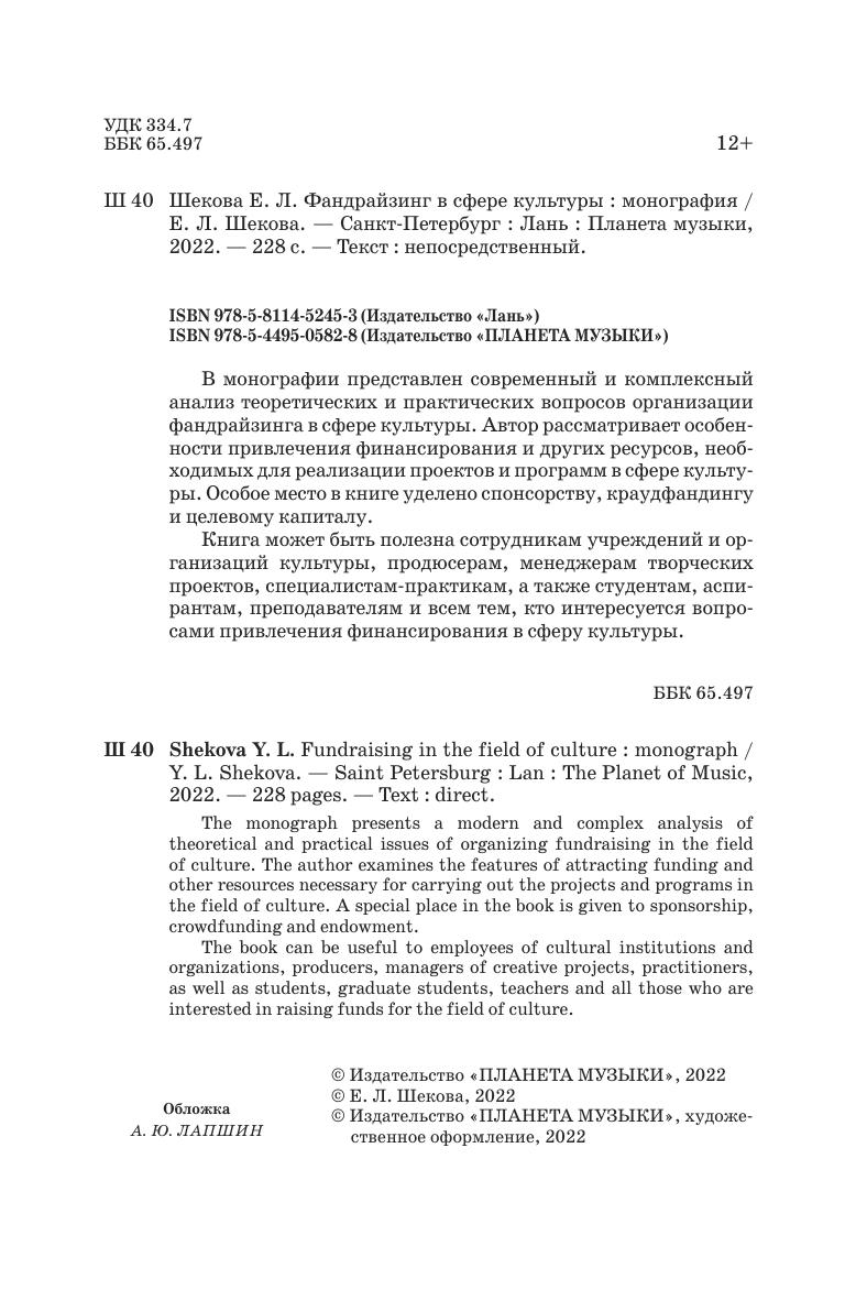 В монографии представлен современный и комплексный анализ теоретических и практических вопросов организации фандрайзинга в сфере культуры. Автор рассматривает особенности привлечения финансирования и других ресурсов, необходимых для реализации проектов и программ в сфере культуры. Особое место в книге уделено спонсорству, краудфандингу и целевому капиталу.