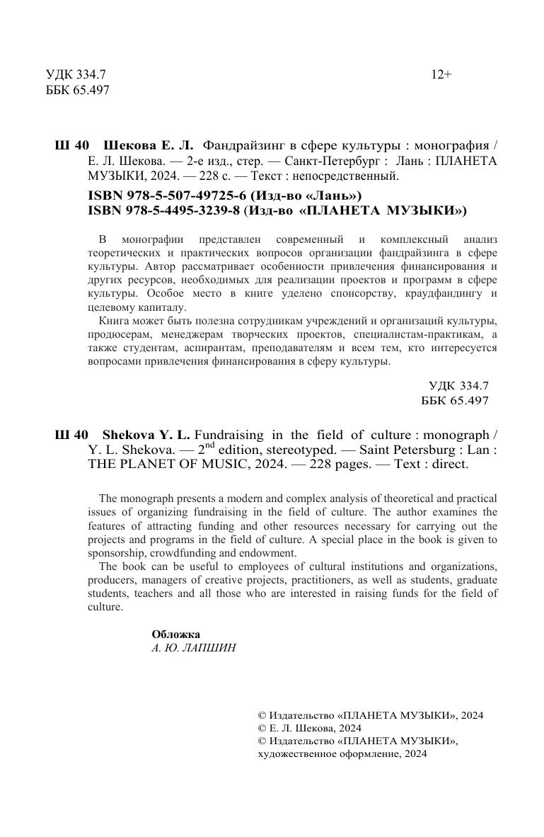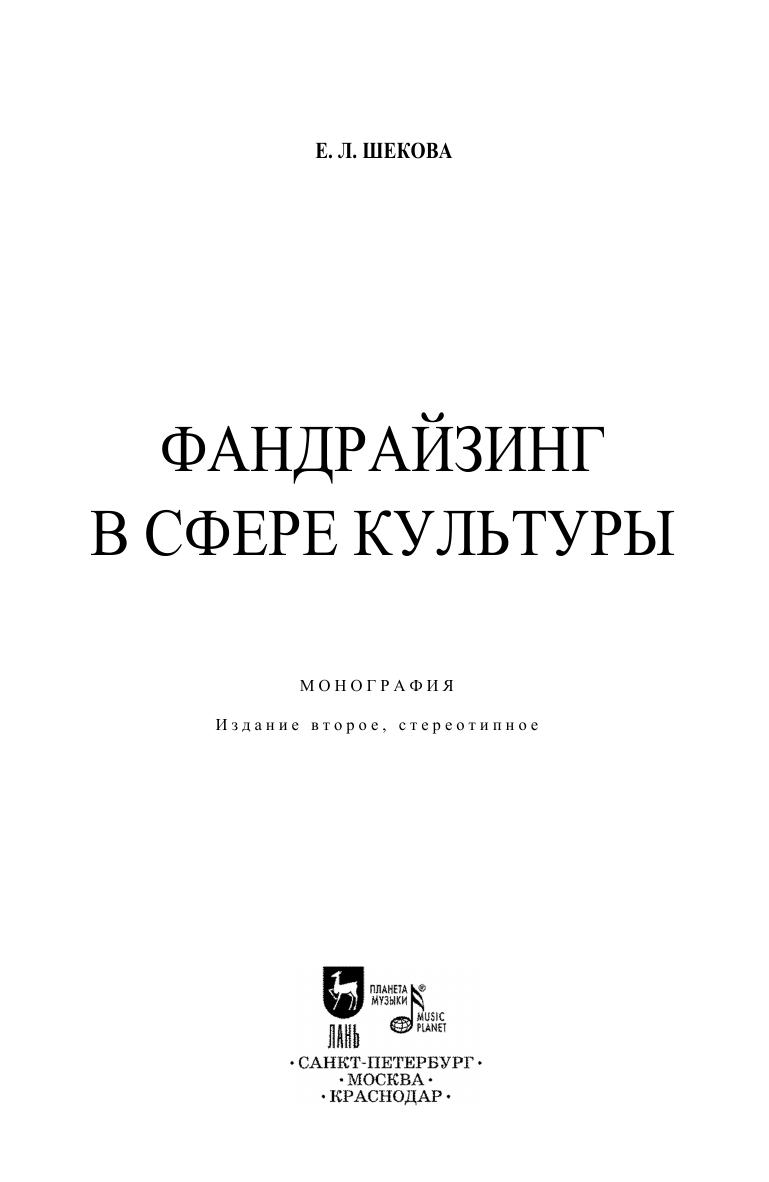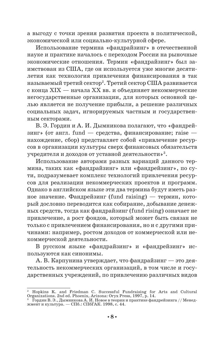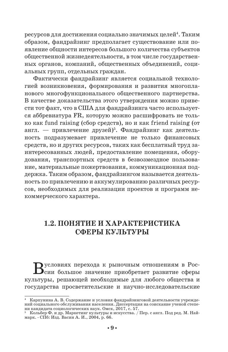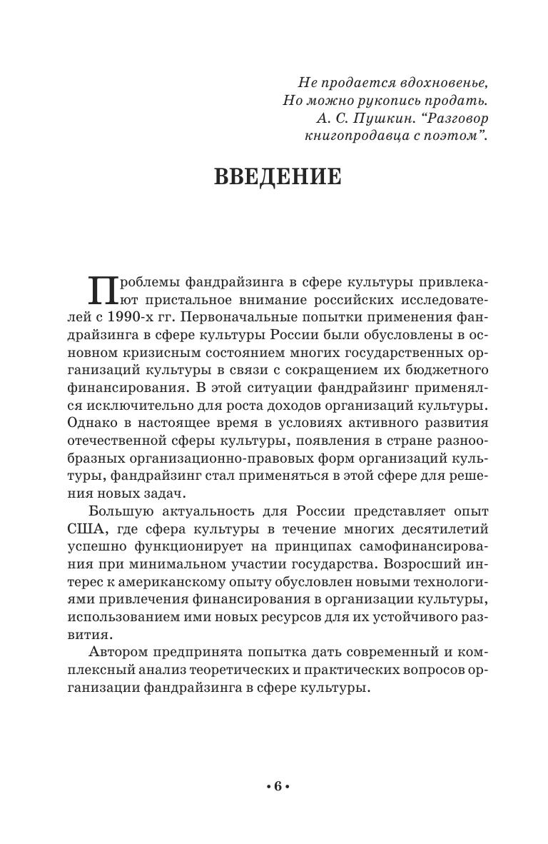 В монографии представлен современный и комплексный анализ теоретических и практических вопросов организации фандрайзинга в сфере культуры. Автор рассматривает особенности привлечения финансирования и других ресурсов, необходимых для реализации проектов и программ в сфере культуры. Особое место в книге уделено спонсорству, краудфандингу и целевому капиталу. Книга может быть полезна сотрудникам учреждений и организаций культуры, продюсерам, менеджерам творческих проектов, специалистам-практикам, а также студентам, аспирантам, преподавателям и всем тем, кто интересуется вопросами привлечения финансирования в сферу культуры. The monograph presents a modern and complex analysis of theoretical and practical issues of organizing fundraising in the field of culture. The author examines the features of attracting funding and other resources necessary for carrying out the projects and programs in the field of culture. A special place in the book is given to sponsorship, crowdfunding and endowment. The book can be useful to employees of cultural institutions and organizations, producers, managers of creative projects, practitioners, as well as students, graduate students, teachers and all those who are interested in raising funds for the field of culture.