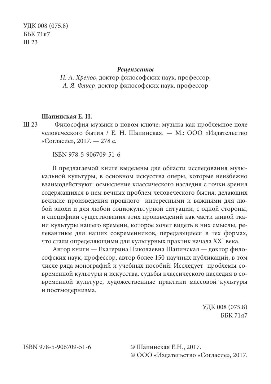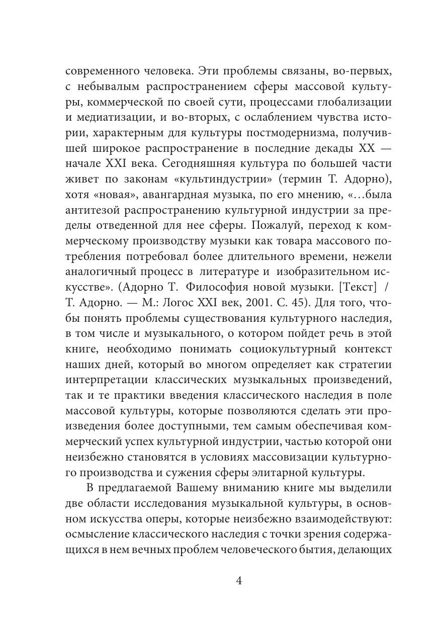 В предлагаемой книге выделены две области исследования музыкальной культуры, в основном искусства оперы, которые неизбежно взаимодействуют: осмысление классического наследия с точки зрения содержащихся в нем вечных проблем человеческого бытия, делающих великие произведения прошлого интересными и важными для любой эпохи и для любой социокультурной ситуации, с одной стороны, и специфики существования этих произведений как части живой ткани культуры нашего времени, которое хочет видеть в них смыслы, релевантные для наших современников, передающиеся в тех формах, что стали определяющими для культурных практик начала ХХI века. Автор книги — Екатерина Николаевна Шапинская — доктор философских наук, профессор, автор более 150 научных публикаций, в том числе ряда монографий и учебных пособий. Исследует проблемы современной культуры и искусства, судьбы классического наследия в современной культуре, художественные практики массовой культуры и постмодернизма.