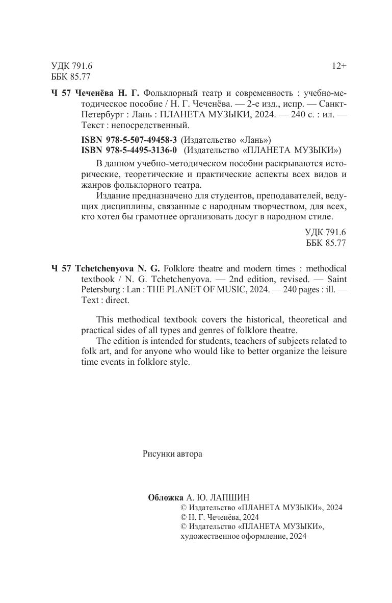 В данном учебно-методическом пособии раскрываются исторические, теоретические и практические аспекты всех видов и жанров фольклорного театра. Издание предназначено для студентов, преподавателей, ведущих дисциплины, связанные с народным творчеством, для всех, кто хотел бы грамотнее организовать досуг в народном стиле. This methodical textbook covers the historical, theoretical and practical sides of all types and genres of folklore theatre. The edition is intended for students, teachers of subjects related to folk art, and for anyone who would like to better organize the leisure time events in folklore style.