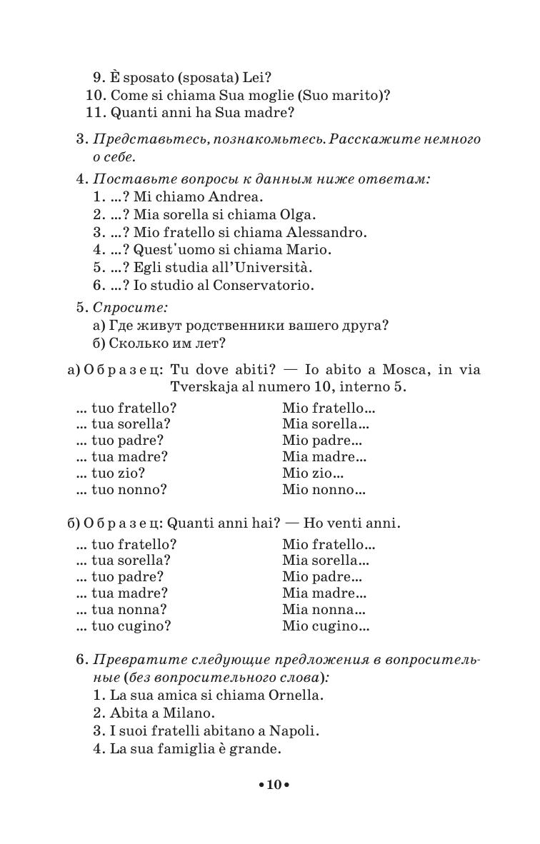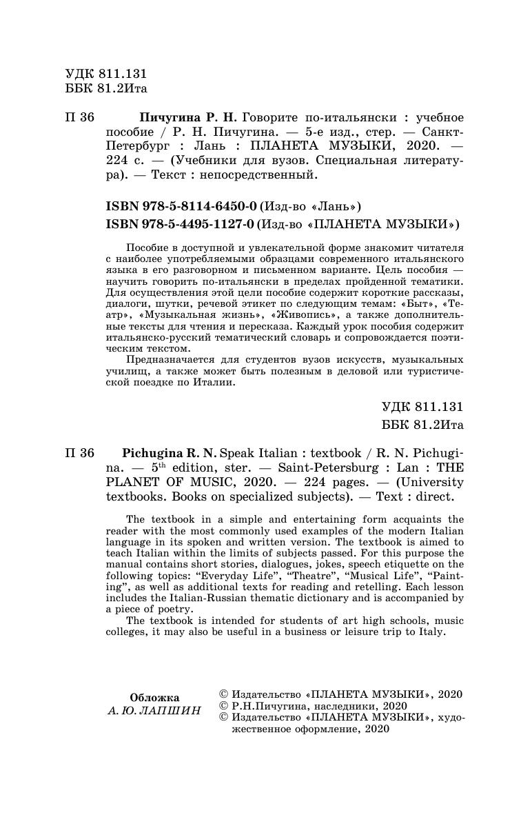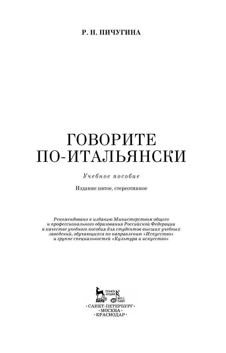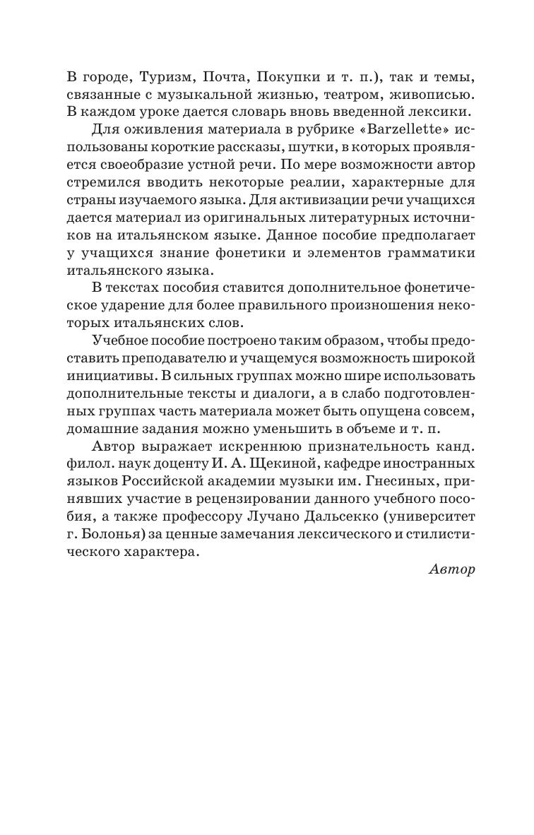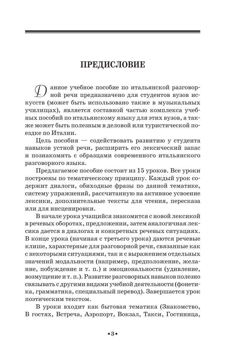 Пособие в доступной и увлекательной форме знакомит читателя с наиболее употребляемыми образцами современного итальянского языка в его разговорном и письменном варианте. Цель пособия – научить говорить по-итальянски в пределах пройденной тематики. Для осуществления этой цели пособие содержит короткие рассказы, диалоги, шутки, речевой этикет по следующим темам: «Быт», «Театр», «Музыкальная жизнь», «Живопись», а также дополнительные тексты для чтения и пересказа. Каждый урок пособия содержит итальянско-русский тематический словарь и сопровождается поэтическим текстом. Предназначается для студентов вузов искусств, музыкальных училищ, а также может быть полезным в деловой или туристической поездке по Италии.
