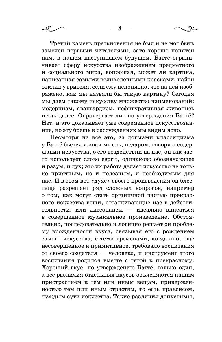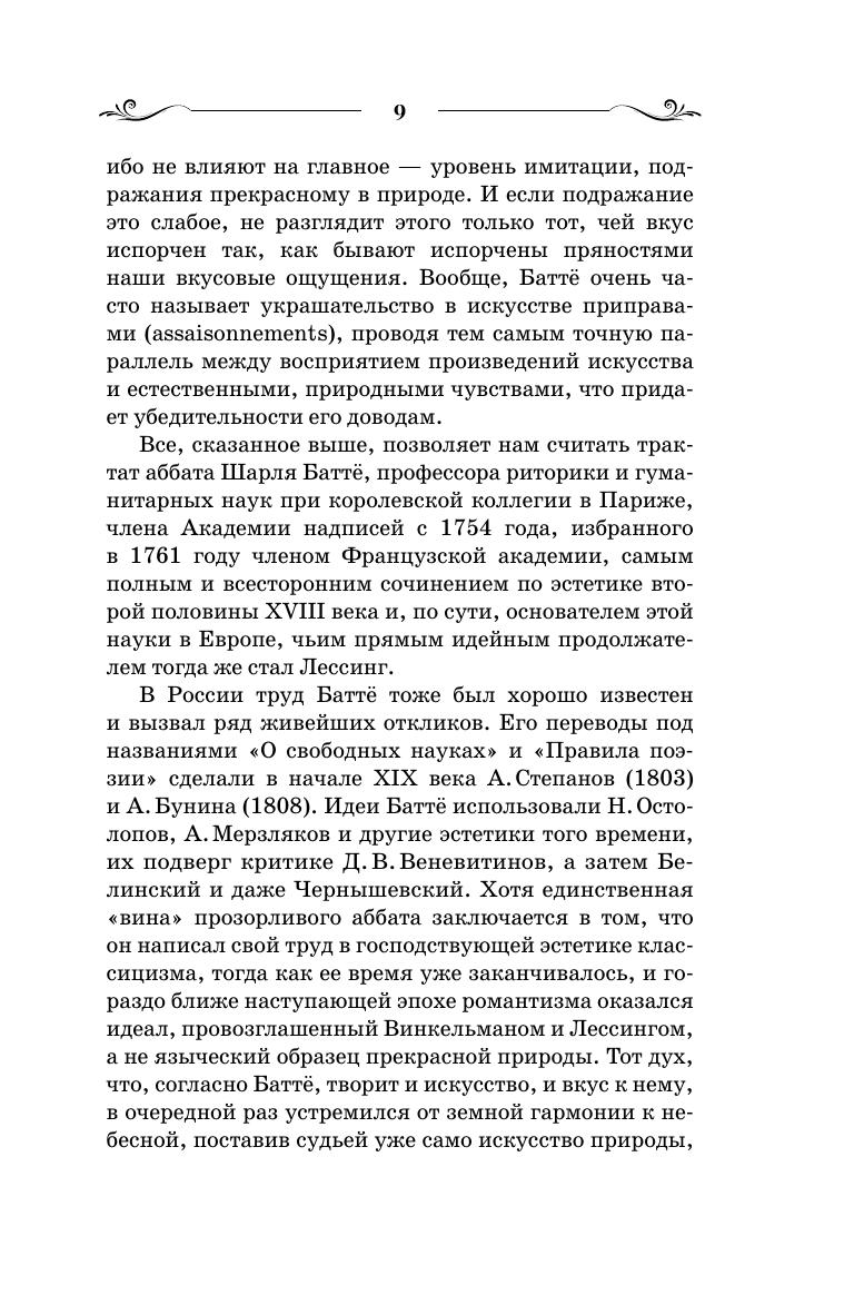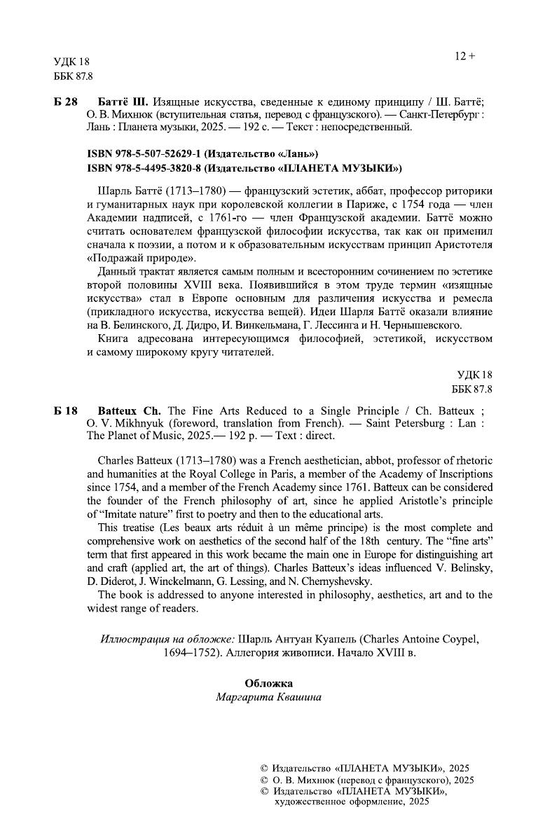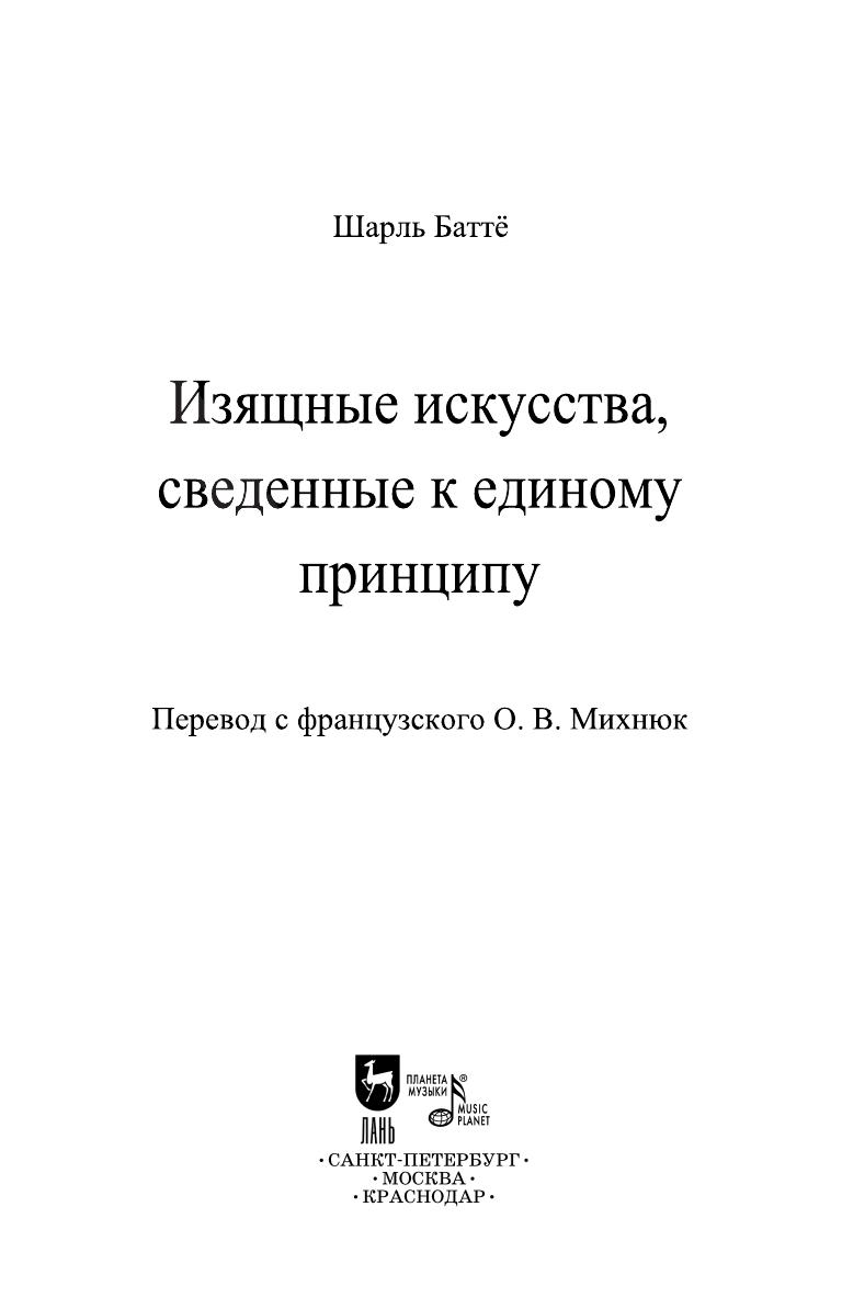 Шарль Батте (1713–1780) – французский эстетик, аббат, профессор риторики и гуманитарных наук при королевской коллегии в Париже, с 1754 года член Академии надписей, с 1761 член Французской академии. Баттё можно считать основателем французской философии искусства, так как он применил сначала к поэзии, потом к образовательным искусствам принцип Аристотеля: «подражай природе». Данный трактат является самым полным и всесторонним сочинением по эстетике второй половины XVIII века. Появившийся в этом труде термин «изящные искусства» стал в Европе основным для различения искусства и ремесла (прикладного искусства, искусства вещей). Идеи Шарля Баттё оказали влияние на: Виссариона Белинского, Дени Дидро, Иоганна Винкельмана, Готхольда Лессинга и Николая Чернышевского. Книга адресована интересующимся философией, эстетикой, искусством и самому широкому кругу читателей. Charles Batteux (1713–1780) was a French aesthetician, abbot, professor of rhetoric and humanities at the Royal College in Paris, a member of the Academy of Inscriptions since 1754, and a member of the French Academy since 1761. Batteux can be considered the founder of the French philosophy of art, since he applied Aristotle’s principle of “Imitate nature” first to poetry and then to the educational arts. This treatise (Les beaux arts réduit à un même principe) is the most complete and comprehensive work on aesthetics of the second half of the 18th century. The “fine arts” term that first appeared in this work became the main one in Europe for distinguishing art and craft (applied art, the art of things). Charles Batteux’s ideas influenced V. Belinsky, D. Diderot, J. Winckelmann, G. Lessing, and N. Chernyshevsky. The book is addressed to anyone interested in philosophy, aesthetics, art and to the widest range of readers.