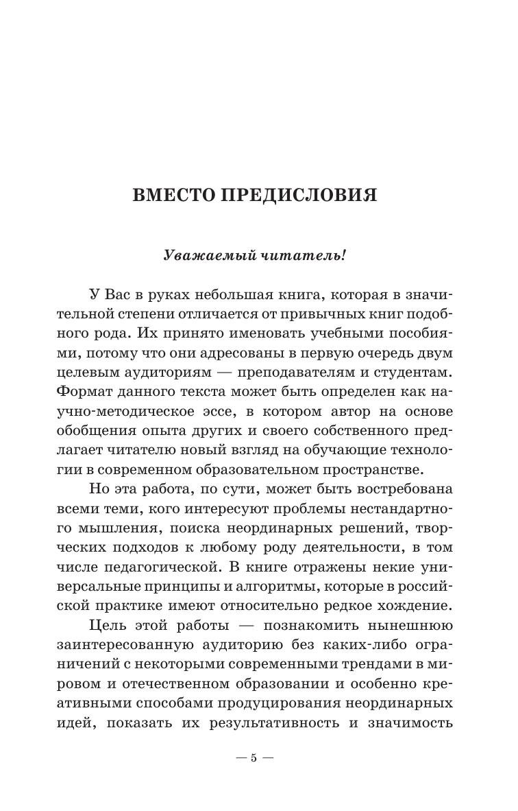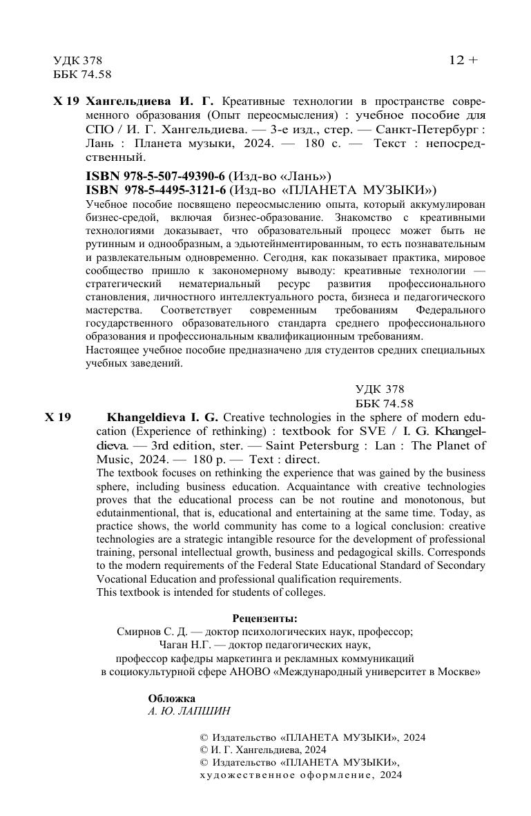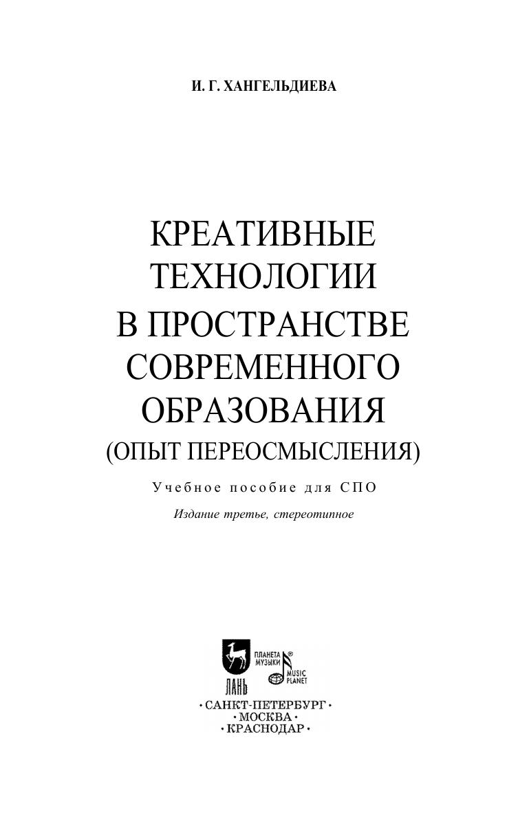Настоящее учебное пособие посвящено переосмыслению опыта, который аккумулирован бизнес-средой, включая бизнес-образование. Креативные технологии могут помочь ответить на вопросы: почему в жизни есть креаторы и аутсайдеры, почему у одних получается все, а у других – ничего? являются ли креаторы особой кастой? Знакомство с креативными технологиями доказывает, что образовательный процесс может быть не рутинным и однообразным, а эдьютейнментированным, то есть познавательным и развлекательным одновременно. Сегодня, как показывает практика, мировое сообщество пришло к закономерному выводу: креативные технологии – стратегический нематериальный ресурс развития профессионального становления, личностного интеллектуального роста, бизнеса и педагогического мастерства. Настоящее учебное пособие предназначено для студентов средних специальных учебных заведений. The textbook focuses on rethinking the experience that was gained by the business sphere, including business education. Acquaintance with creative technologies proves that the educational process can be not routine and monotonous, but edutainmentional, that is, educational and entertaining at the same time. Today, as practice shows, the world community has come to a logical conclusion: creative technologies are a strategic intangible resource for the development of professional training, personal intellectual growth, business and pedagogical skills. The textbook is intended for the students of colleges.