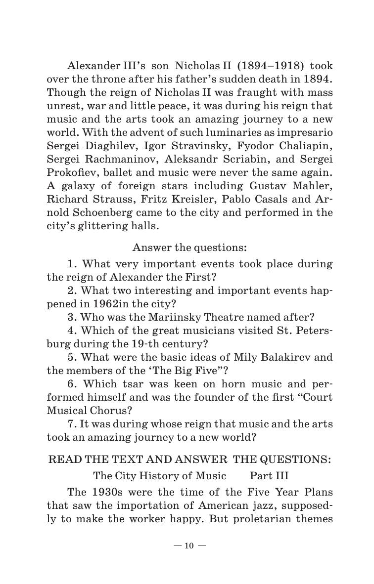 На материале текстов из периодической печати на английском языке, из брошюр конкурсов и фестивалей, а также интернет-сайтов студенты получат навыки чтения, перевода и пересказа, приобретут необходимую профессиональную лексику. В учебных целях некоторые тексты подвергнуты необходимым сокращениям.