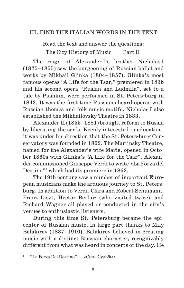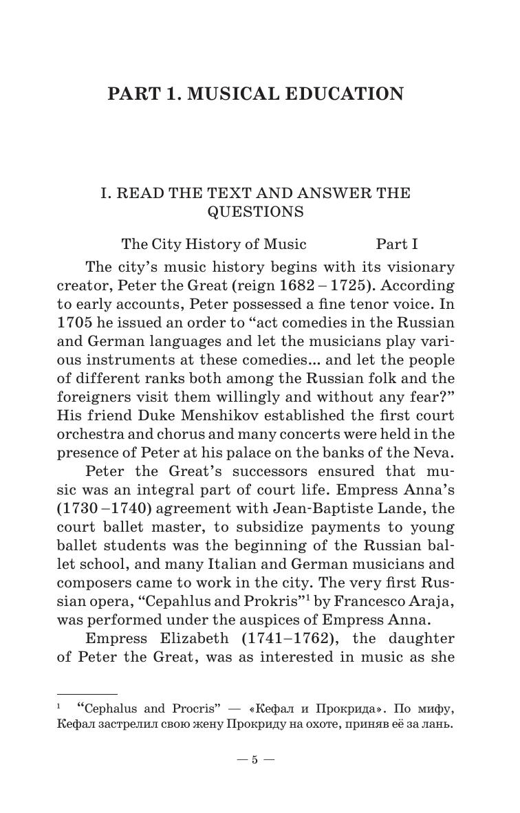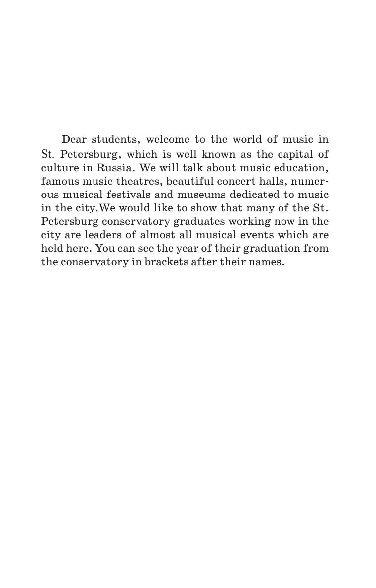 Данное учебное пособие предназначено для студентов I–II курсов всех факультетов консерватории. Пособие ставит своей целью познакомить студентов с разнообразными музыкальными событиями Санкт-Петербурга.