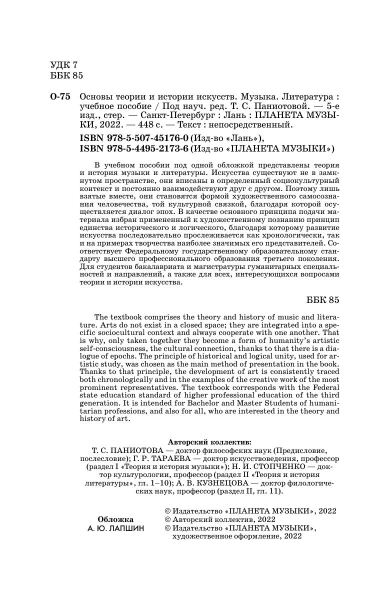 В учебном пособии под одной обложкой представлены теория и история музыки и литературы. Искусства существуют не в замкнутом пространстве, они вписаны в определенный социокультурный контекст и постоянно взаимодействуют друг с другом. Поэтому лишь взятые вместе, они становятся формой художественного самосознания человечества, той культурной связкой, благодаря которой осуществляется диалог эпох. В качестве основного принципа подачи материала избран примененный к художественному познанию принцип единства исторического и логического, благодаря которому развитие искусства последовательно прослеживается как хронологически, так и на примерах творчества наиболее значимых его представителей. Соответствует Федеральному государственному образовательному стандарту высшего профессионального образования третьего поколения. Для студентов бакалавриата и магистратуры гуманитарных специальностей и направлений, а также для всех, интересующихся вопросами теории и истории искусства.