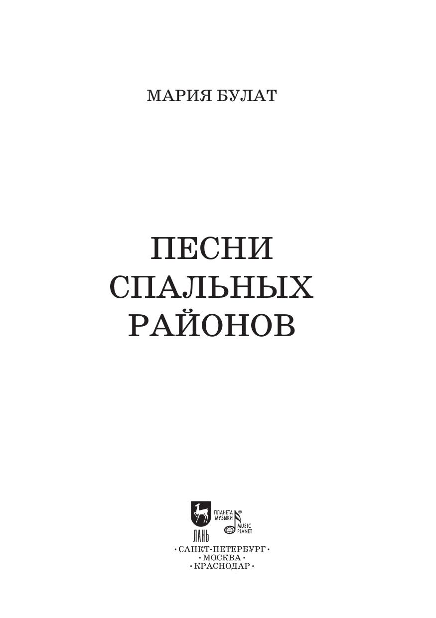 Мария Булат – питерский поэт, певица, автор текстов и вокалистка группы Дефекты Речи, автор песен проекта «Импрессионизм от авторской песни», лауреат многочисленных конкурсов, среди которых Всероссийский фестиваль авторской песни имени Валерия Грушина, член Московского союза писателя России, руководитель Школы природного голоса. В книге «Песни спальных районов» представлен творческий путь поэта, включающий в себя песенную лирику, философские, любовные, ироничные стихотворения, поэмы разных лет. Препарация чувств, точная передача оттенков страстей в сопряжении с тонким интеллектуализмом и совершенной поэтической формой, специфический драматизм и своеобразная «неженская» откровенность наполняют стихи Марии Булат.