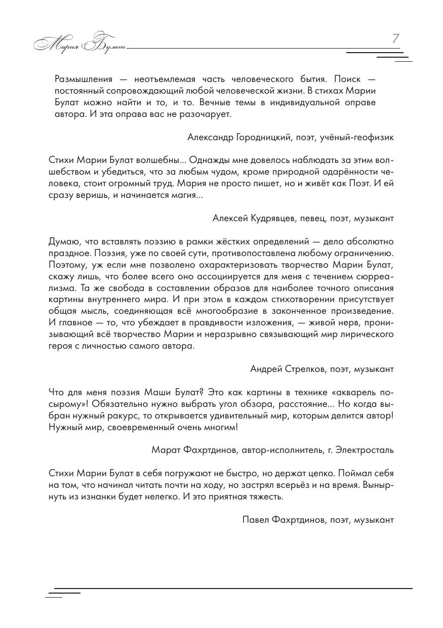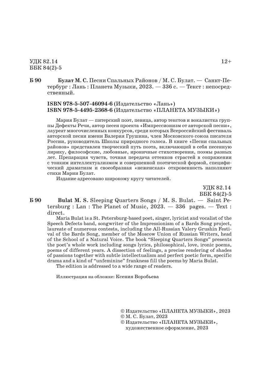 Maria Bulat is a St. Petersburg-based poet, singer, lyricist and vocalist of the Speech Defects band, songwriter of the Impressionism of a Bards Song project, laureate of numerous contests, including the All-Russian Valery Grushin Festival of the Bards Song, member of the Moscow Union of Russian Writers, head of the School of a Natural Voice. The book “Sleeping Quarters Songs” presents the poet’s whole work including songs lyrics, philosophical, love, ironic poems, poems of different years. A dissection of feelings, a precise rendering of shades of passions together with subtle intellectualism and perfect poetic form, specific drama and a kind of “unfeminine” frankness fill the poems by Maria Bulat.