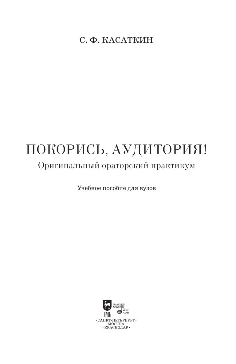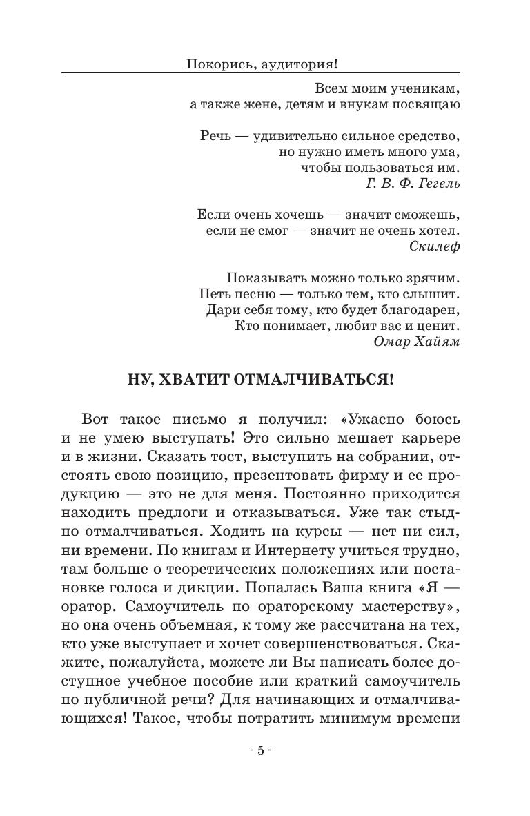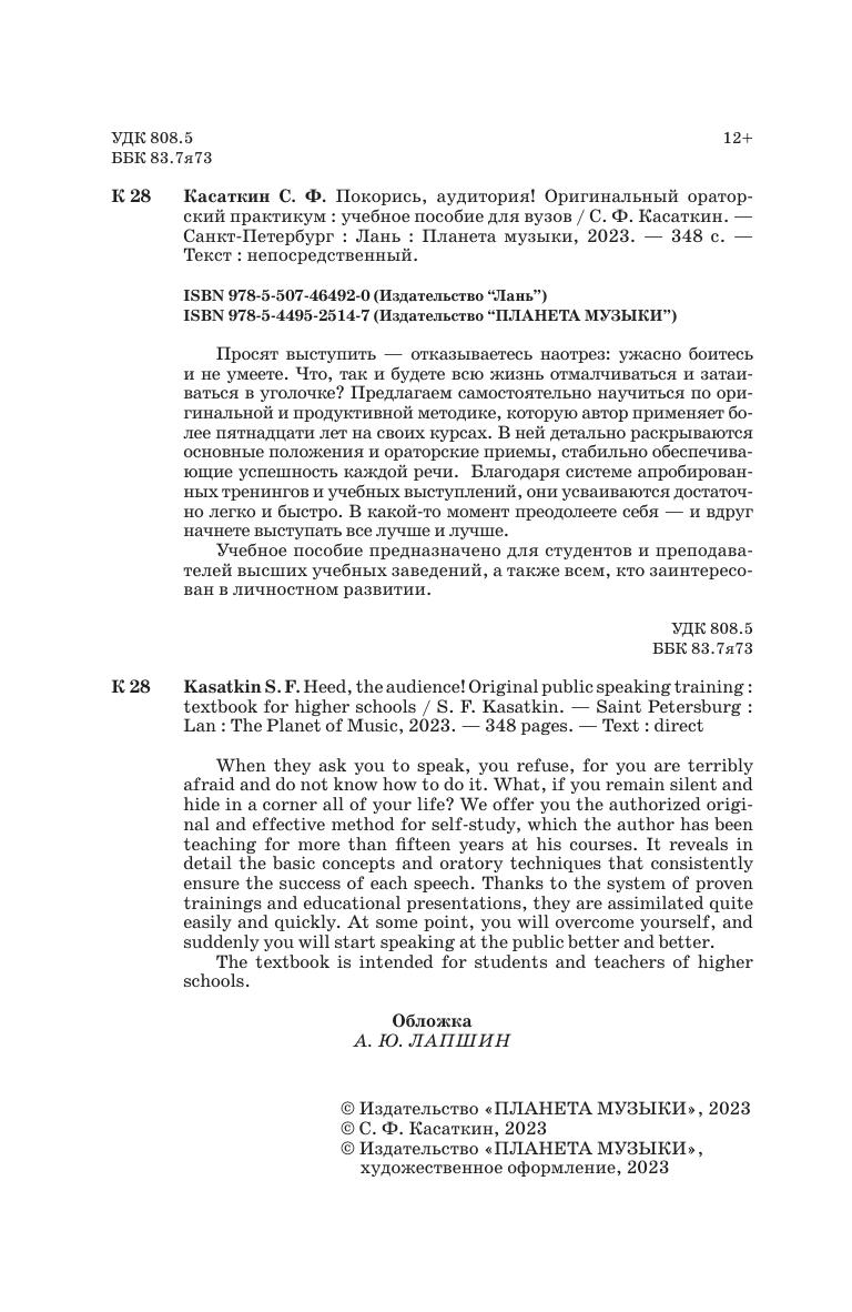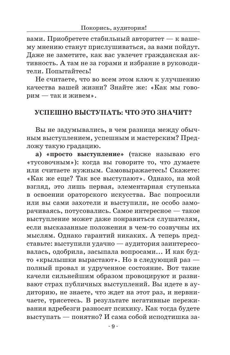 Просят выступить — отказываетесь наотрез: ужасно боитесь и не умеете. Что, так и будете всю жизнь отмалчиваться и затаиваться в уголочке? Предлагаем самостоятельно научиться по оригинальной и продуктивной методике, которую автор применяет более пятнадцати лет на своих курсах. В ней детально раскрываются основные положения и ораторские приемы, стабильно обеспечивающие успешность каждой речи. Благодаря системе апробированных тренингов и учебных выступлений, они усваиваются достаточно легко и быстро. В какой-то момент преодолеете себя — и вдруг начнете выступать все лучше и лучше. Учебное пособие предназначено для студентов и преподавателей высших учебных заведений. When they ask you to speak, you refuse, for you are terribly afraid and do not know how to do it. What, if you remain silent and hide in a corner all of your life? We offer you the authorized original and effective method for self-study, which the author has been teaching for more than fifteen years at his courses. It reveals in detail the basic concepts and oratory techniques that consistently ensure the success of each speech. Thanks to the system of proven trainings and educational presentations, they are assimilated quite easily and quickly. At some point, you will overcome yourself, and suddenly you will start speaking at the public better and better. The textbook is intended for students and teachers of higher schools.