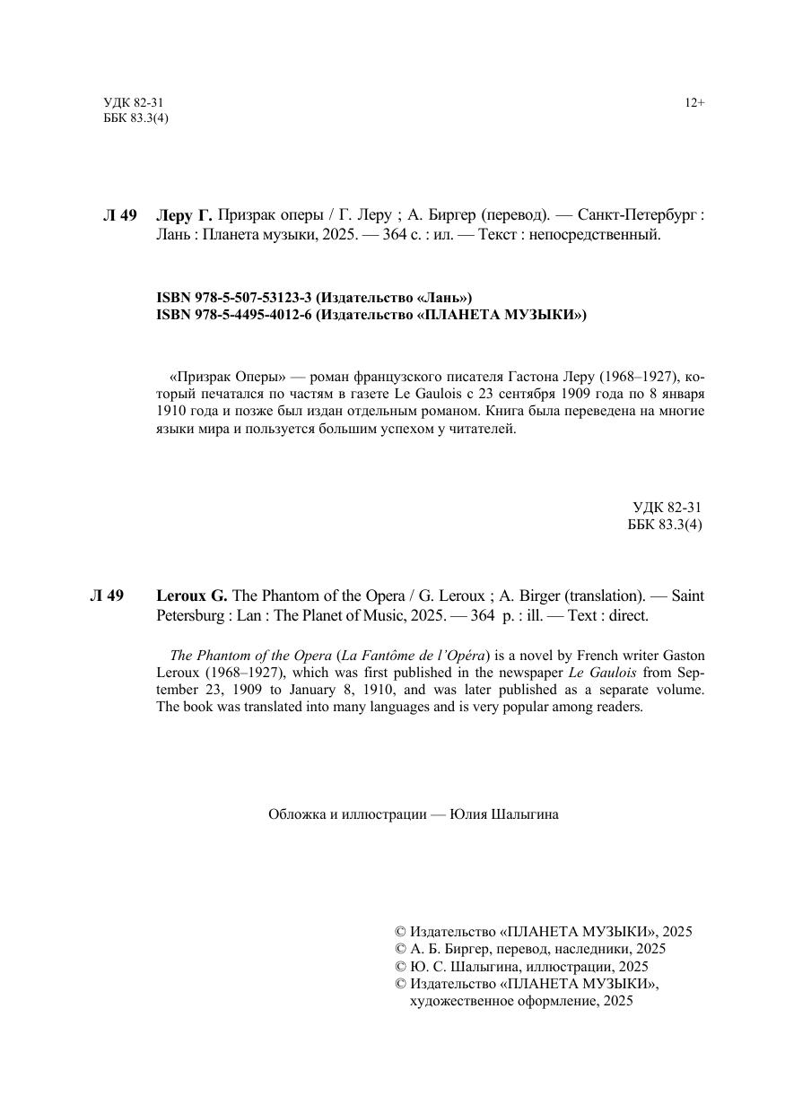 «Призрак Оперы» — роман французского писателя Гастона Леру (1968–1927), который печатался по частям в газете Le Gaulois с 23 сентября 1909 года по 8 января 1910 года и позже был издан отдельным романом. Книга была переведена на многие языки мира и пользуется большим успехом у читателей. The Phantom of the Opera (La Fantôme de l’Opéra) is a novel by French writer Gaston Leroux (1968–1927), which was first published in the newspaper Le Gaulois from September 23, 1909 to January 8, 1910, and was later published as a separate volume. The book was translated into many languages and is very popular among readers.