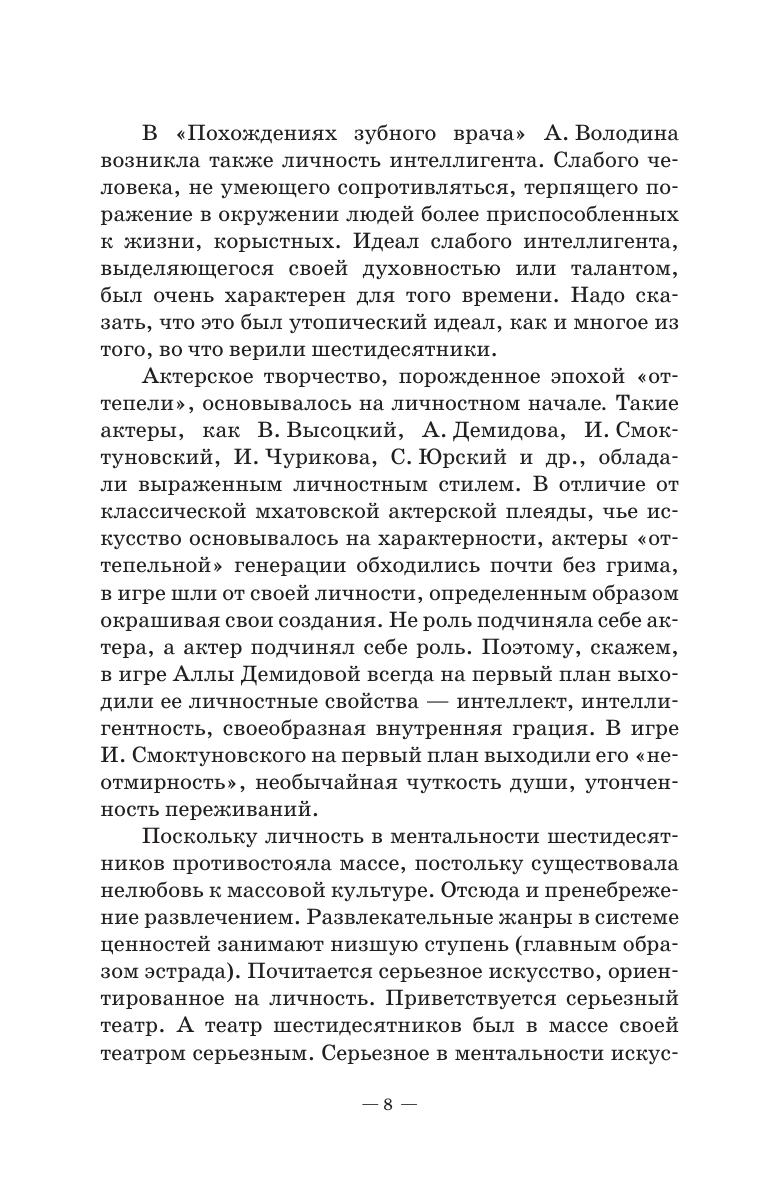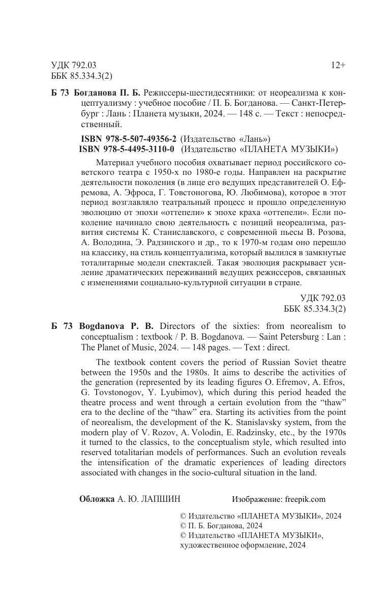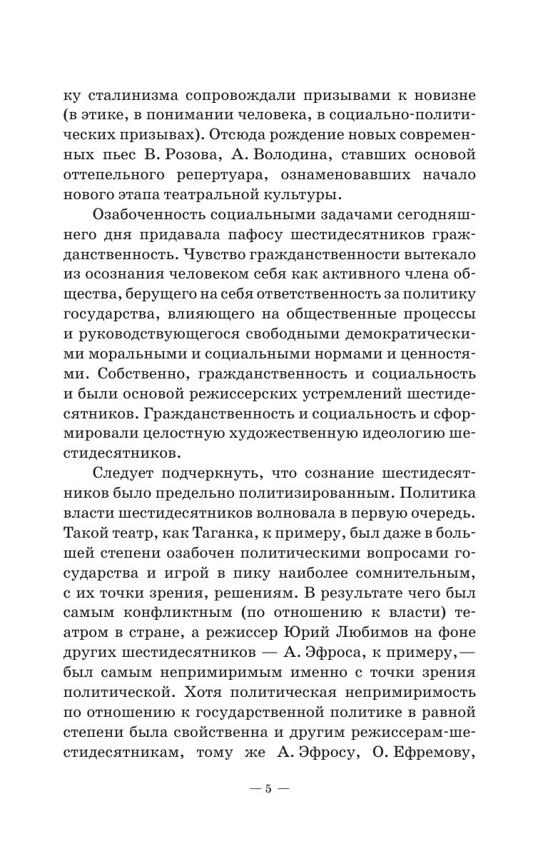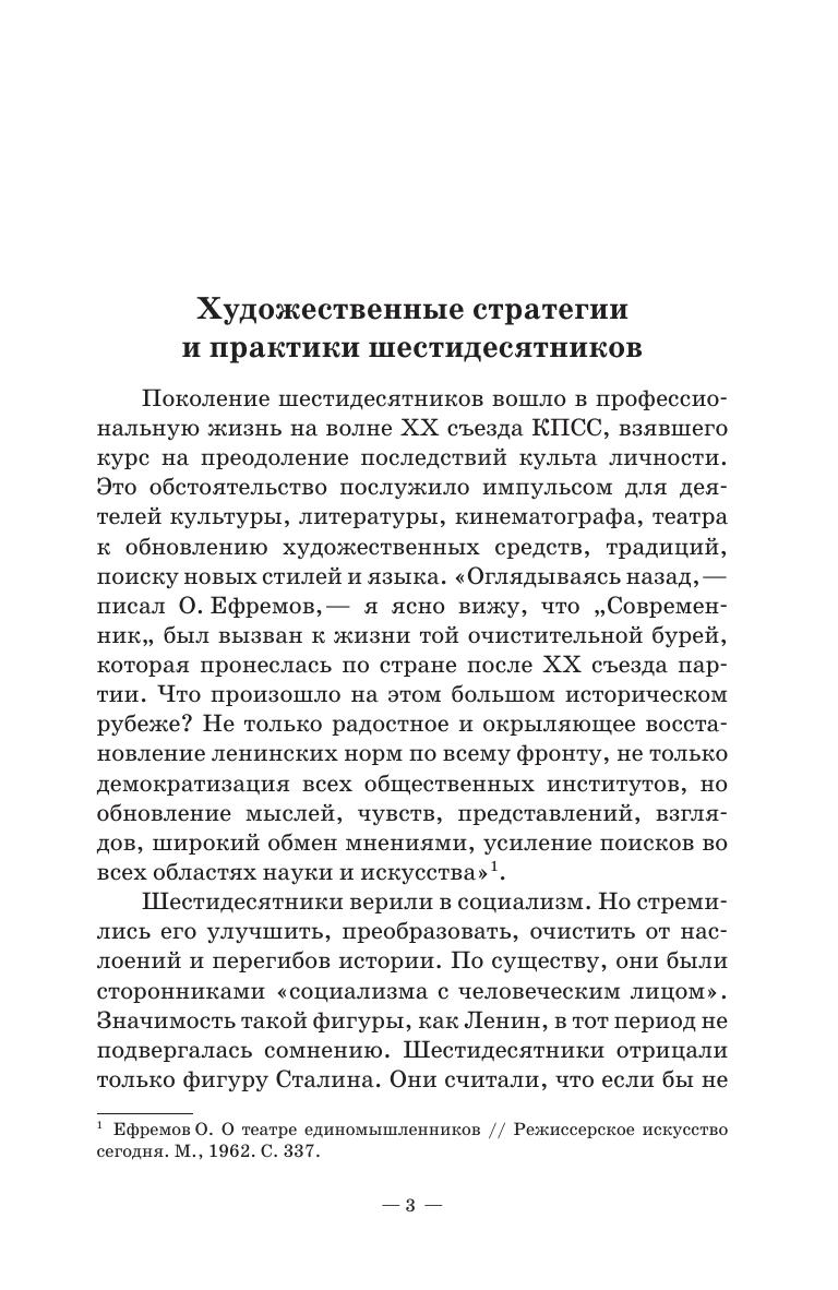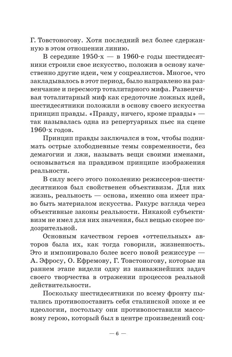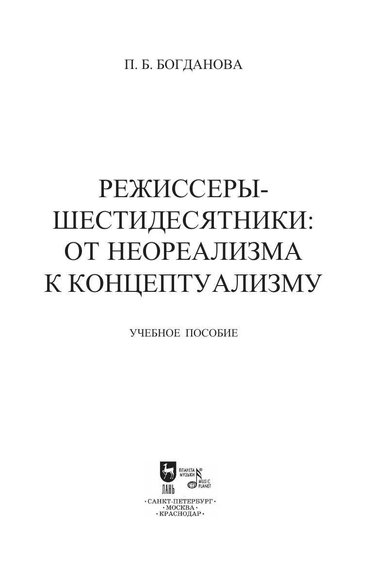 Материал учебного пособия охватывает период российского советского театра с 1950-х по 1980-е годы. Направлен на раскрытие деятельности поколения (в лице его ведущих представителей О. Ефремова, А. Эфроса, Г. Товстоногова, Ю. Любимова), которое в этот период возглавляло театральный процесс и прошло определенную эволюцию от эпохи «оттепели» к эпохе краха «оттепели». Если поколение начинало свою деятельность с позиций неореализма, развития системы К. Станиславского, с современной пьесы В. Розова, А. Володина, Э. Радзинского и др., то к 1970-м годам оно перешло на классику, на стиль концептуализма, который вылился в замкнутые тоталитарные модели спектаклей. Такая эволюция раскрывает усиление драматических переживаний ведущих режиссеров, связанных с изменениями социально-культурной ситуации в стране. The textbook content covers the period of Russian Soviet theatre between the 1950s and the 1980s. It aims to describe the activities of the generation (represented by its leading figures O. Efremov, A. Efros, G. Tovstonogov, Y. Lyubimov), which during this period headed the theatre process and went through a certain evolution from the “thaw” era to the decline of the “thaw” era. Starting its activities from the point of neorealism, the development of the K. Stanislavsky system, from the modern play of V. Rozov, A. Volodin, E. Radzinsky, etc., by the 1970s it turned to the classics, to the conceptualism style, which resulted into reserved totalitarian models of performances. Such an evolution reveals the intensification of the dramatic experiences of leading directors associated with changes in the socio-cultural situation in the land.