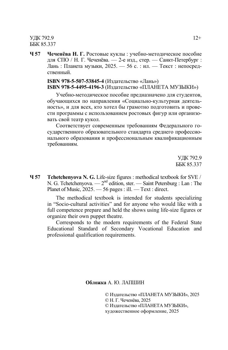 Учебно-методическое пособие предназначено для студентов, обучающихся по направления «Социально-культурная деятельность», и для всех, кто хотел бы грамотно подготовить и провести программы с использованием ростовых фигур или организовать свой театр кукол. Соответствует современным требованиям Федерального государственного образовательного стандарта среднего профессионального образования и профессиональным квалификационным требованиям. The methodical textbook is intended for students specializing in “Socio-cultural activities” and for anyone who would like with a full competence prepare and held the shows using life-size figures or organize their own puppet theatre. Corresponds to the modern requirements of the Federal State Educational Standard of Secondary Vocational Education and professional qualification requirements.