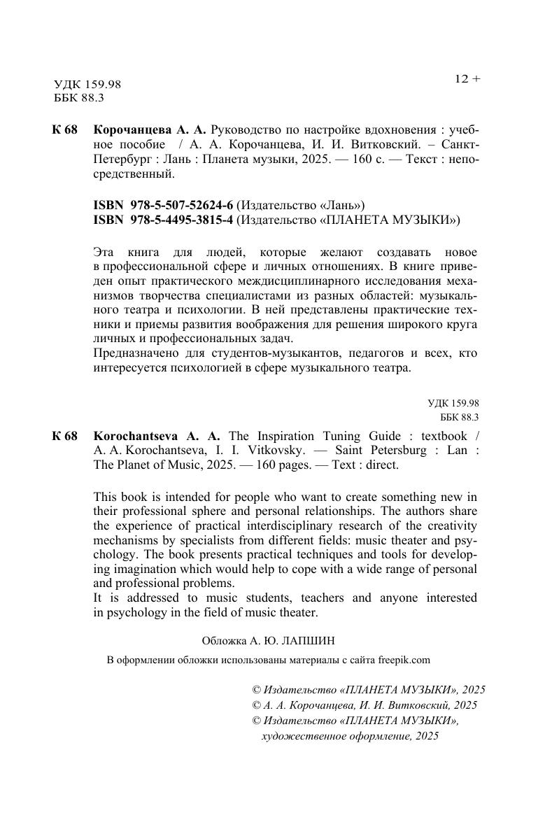 Эта книга для людей, которые желают создавать новое в профессиональной сфере и личных отношениях. В книге приведен опыт практического междисциплинарного исследования механизмов творчества специалистами из разных областей: музыкального театра и психологии. В ней представлены практические техники и приемы развития воображения для решения широкого круга личных и профессиональных задач. Предназначено для студентов-музыкантов, педагогов и всех, кто интересуется психологией в сфере музыкального театра. This book is intended for people who want to create something new in their professional sphere and personal relationships. The authors share the experience of practical interdisciplinary research of the creativity mechanisms by specialists from different fields: music theater and psy-chology. The book presents practical techniques and tools for developing imagination which would help to cope with a wide range of personal and professional problems. It is addressed to music students, teachers and anyone interested in psychology in the field of music theater.