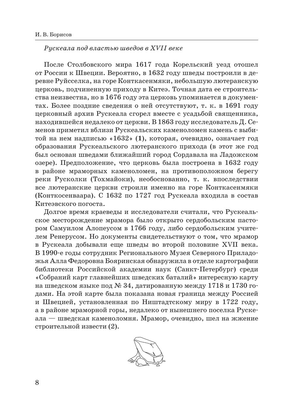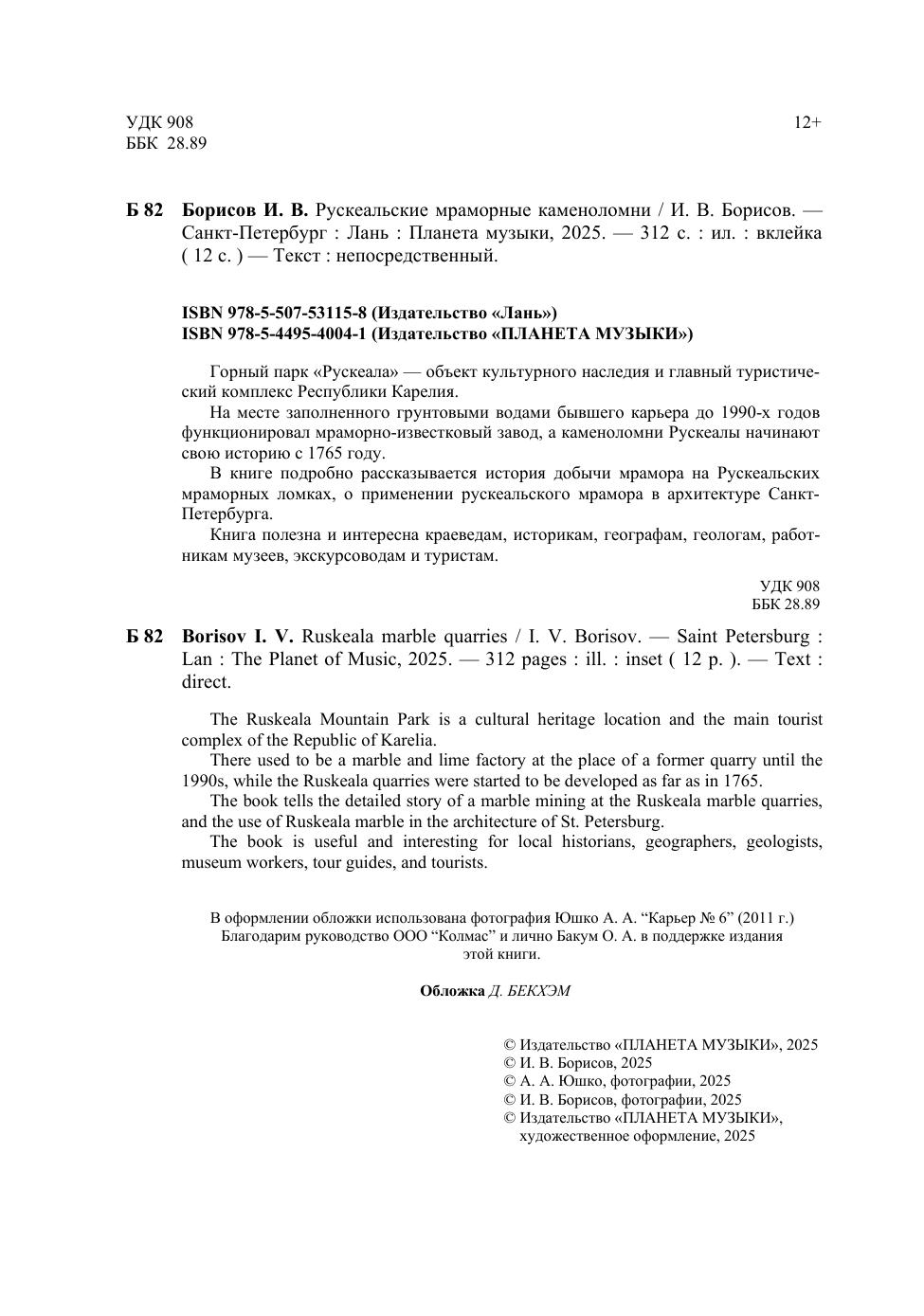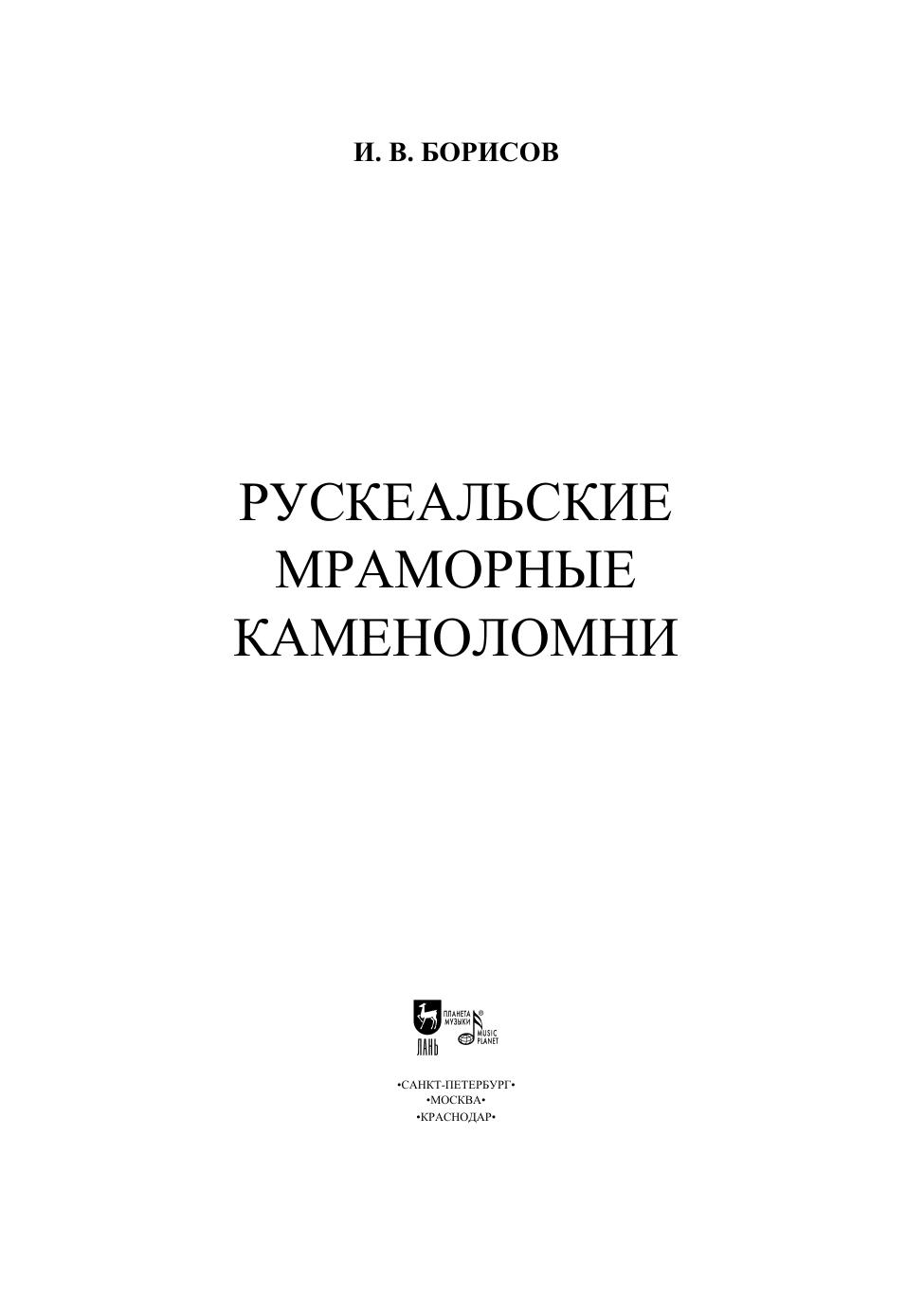 Горный парк «Рускеала» — объект культурного наследия и главный туристический комплекс Республики Карелия. На месте заполненного грунтовыми водами бывшего карьера до 1990-х годов функционировал мраморно-известковый завод, а каменоломни Рускеалы начинают свою историю с 1765 году. В книге подробно рассказывается история добычи мрамора на Рускеальских мраморных ломках, о применении рускеальского мрамора в архитектуре Санкт-Петербурга. Книга полезна и интересна краеведам, историкам, географам, геологам, работникам музеев, экскурсоводам и туристам. Рекомендуется студентам, обучающимся по направлениям «Прикладная геология, горное дело, нефтегазовое дело и геодезия», «Архитектура», а также преподавателям. The Ruskeala Mountain Park is a cultural heritage location and the main tourist complex of the Republic of Karelia. There used to be a marble and lime factory at the place of a former quarry until the 1990s, while the Ruskeala quarries were started to be developed as far as in 1765. The book tells the detailed story of a marble mining at the Ruskeala marble quarries, and the use of Ruskeala marble in the architecture of St. Petersburg. The book is useful and interesting for local historians, geographers, geologists, museum workers, tour guides, and tourists.