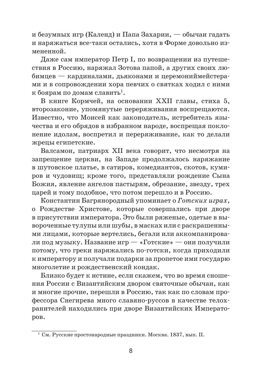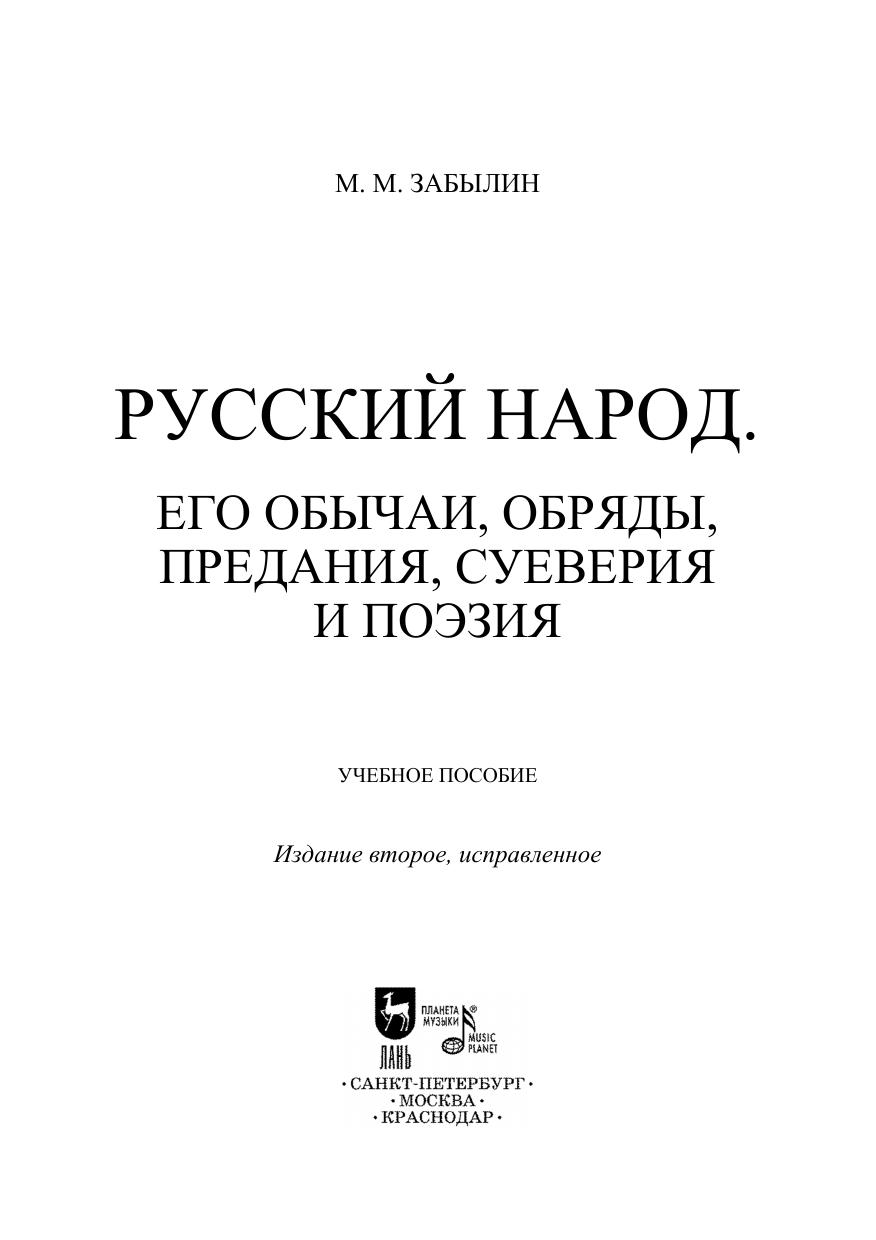 Книга, впервые напечатанная в 1880 году (Издание М. Березина, Москва), содержит сведения о русских праздниках, обрядах, суевериях и предрассудках, домашней жизни, народной медицине, приметах, пословицах, поговорках, песнях и музыке. В труде Забылина – выдающегося русского этнографа второй половины XIX века и знатока народного быта, заложившего основы отечественного народоведения – рассказывается об охоте и досуге, старинном травнике и народном цветнике, одежде, о колдунах, ведьмах и другой нечистой силе. Пособие отражает главные вехи в развитии русского образа жизни – понятий, труда, быта, жилища, одежды – воплощенного в материальных памятниках, искусстве, праве, языке и фольклоре. The book, first published in 1880 (by M. Berezin Publishing, Moscow), provides information on Russian holidays, rituals, superstitions and prejudices, home life, folk medicine, signs, proverbs, sayings, songs and music. The author, being an outstanding Russian ethnographer of the second half of the 19th century and the folk life expert, who laid the foundations of Russian folklore studies, talks in his book about hunting and leisure, an old herbalist and folk flower garden, clothing, sorcerers, witches and other evil spirits. The textbook reflects the milestones in the evolution of the Russian way of life, i.e. concepts, work, everyday life, housing, clothing, embodied in material artifacts, arts, law, language and folklore.
