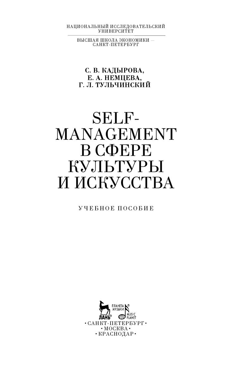 Appealing to self-management as a multilevel process of self-organization and self-fulfillment opens new prospects for personal development, self-determination and professional progress. The textbook offers an opportunity to form and realize one’s life strategy and mission, based on the concept of the individual as self projection, and taking responsibility for its realization. It consists of theoretic part and practicum on self-management. The textbook is intended firstly for the students of art and culture universities and may be also interesting for young professionals and all, who are interested in self-management and self-promotion.