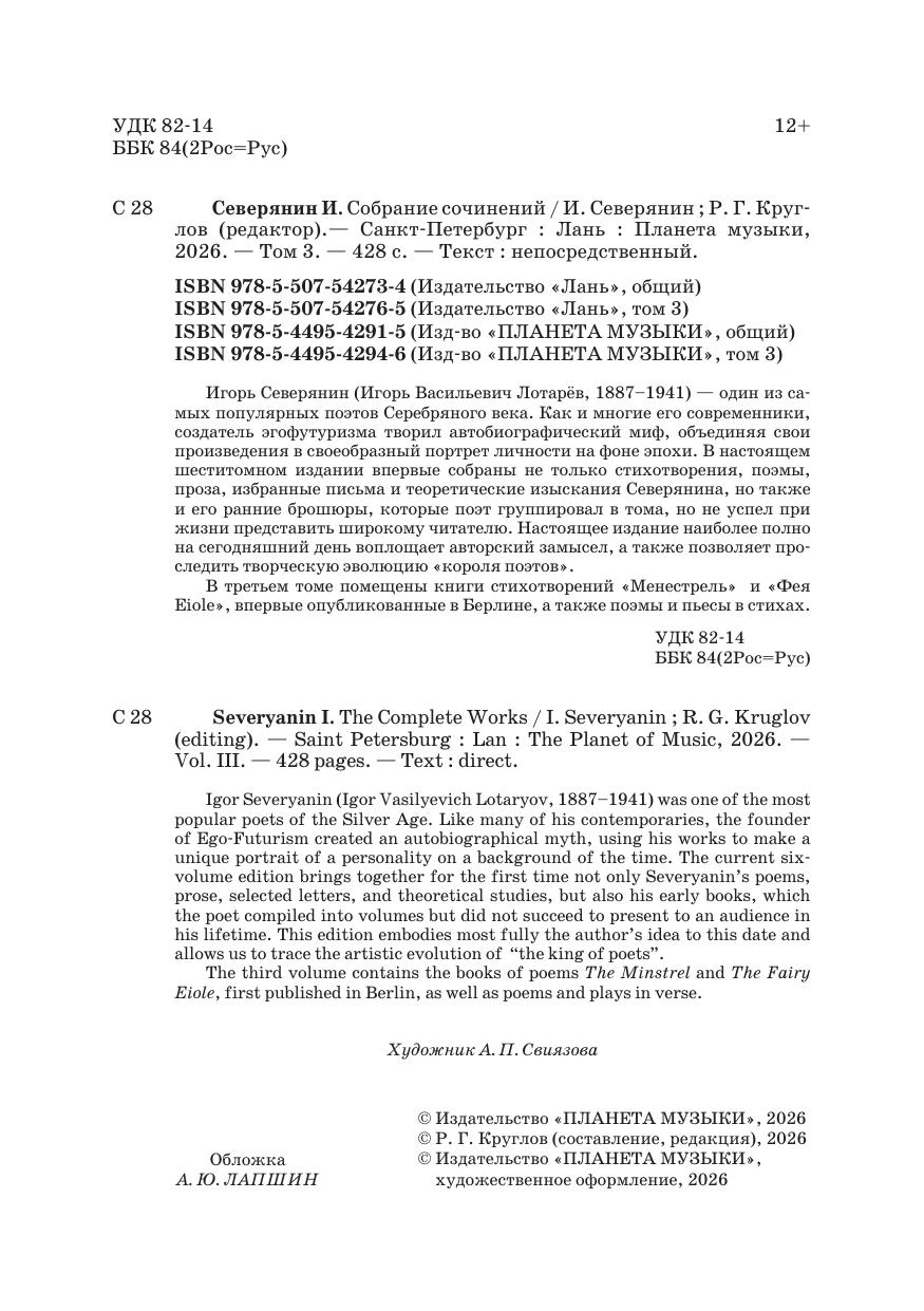 Игорь Северянин (Игорь Васильевич Лотарёв, 1887–1941) — один из самых популярных поэтов Серебряного века. Как и многие его современники, создатель эгофутуризма творил автобиографический миф, объединяя свои произведения в своеобразный портрет личности на фоне эпохи. В настоящем шеститомном издании впервые собраны не только стихотворения, поэмы, проза, избранные письма и теоретические изыскания Северянина, но также и его ранние брошюры, которые поэт группировал в тома, но не успел при жизни представить широкому читателю. Настоящее издание наиболее полно на сегодняшний день воплощает авторский замысел, а также позволяет проследить творческую эволюцию «короля поэтов». В третьем томе помещены книги стихотворений «Менестрель» и «Фея Eiole», впервые опубликованные в Берлине, а также поэмы и пьесы в стихах. Igor Severyanin (Igor Vasilyevich Lotaryov, 1887–1941) was one of the most popular poets of the Silver Age. Like many of his contemporaries, the founder of Ego-Futurism created an autobiographical myth, using his works to make a unique portrait of a personality on a background of the time. The current six-volume edition brings together for the first time not only Severyanin’s poems, prose, selected letters, and theoretical studies, but also his early books, which the poet compiled into volumes but did not succeed to present to an audience in his lifetime. This edition embodies most fully the author’s idea to this date and allows us to trace the artistic evolution of “the king of poets”. The third volume contains the books of poems The Minstrel and The Fairy Eiole, first published in Berlin, as well as poems and plays in verse.