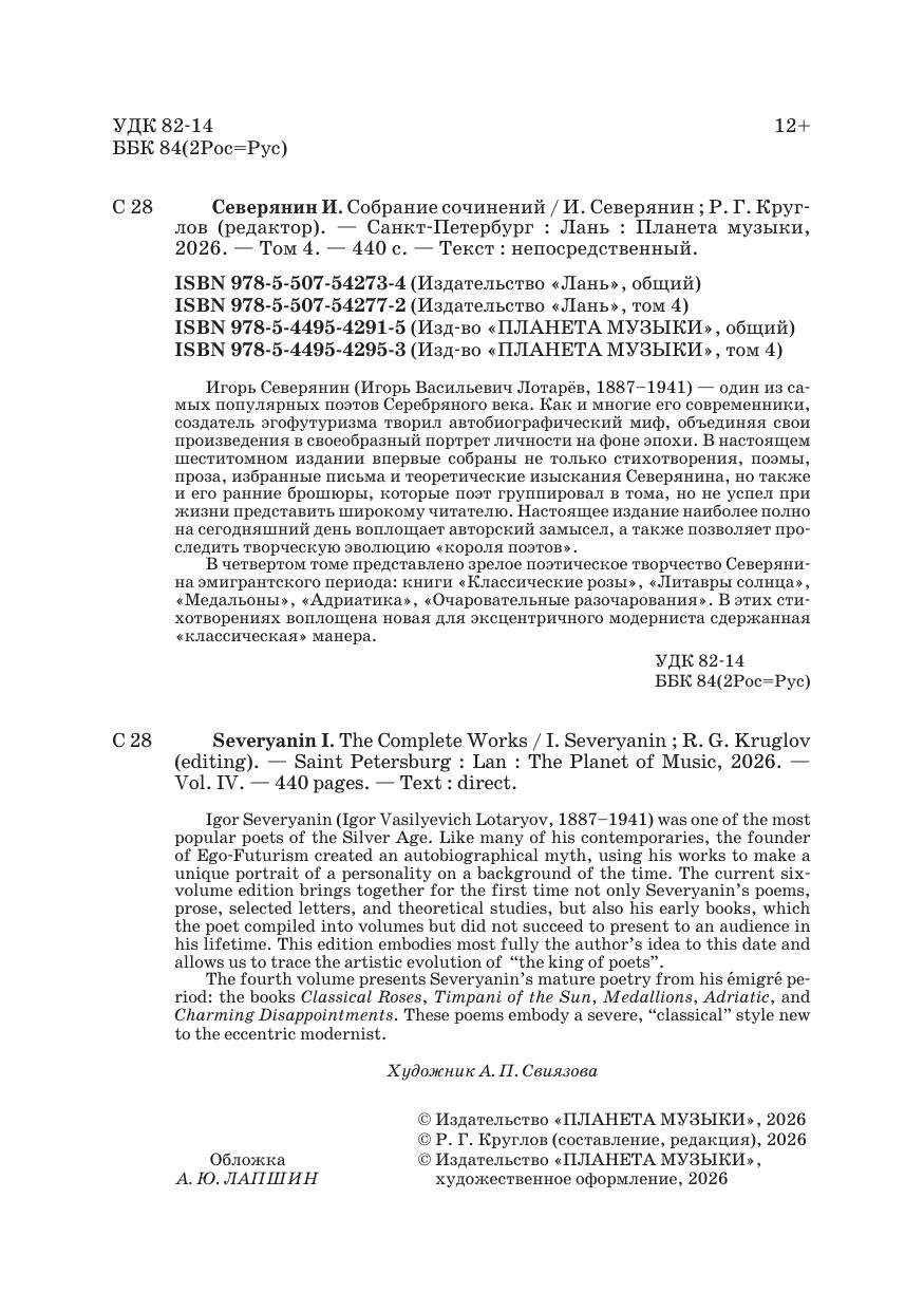 Игорь Северянин (Игорь Васильевич Лотарёв, 1887–1941) — один из самых популярных поэтов Серебряного века. Как и многие его современники, создатель эгофутуризма творил автобиографический миф, объединяя свои произведения в своеобразный портрет личности на фоне эпохи. В настоящем шеститомном издании впервые собраны не только стихотворения, поэмы, проза, избранные письма и теоретические изыскания Северянина, но также и его ранние брошюры, которые поэт группировал в тома, но не успел при жизни представить широкому читателю. Настоящее издание наиболее полно на сегодняшний день воплощает авторский замысел, а также позволяет проследить творческую эволюцию «короля поэтов». В четвертом томе представлено зрелое поэтическое творчество Северянина эмигрантского периода: книги «Классические розы», «Литавры солнца», «Медальоны», «Адриатика», «Очаровательные разочарования». В этих стихотворениях воплощена новая для эксцентричного модерниста сдержанная «классическая» манера. Igor Severyanin (Igor Vasilyevich Lotaryov, 1887–1941) was one of the most popular poets of the Silver Age. Like many of his contemporaries, the founder of Ego-Futurism created an autobiographical myth, using his works to make a unique portrait of a personality on a background of the time. The current six-volume edition brings together for the first time not only Severyanin’s poems, prose, selected letters, and theoretical studies, but also his early books, which the poet compiled into volumes but did not succeed to present to an audience in his lifetime. This edition embodies most fully the author’s idea to this date and allows us to trace the artistic evolution of “the king of poets”. The fourth volume presents Severyanin’s mature poetry from his émigré period: the books Classical Roses, Timpani of the Sun, Medallions, Adriatic, and Charming Disappointments. These poems embody a severe, “classical” style new to the eccentric modernist.