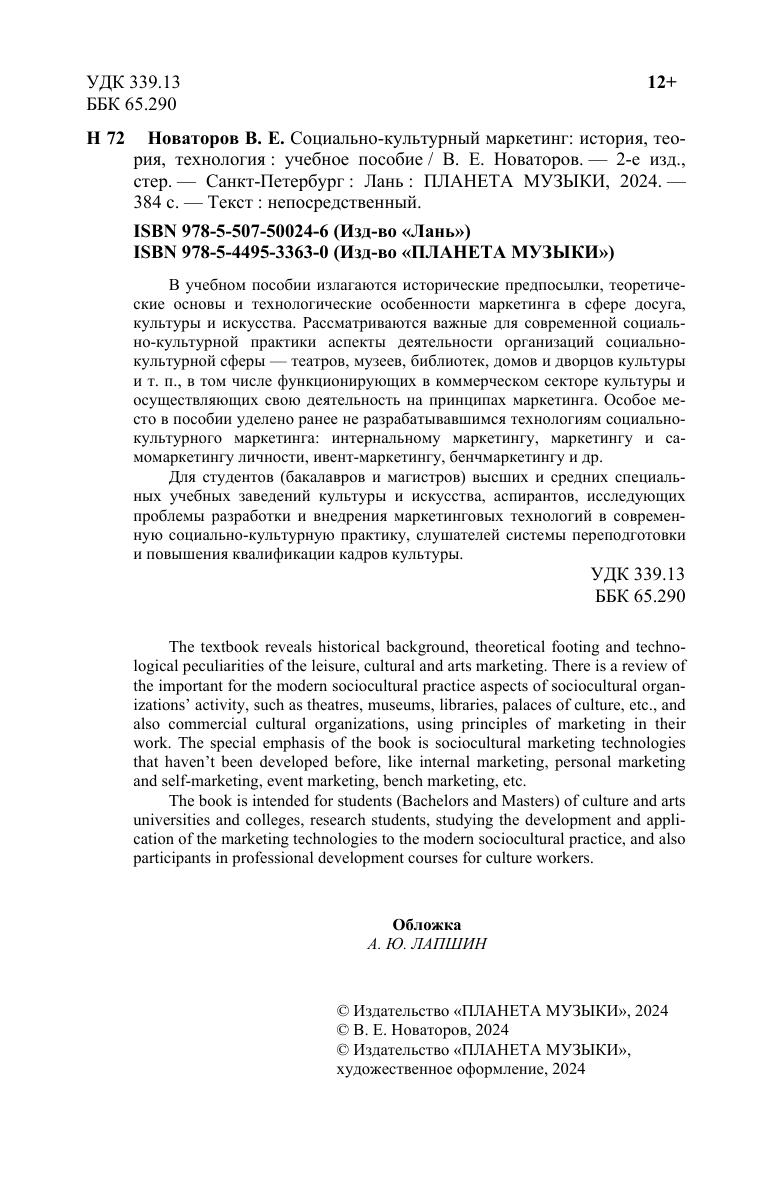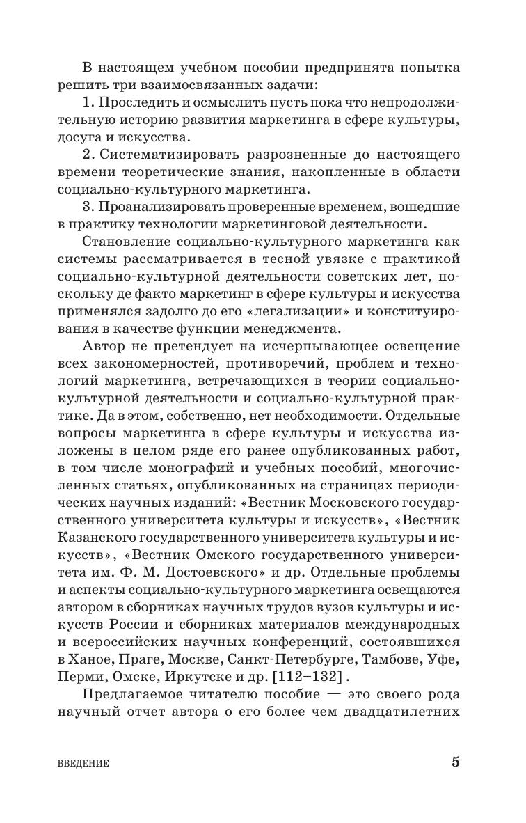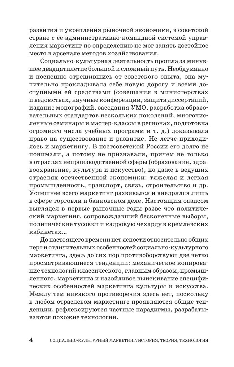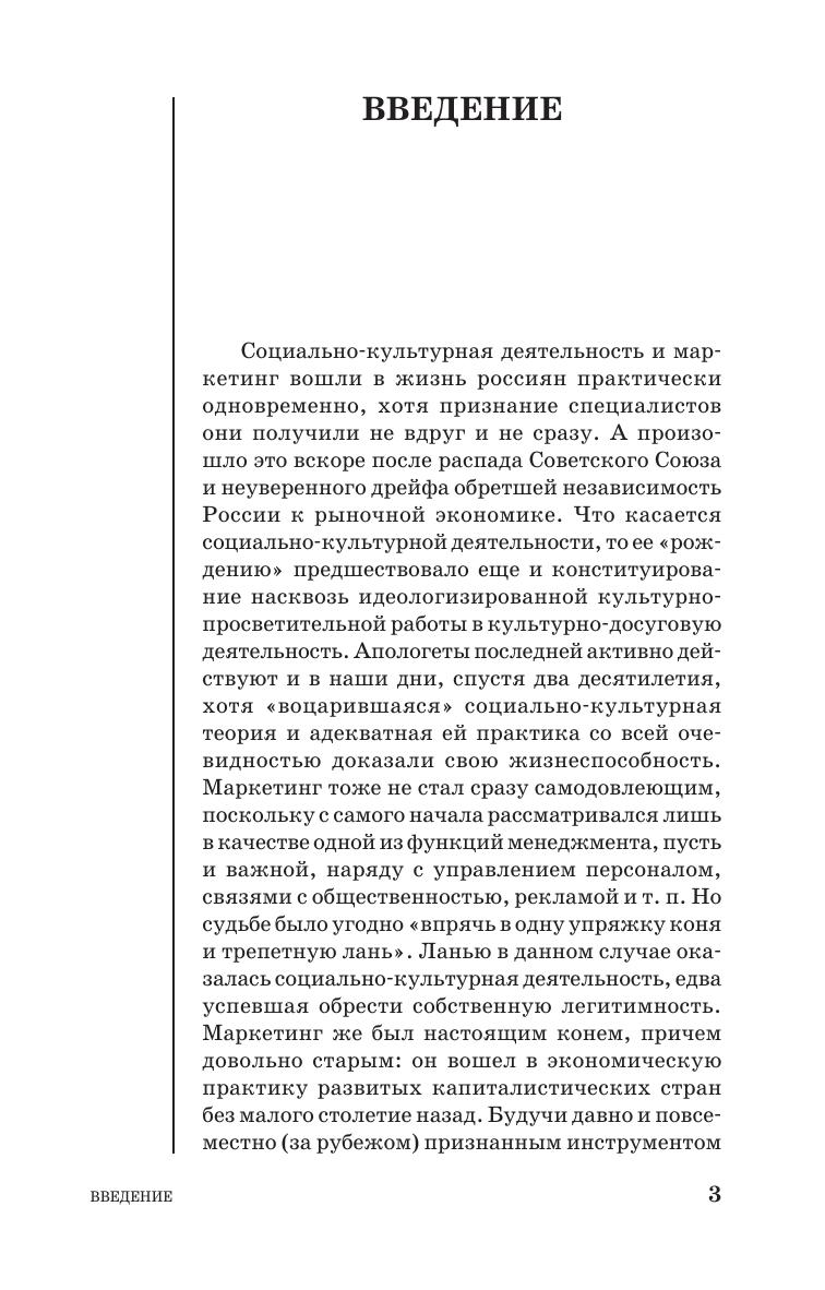 В учебном пособии излагаются исторические предпосылки, теоретические основы и технологические особенности маркетинга в сфере досуга, культуры и искусства. Рассматриваются важные для современной социально-культурной практики аспекты деятельности организаций социально-культурной сферы - театров, музеев, библиотек, домов и дворцов культуры и т.п., в том числе функционирующих в коммерческом секторе культуры и осуществляющих свою деятельность на принципах маркетинга. Особое место в пособии уделено ранее не разрабатывавшимся технологиям социально-культурного маркетинга: интернальному маркетингу, маркетингу и самомаркетингу личности, ивент-маркетингу, бенчмаркетингу и др. Для студентов (бакалавров и магистров) высших и средних специальных учебных заведений культуры и искусства, аспирантов, исследующих проблемы разработки и внедрения маркетинговых технологий в современную социально-культурную практику, слушателей системы переподготовки и повышения квалификации кадров культуры.