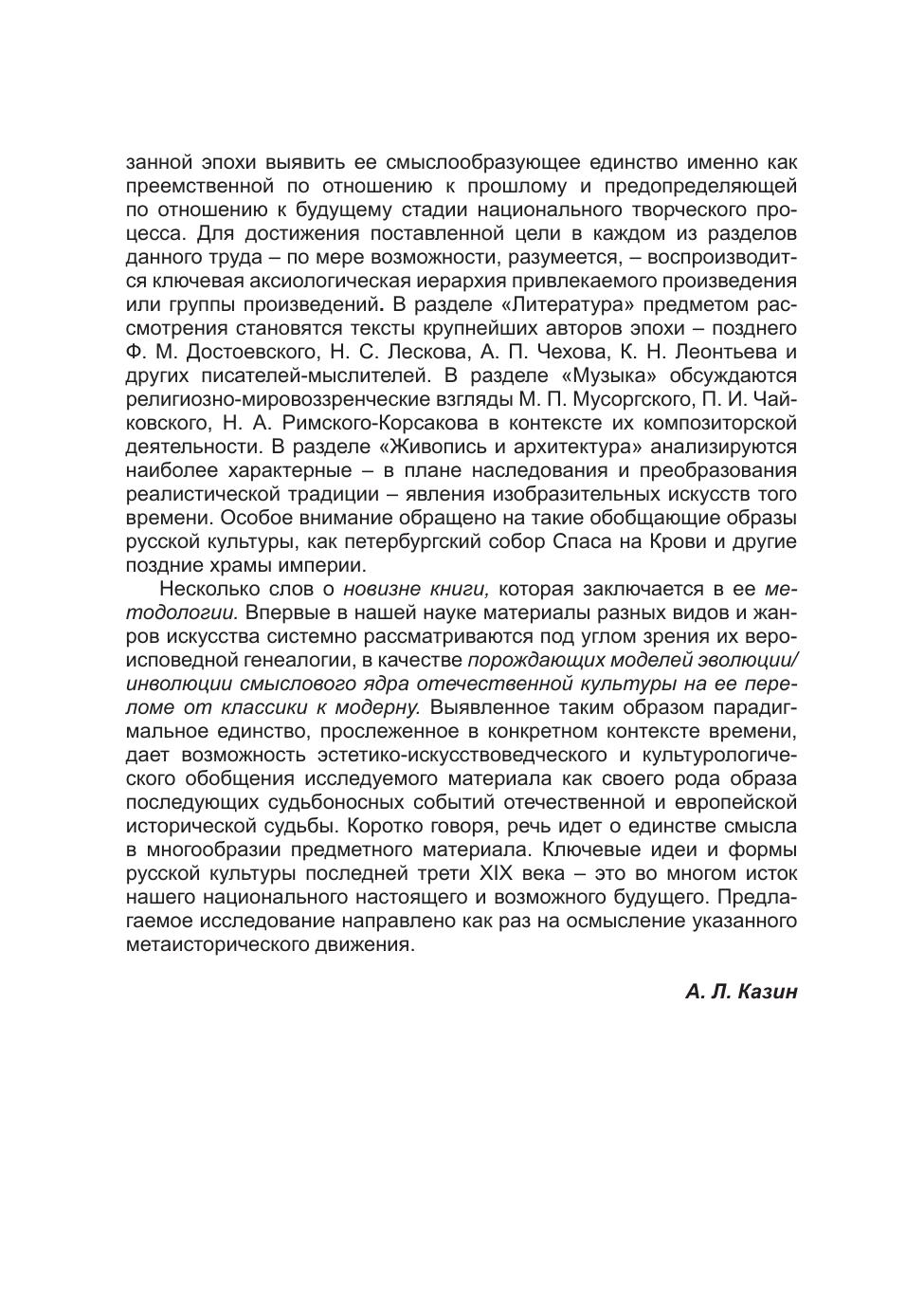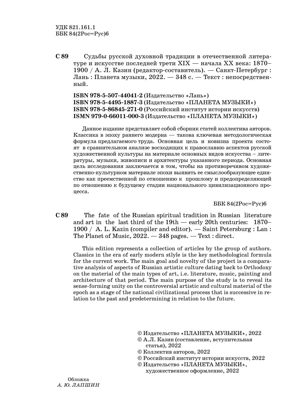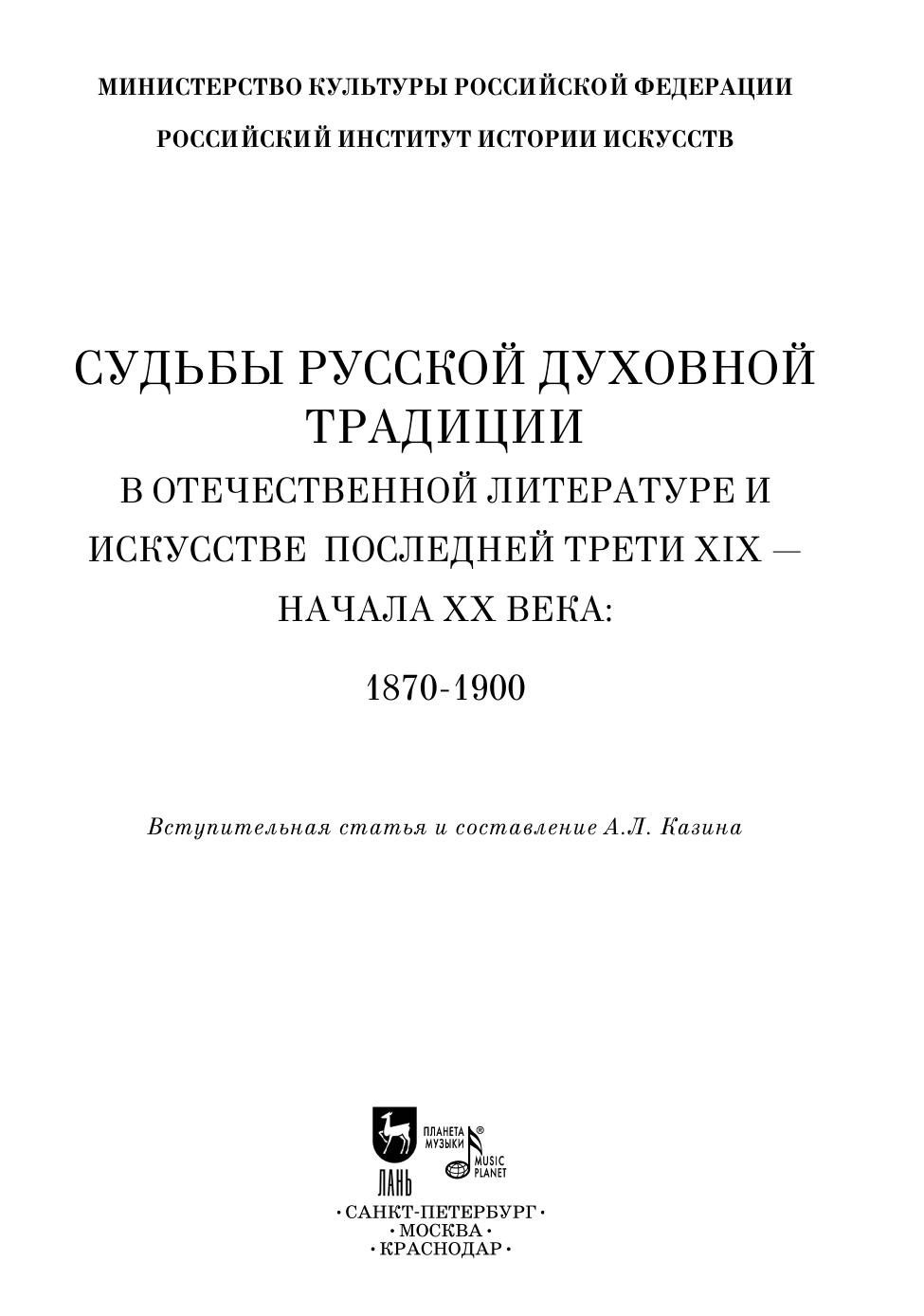 В качестве продолжения указанного издания авторский коллектив под руководством проф. А. Л. Казина предлагает сборник статей «Судьбы русской духовной традиции в отечественной литературе и искусстве. 1870–1900 годы».