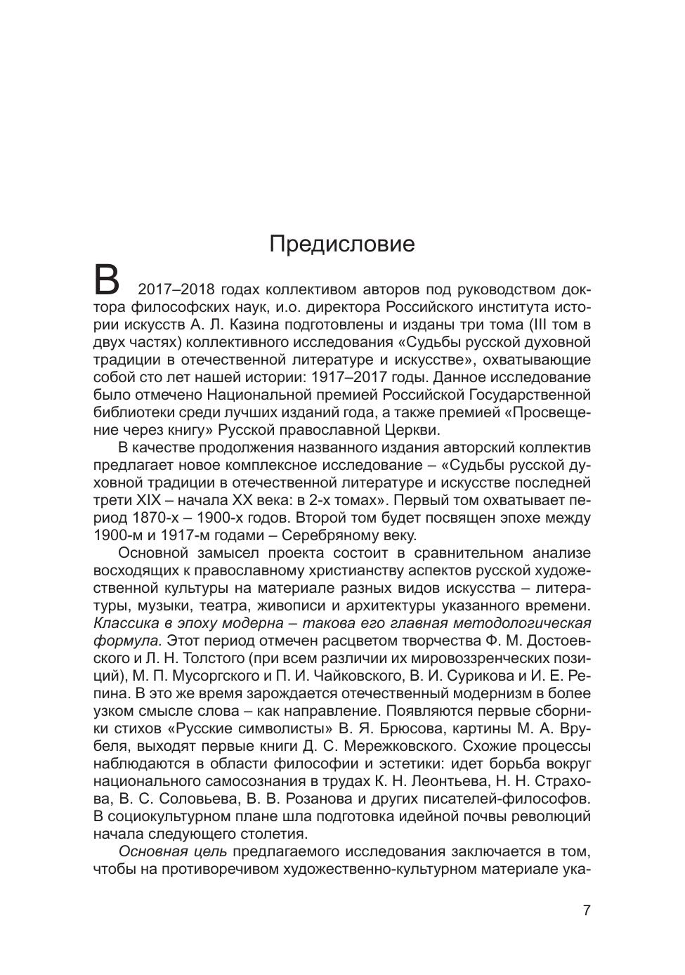 Классика в эпоху раннего модерна – такова ключевая методологическая формула предлагаемого труда. Основная цель и новизна проекта состоят в сравнительном анализе восходящих к православию аспектов русской художественной культуры на материале основных видов искусства – литературы, музыки, живописи и архитектуры указанного периода. Период 1870–1900-х гг. в России отмечен расцветом творчества Ф. М. Достоевского и Л. Н. Толстого (при всем различии их мировоззренческих позиций), М. П. Мусоргского и П. И. Чайковского, И. Е. Репина и В. И. Сурикова. В это же время зарождается отечественный модернизм как идейно-художественное направление. Появляются сборники стихов «Русские символисты» В. Я. Брюсова, звучит музыка А. Н. Скрябина, выходят первые книги Д. С. Мережковского. Схожие процессы наблюдаются в области философии и культурологии. Идет борьба вокруг национального самосознания в трудах Н. Я. Данилевского, К. Н. Леонтьева, Н. Н. Страхова, В. С. Соловьева, В. В. Розанова и других писателей-мыслителей. Основная цель предлагаемого исследования заключается в том, чтобы на противоречивом художественно-культурном материале указанной эпохи выявить ее смыслообразующее единство как преемственной по отношению к прошлому и предопределяющей по отношению к будущему стадии национального цивилизационного процесса.