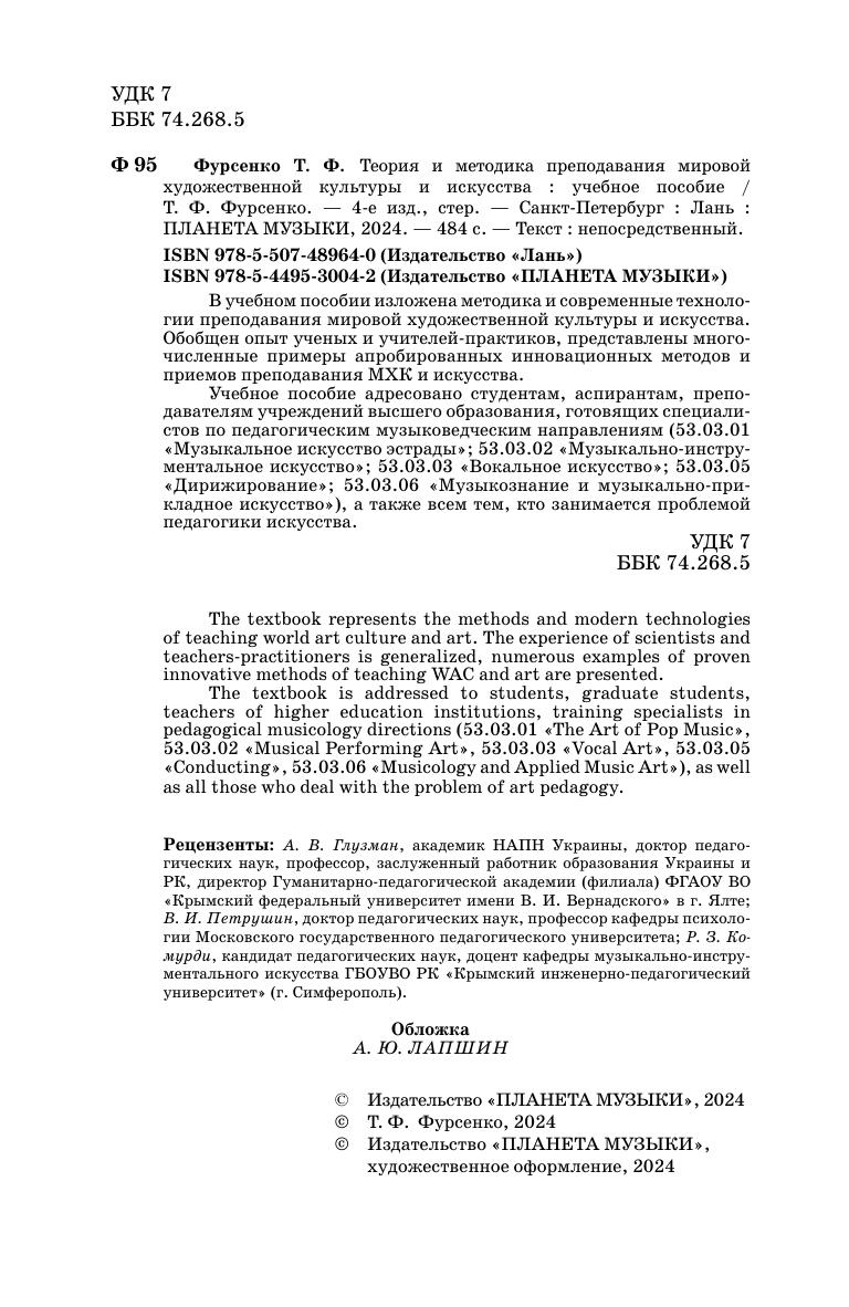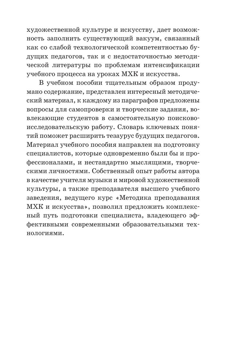 В учебном пособии изложена методика и современные технологии преподавания мировой художественной культуры и искусства. Обобщён опыт учёных и учителей-практиков, представлены многочисленные примеры апробированных инновационных методов и приёмов преподавания МХК и искусства. Учебное пособие адресовано студентам, аспирантам, преподавателям учреждений высшего образования, готовящих специалистов по педагогическим музыковедческим направлениям (53.03.01 «Музыкальное искусство эстрады», 53.03.02 «Музыкально-инструментальное искусство», 53.03.03 «Вокальное искусство», 53.03.05 «Дирижирование», 53.03.06 «Музыкознание и музыкально-прикладное искусство»), а также всем тем, кто занимается проблемой педагогики искусства.