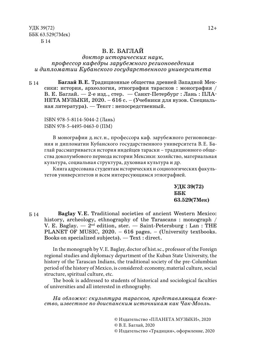 В монографии д. ист. н., профессора каф. зарубежного регионоведения и дипломатии Кубанского государственного университета В. Е. Баглай рассматривается история индейцев тараски — традиционного общества доколумбового периода истории Мексики: хозяйство, материальная культура, социальная структура, духовная культура и др.
